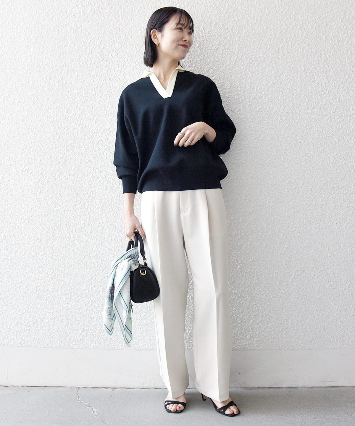 無地のオフホワイトとネイビーは、きれい目なパンツやロングスカートと合わせるとモードな雰囲気にも。