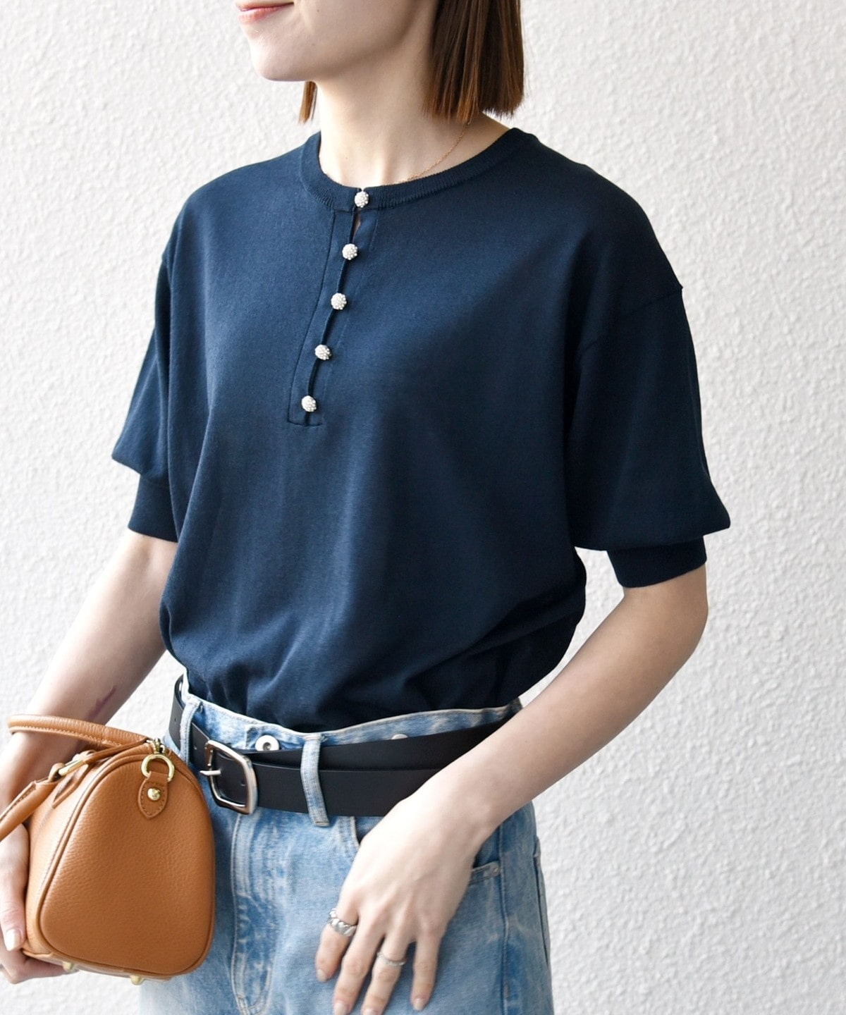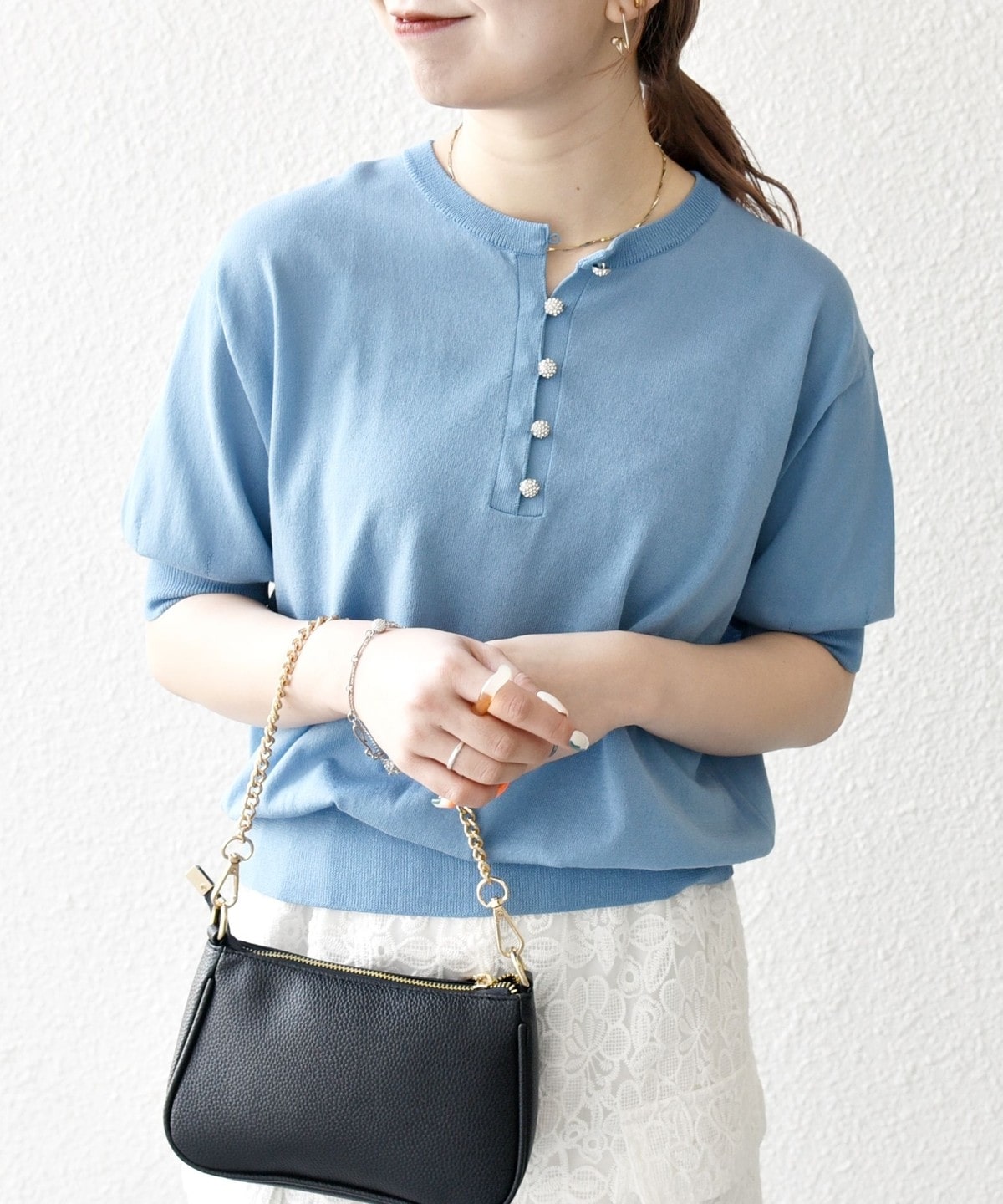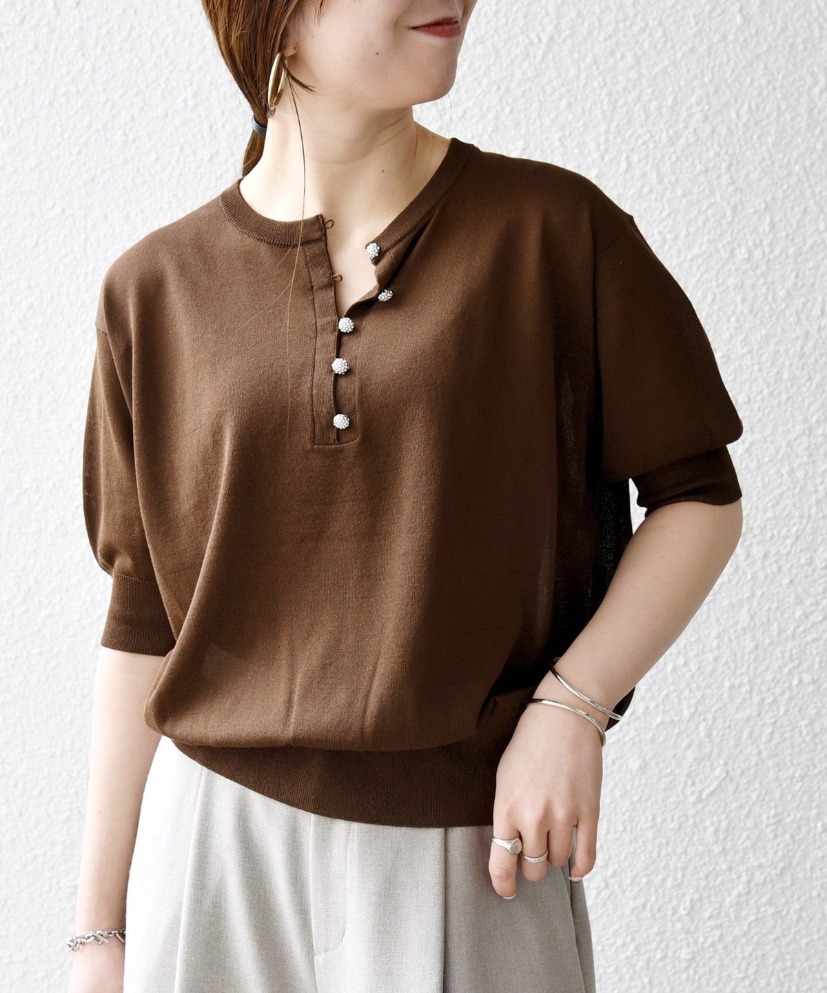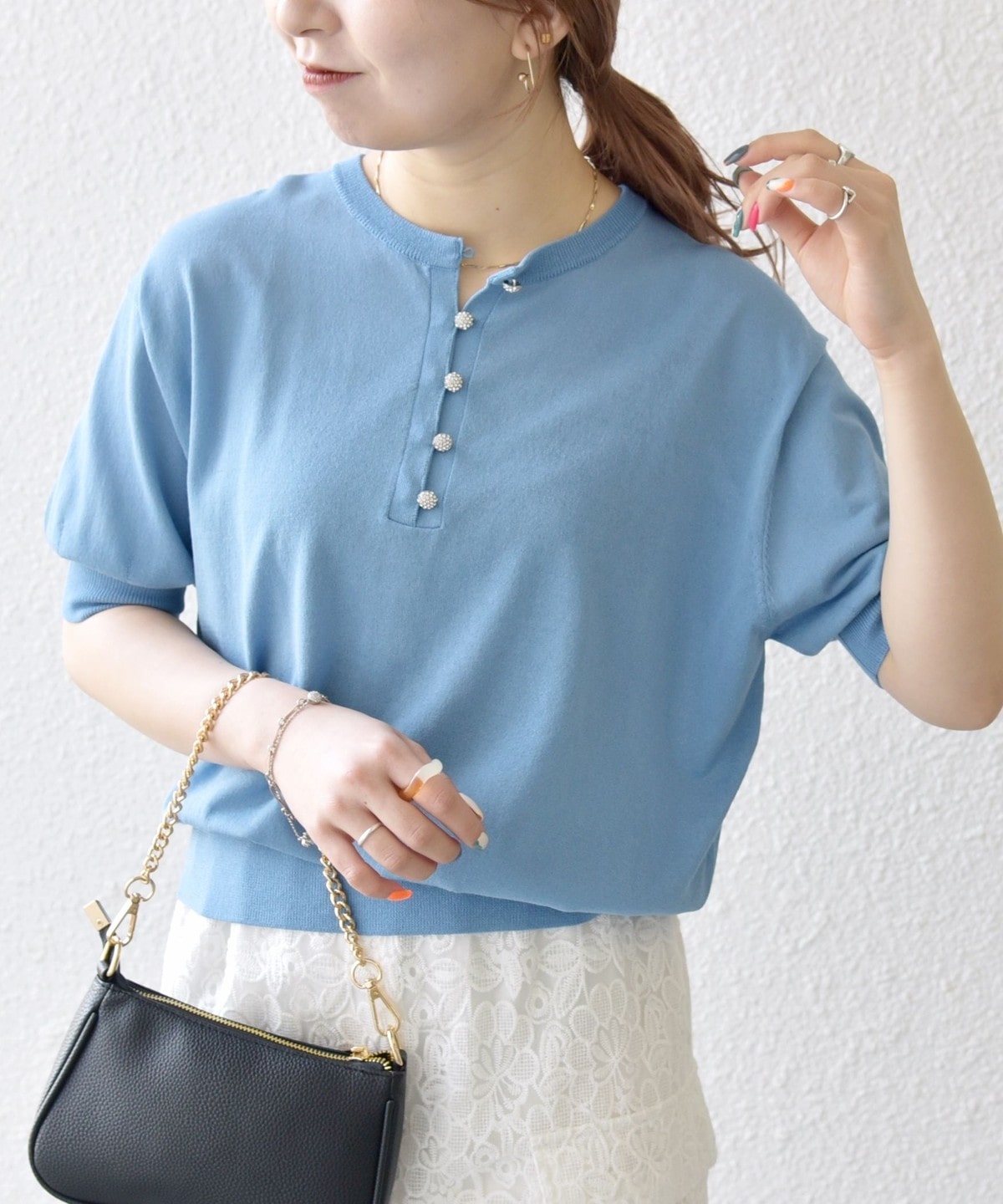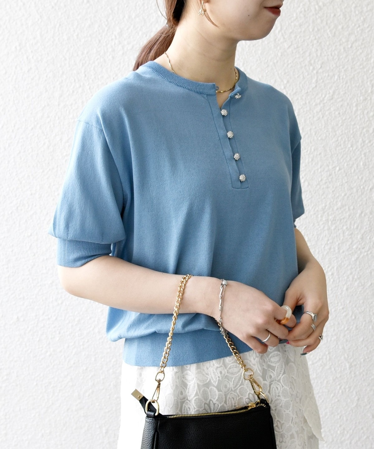 ヘンリーネックの首元にビジューをあしらった、着映えするサマーニット。