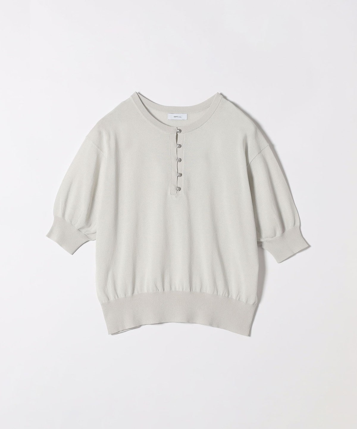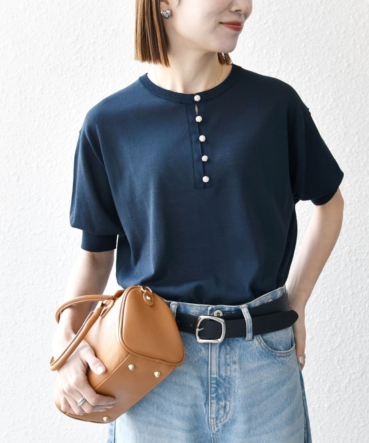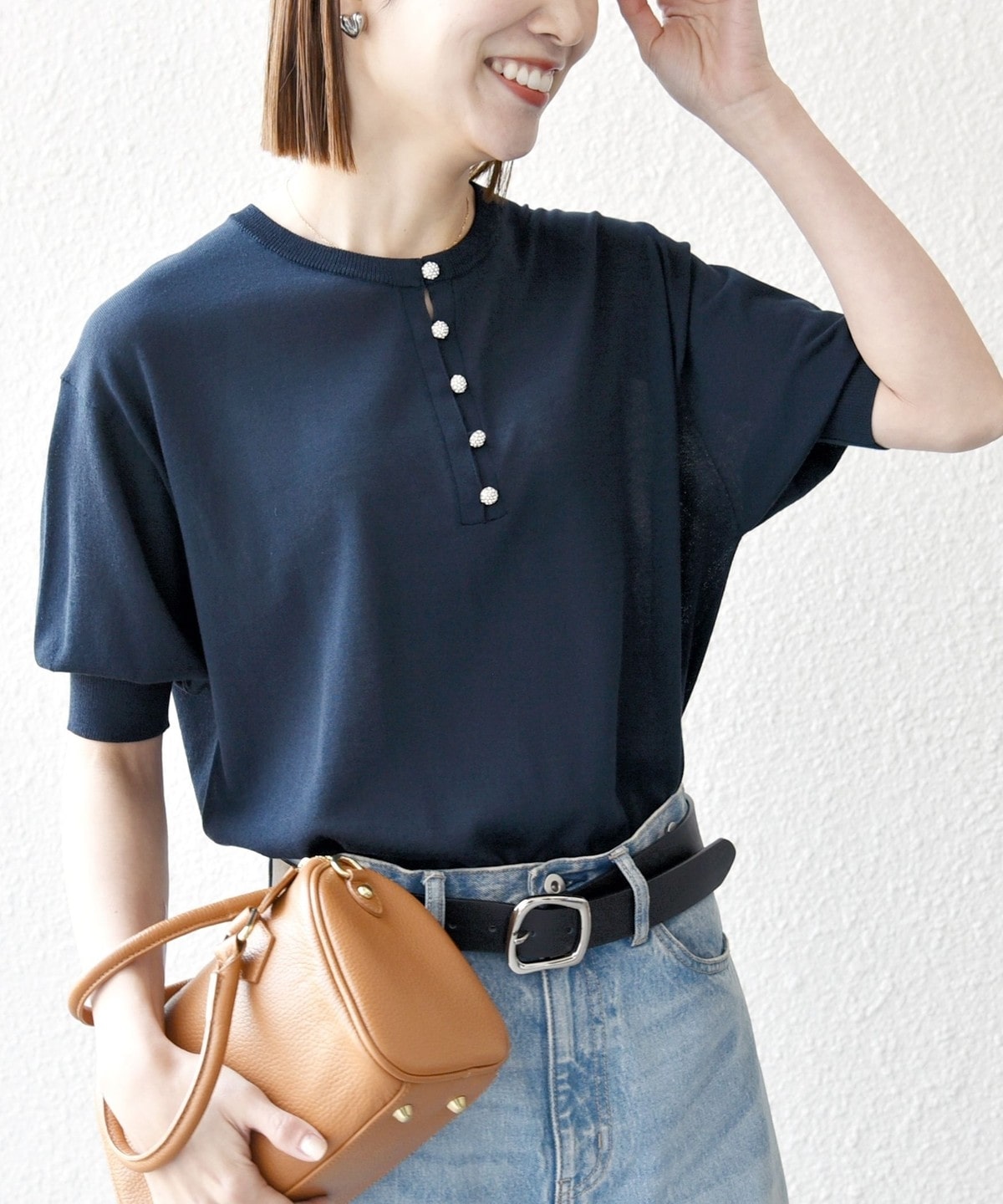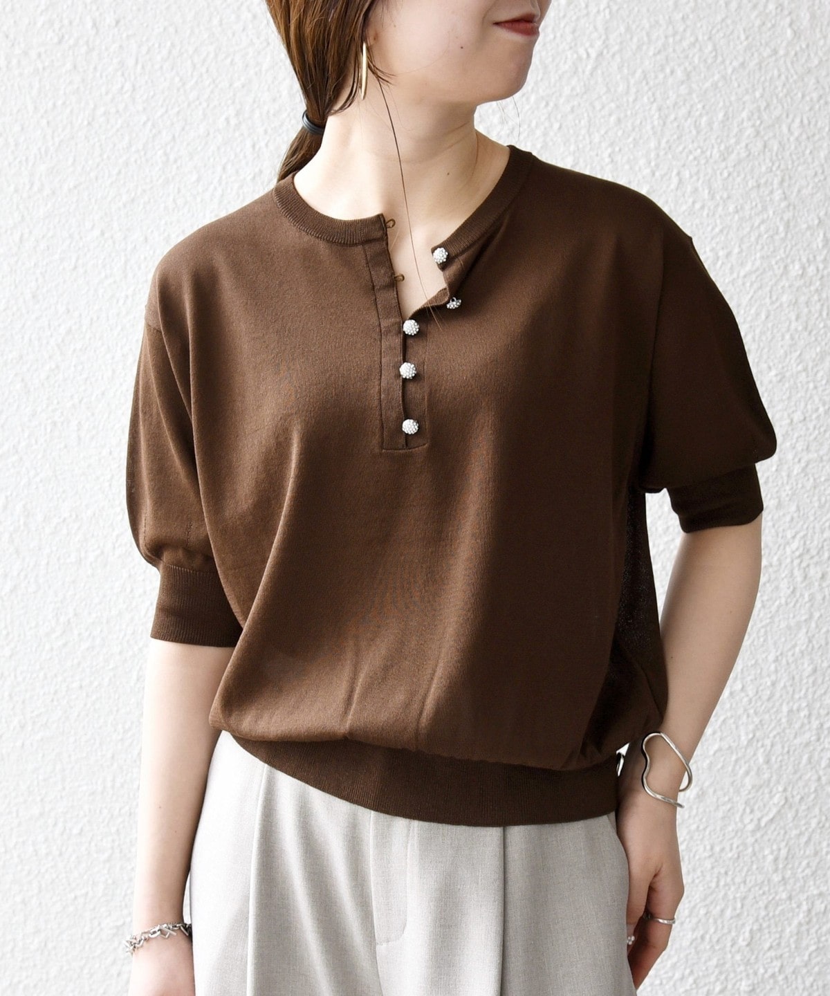 ヘンリーネックの首元にビジューをあしらった、着映えするサマーニット。