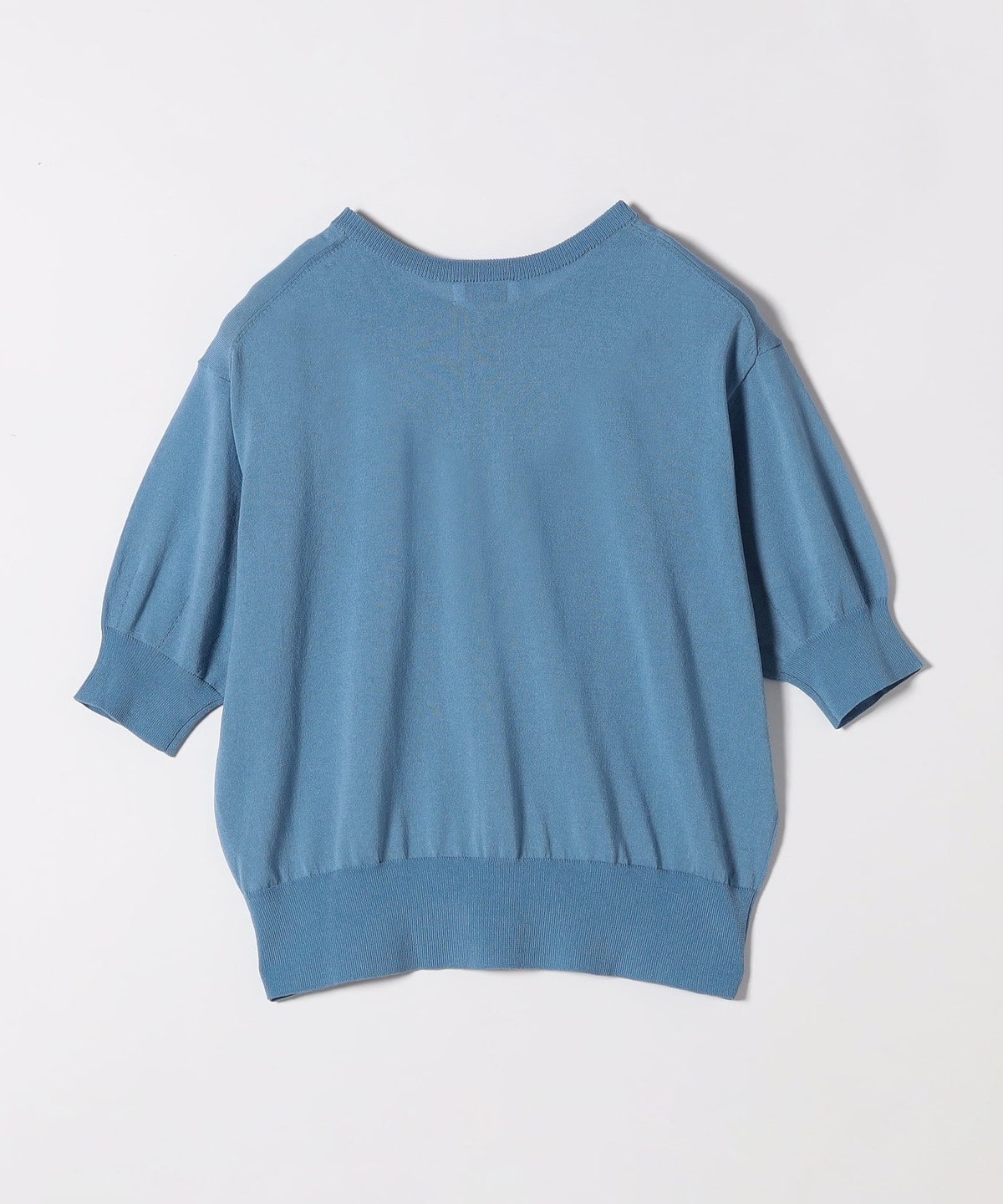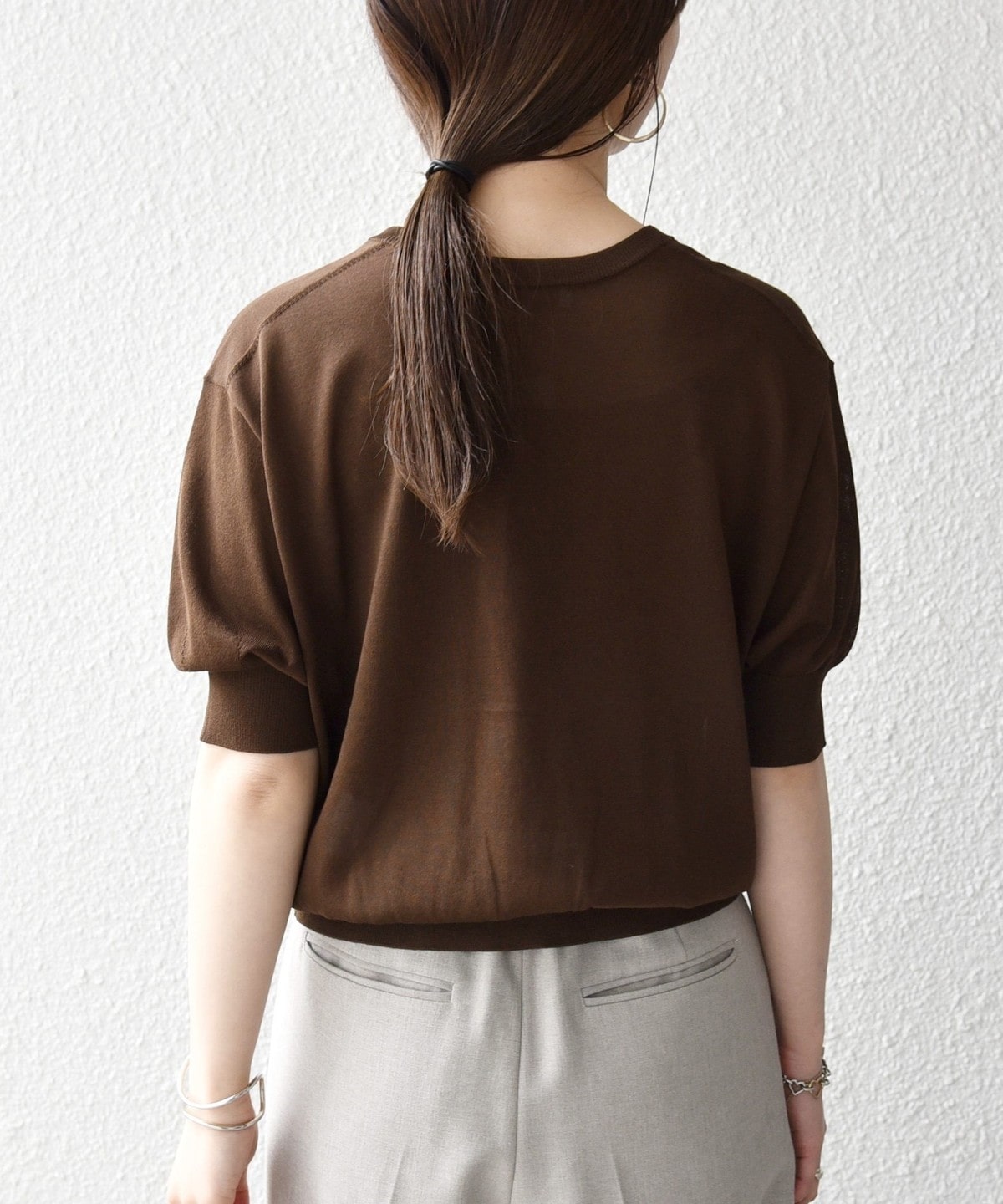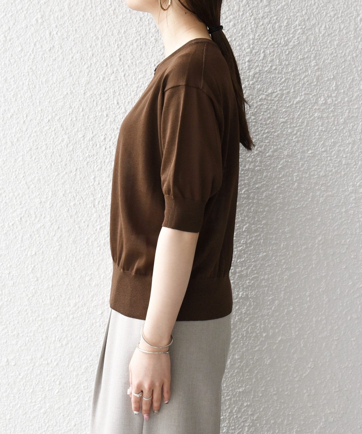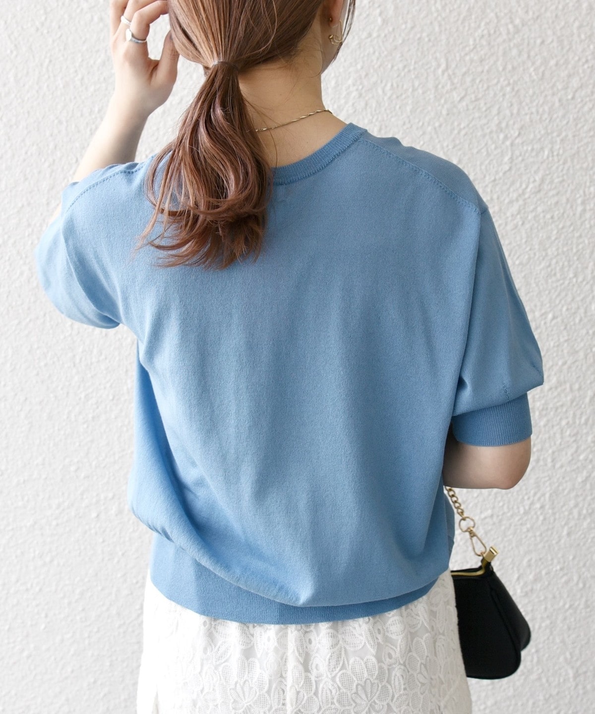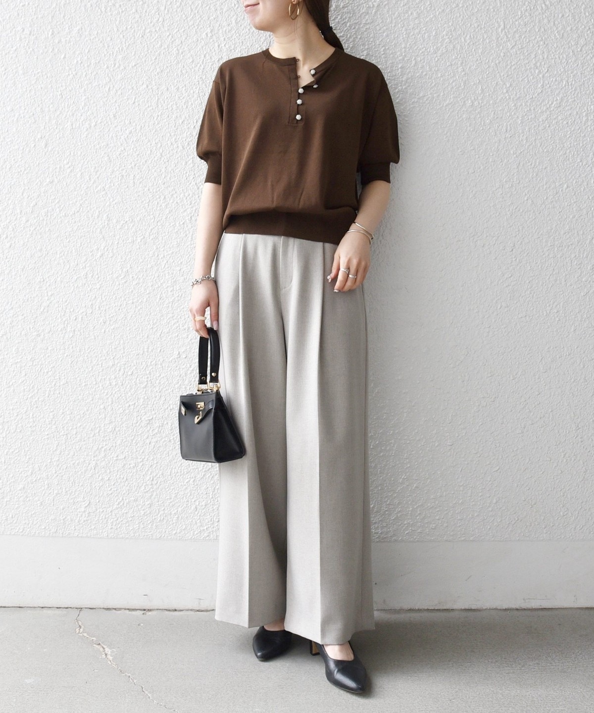 ヘンリーネックの首元にビジューをあしらった、着映えするサマーニット。