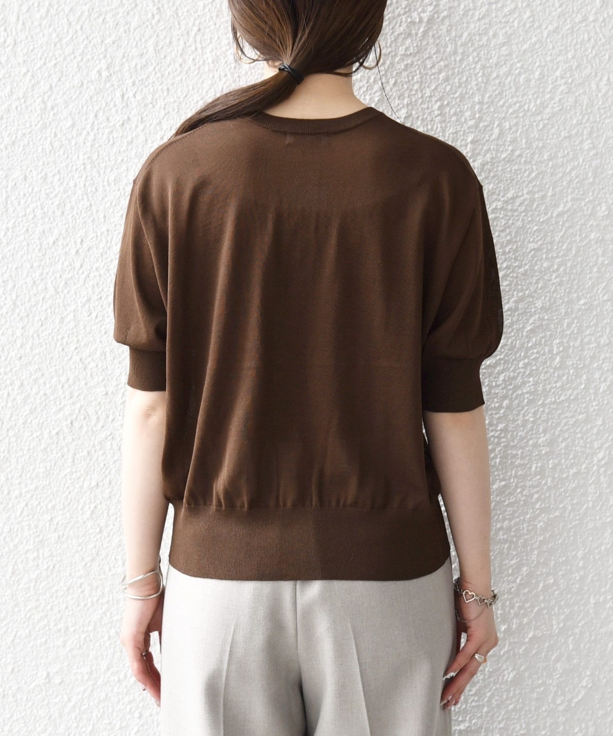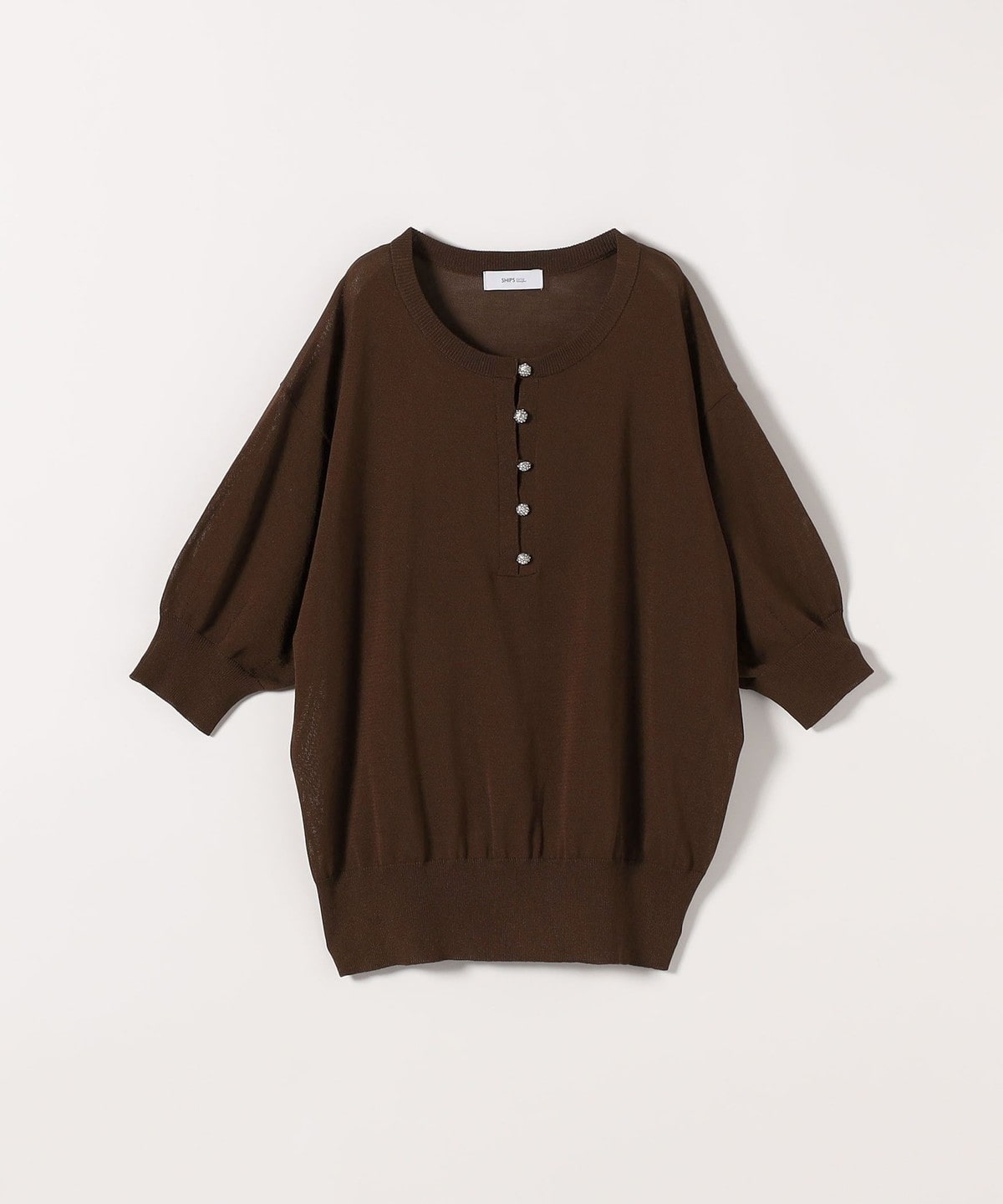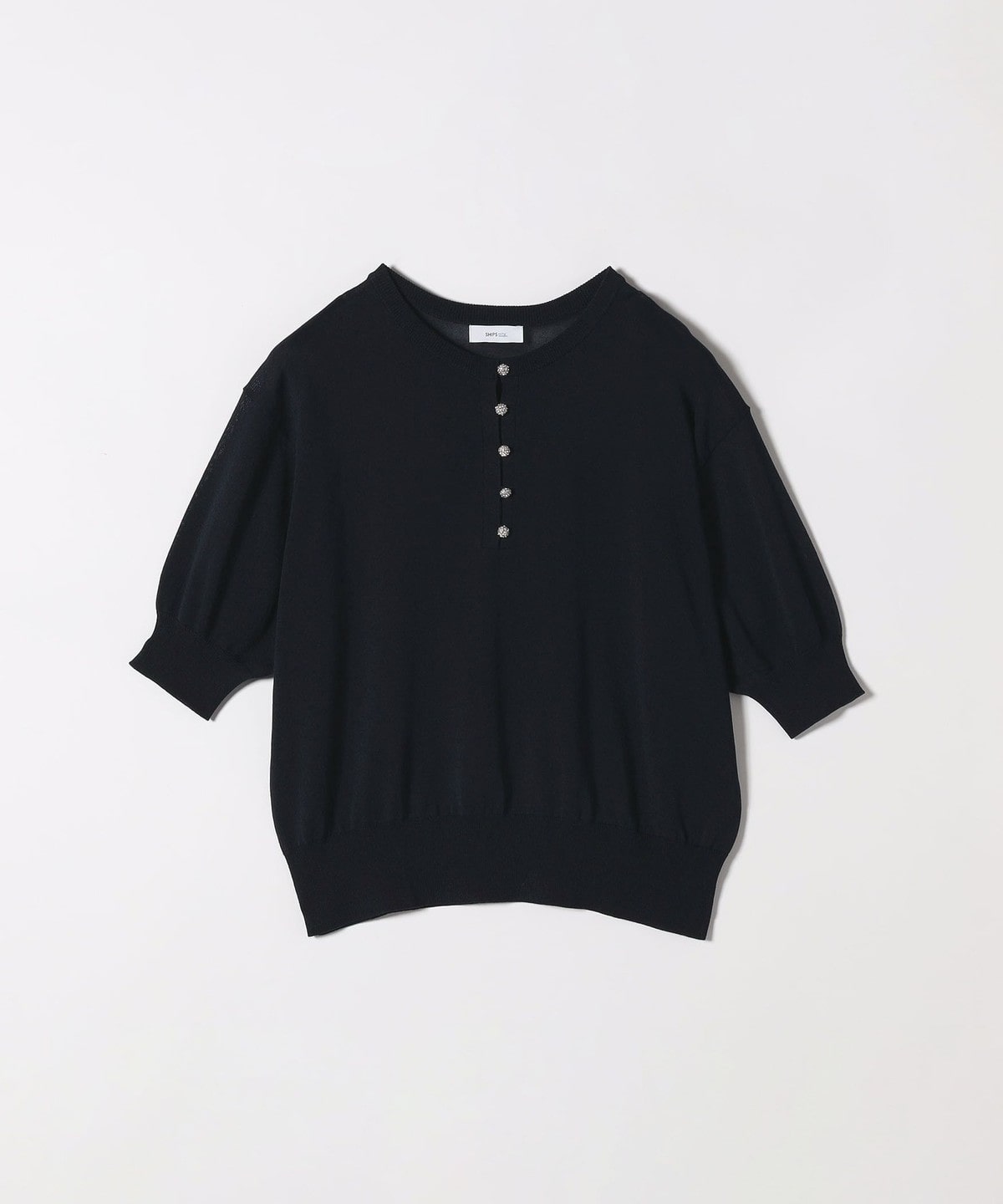 ヘンリーネックの首元にビジューをあしらった、着映えするサマーニット。