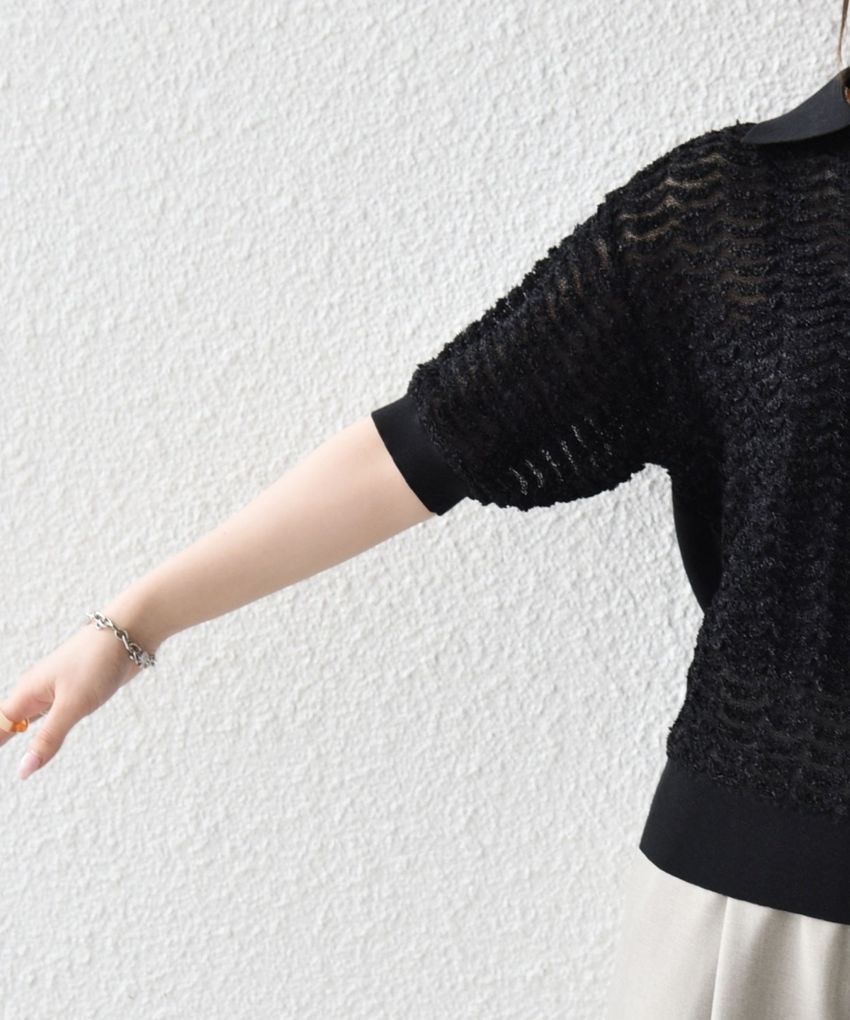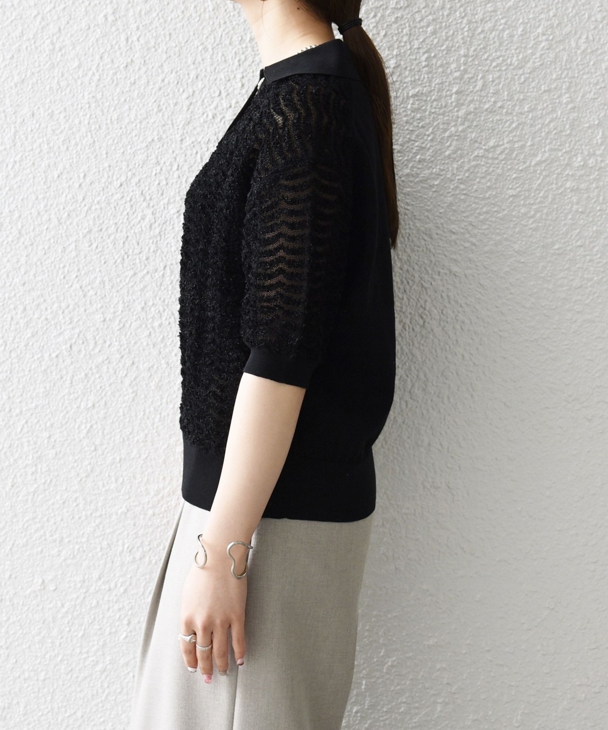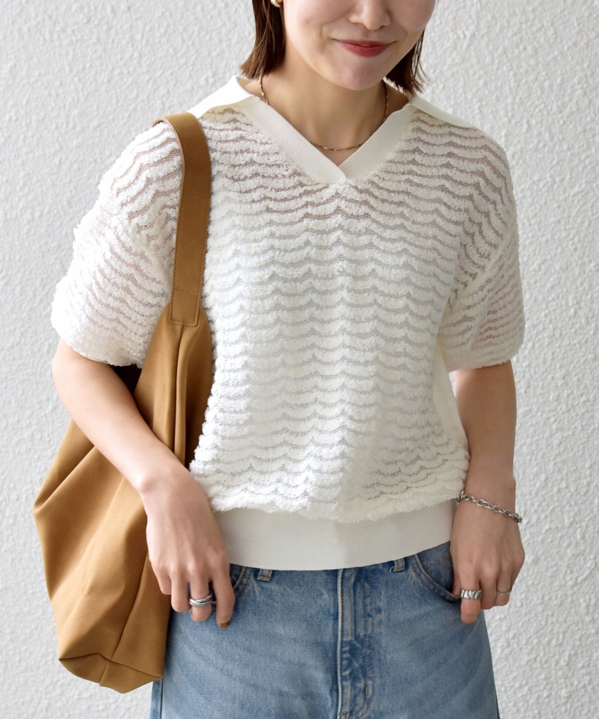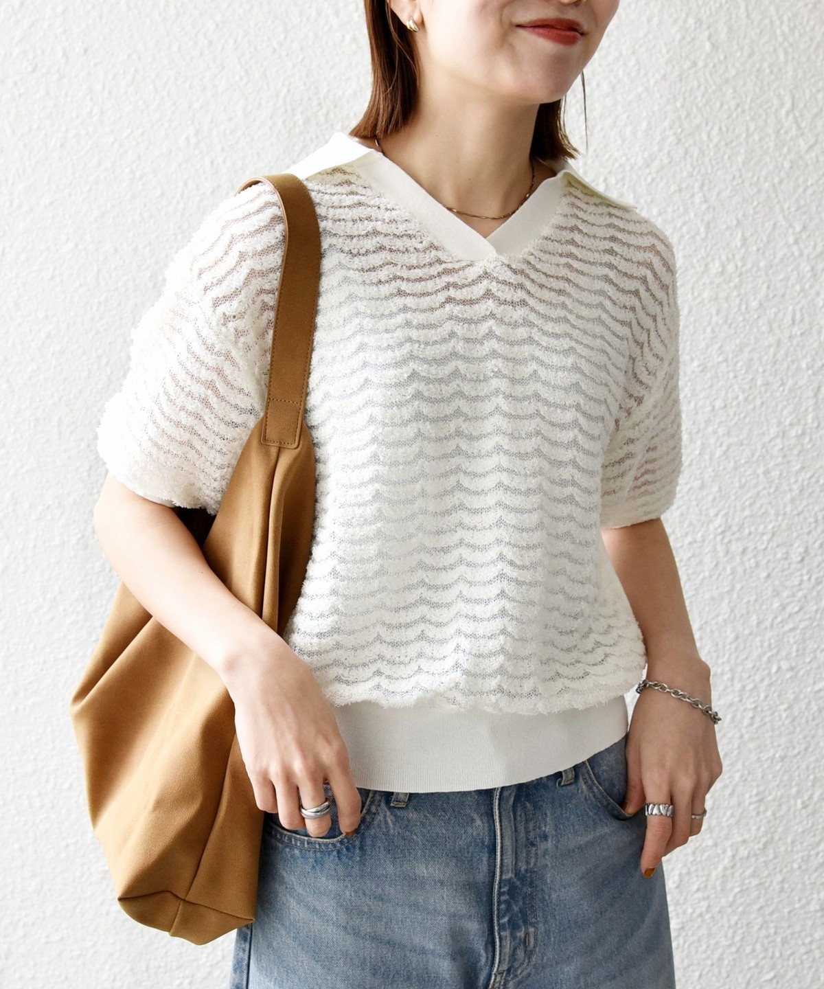《予約》SHIPS any:〈手洗い可能〉シアー ジャカード スキッパー ポロ ニット