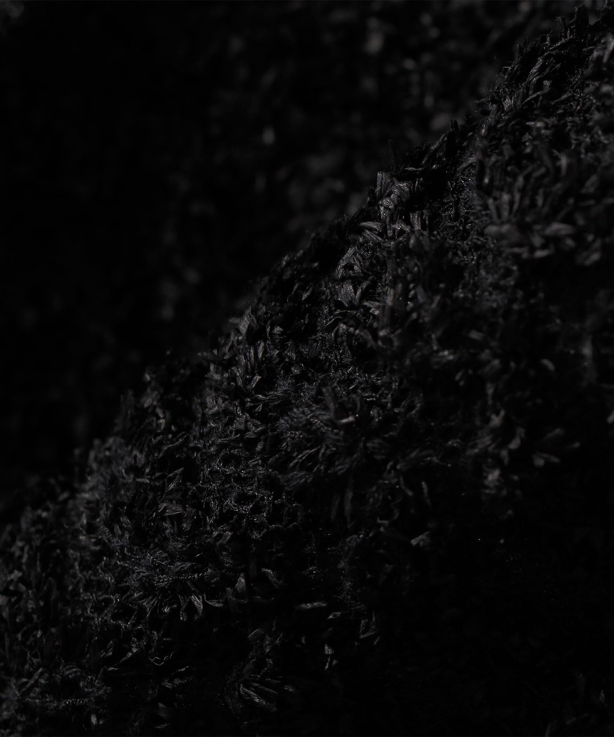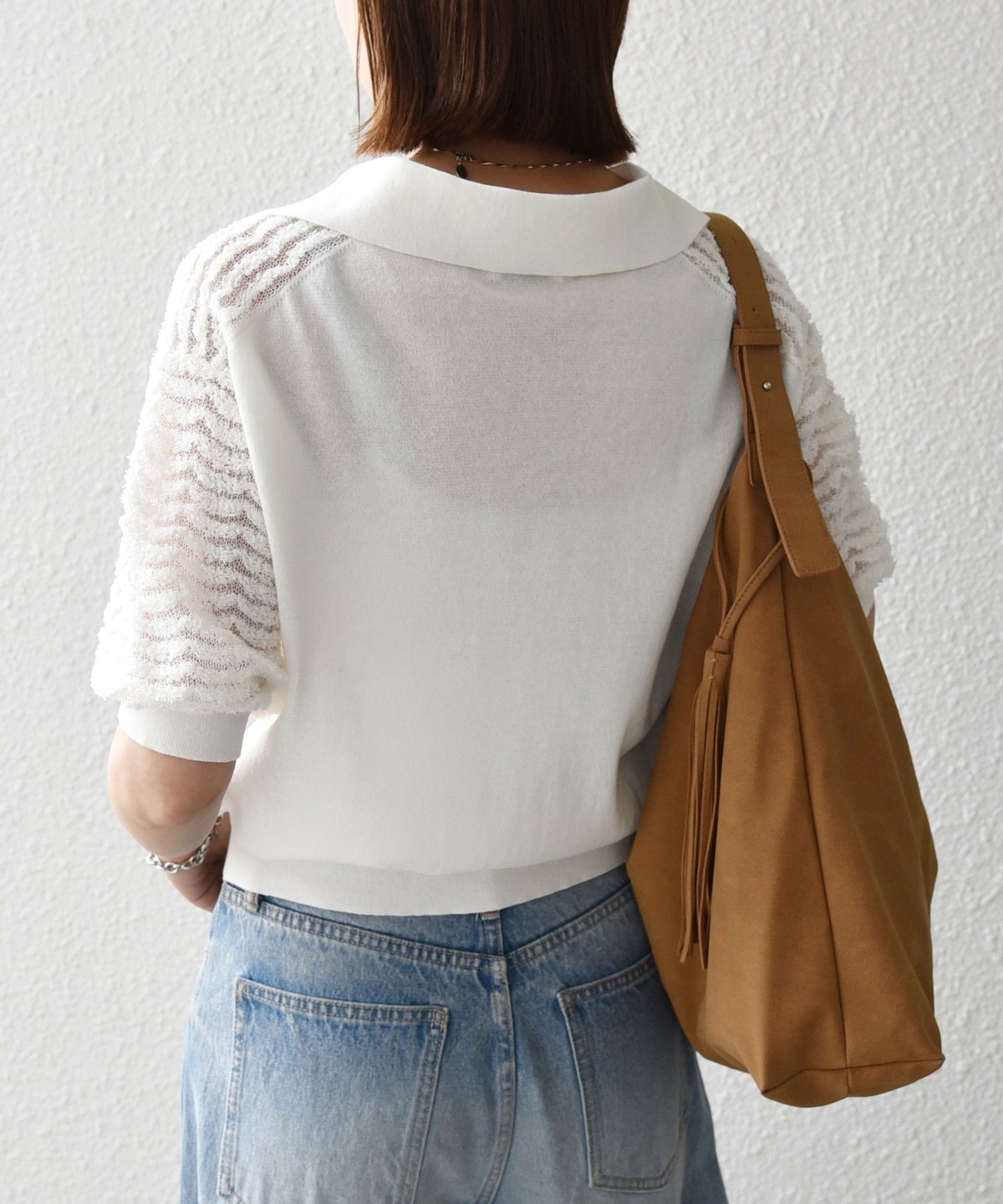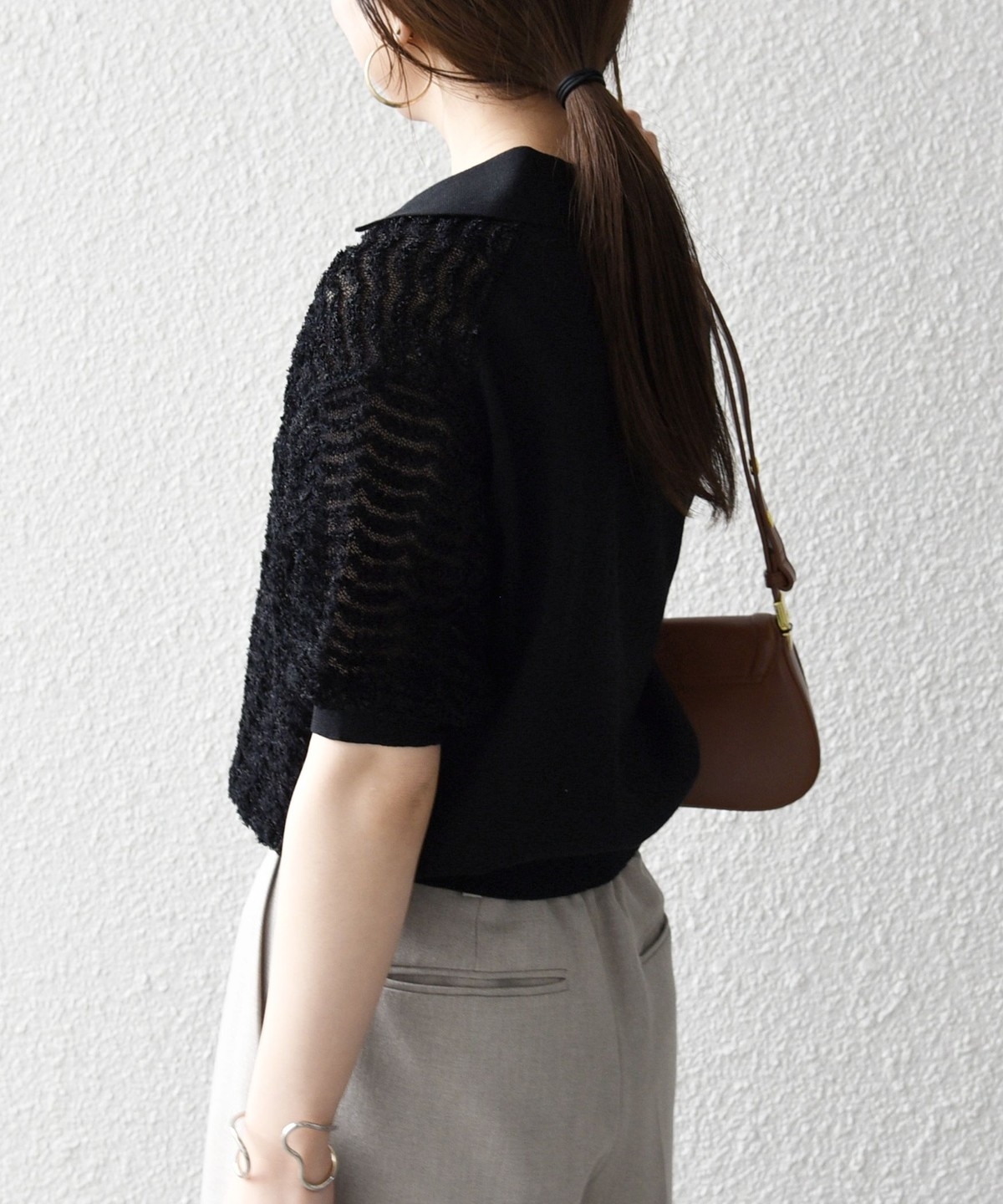 前身頃と袖にはペーパーフリンジを編み込んだ表情豊かな素材、後身頃や襟には滑らかなハイゲージニット素材を使用。