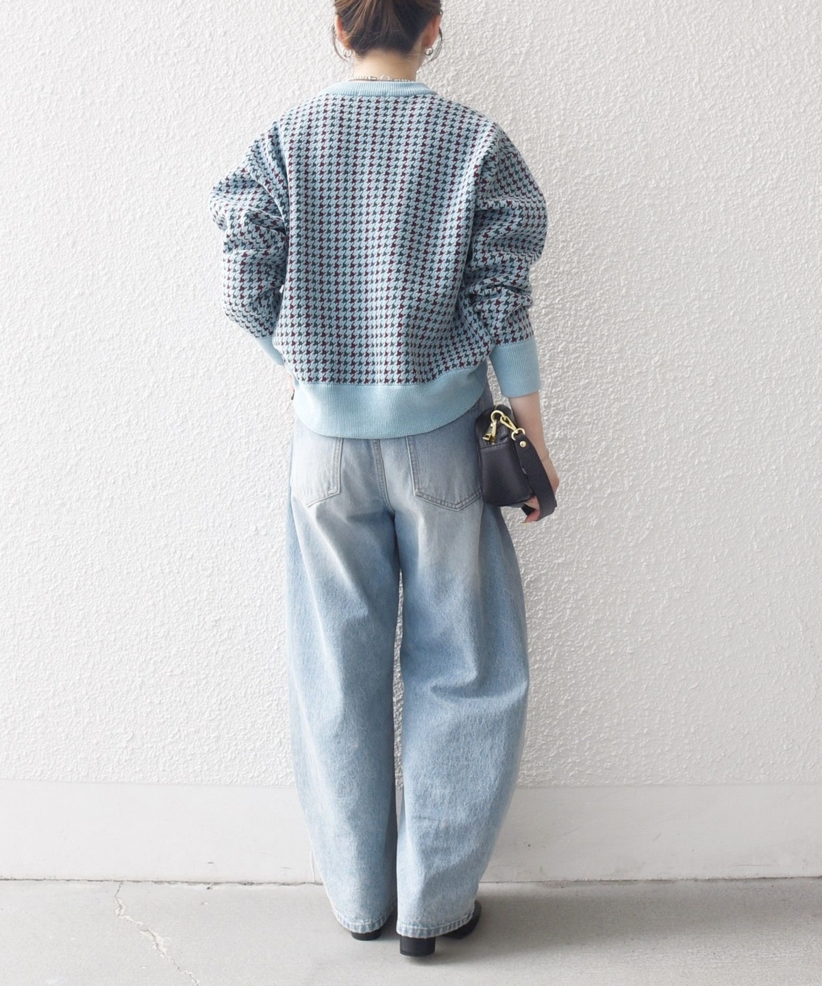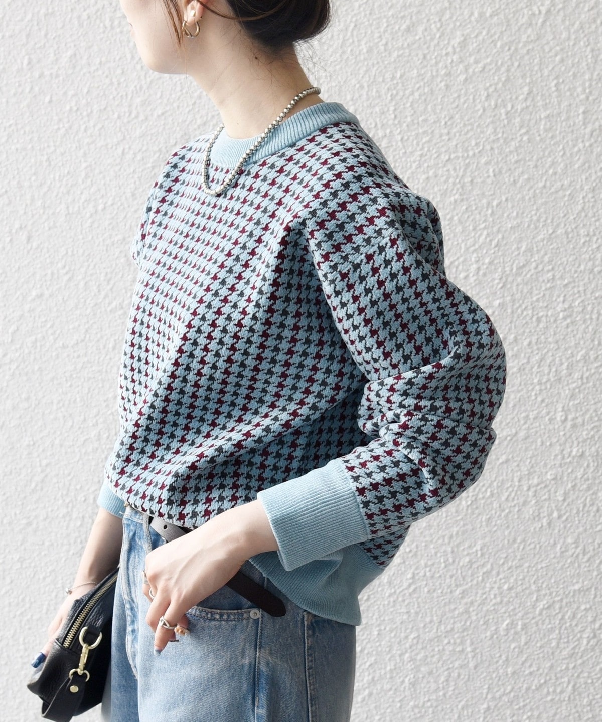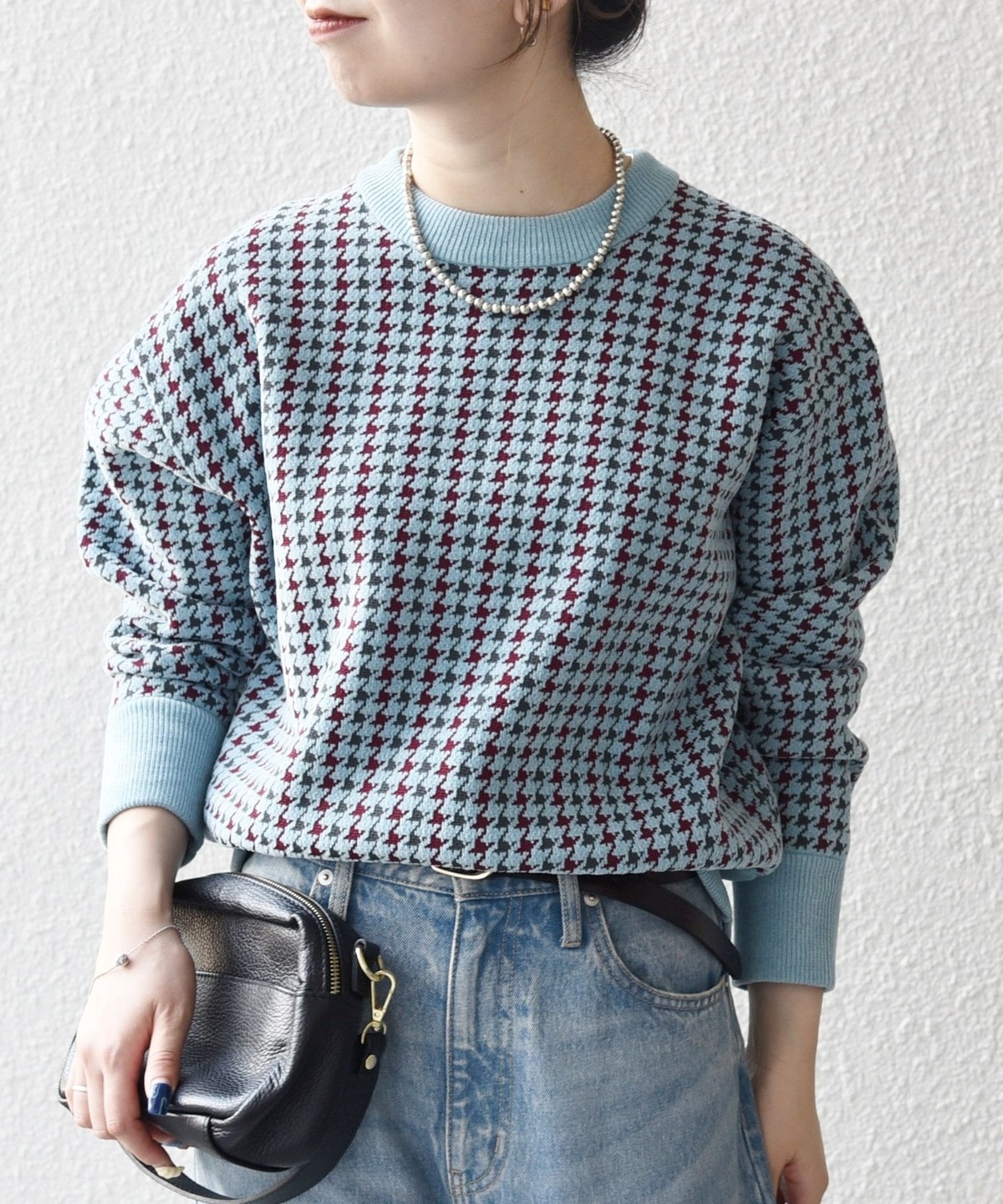 1. SHIPS any:〈手洗い可能〉モールヤーン クルーネック ロゴ 千鳥柄 プルオーバー ライトブルー