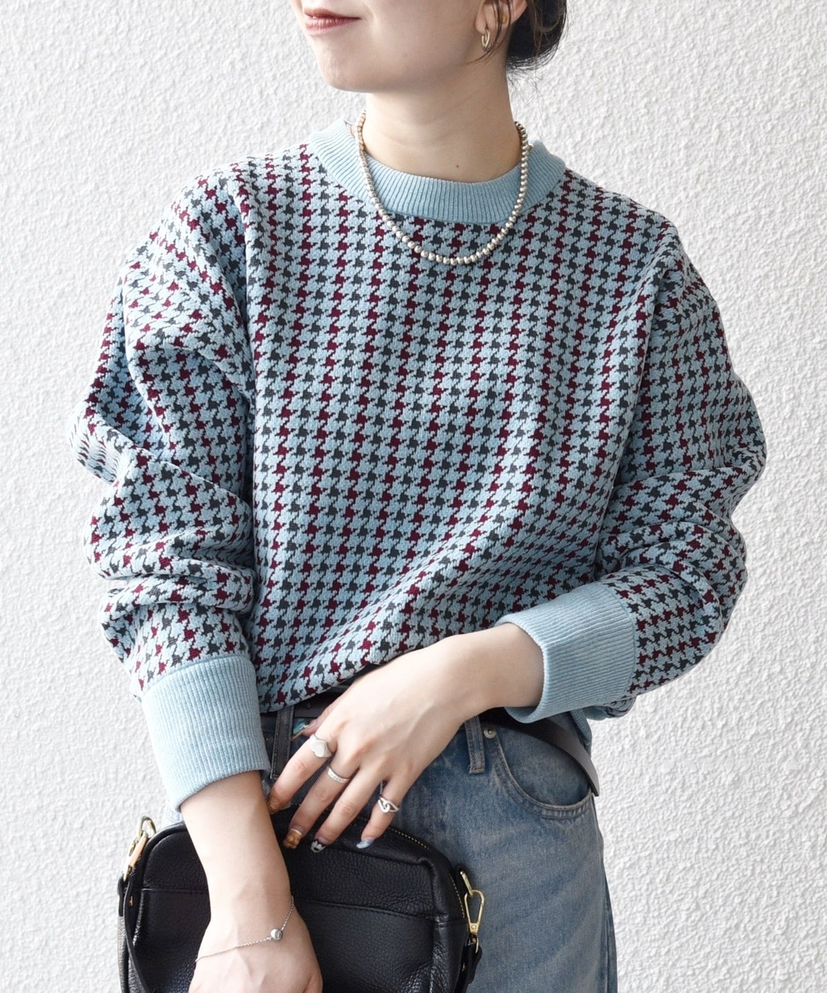 45. SHIPS any:〈手洗い可能〉モールヤーン クルーネック ロゴ 千鳥柄 プルオーバー