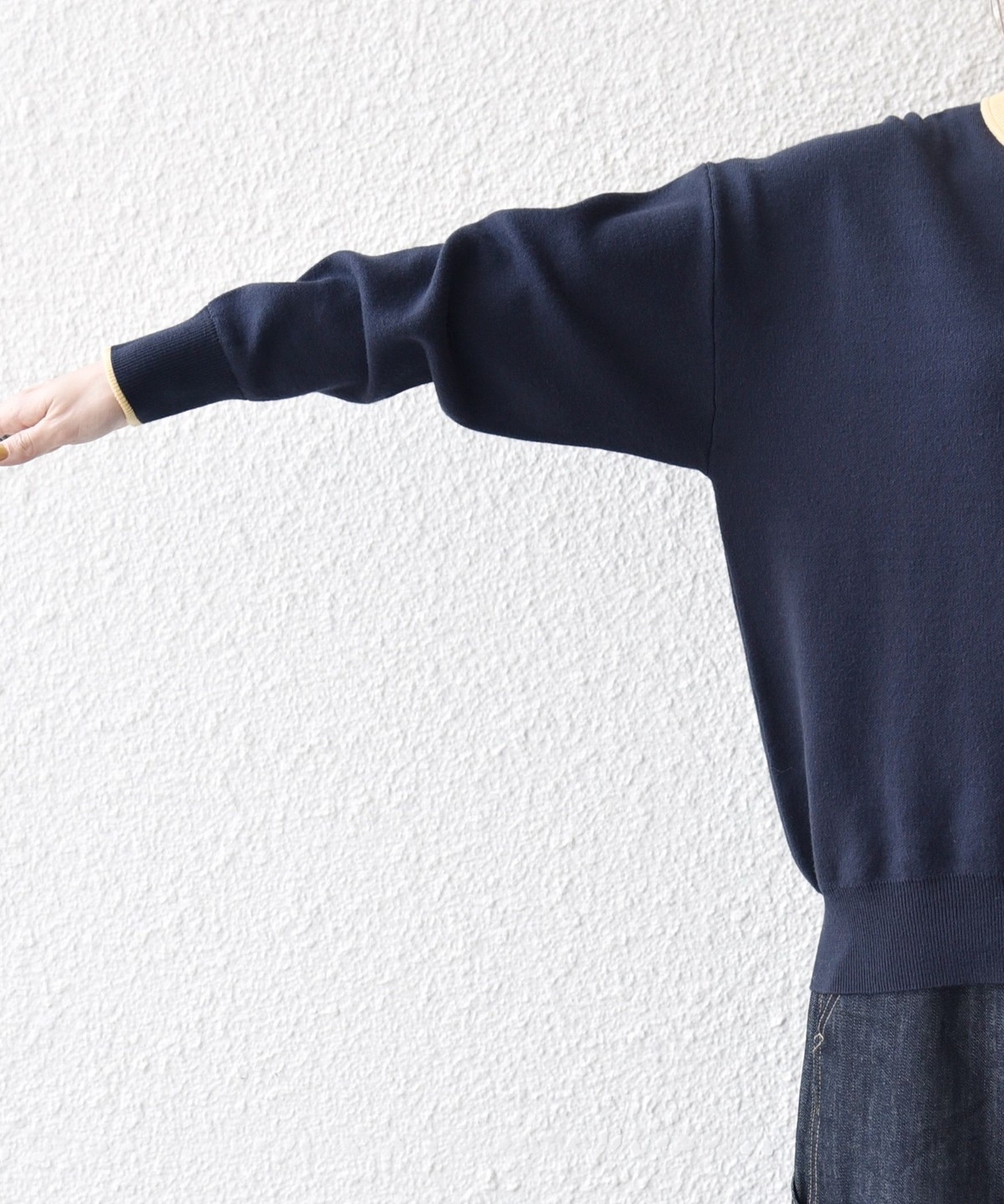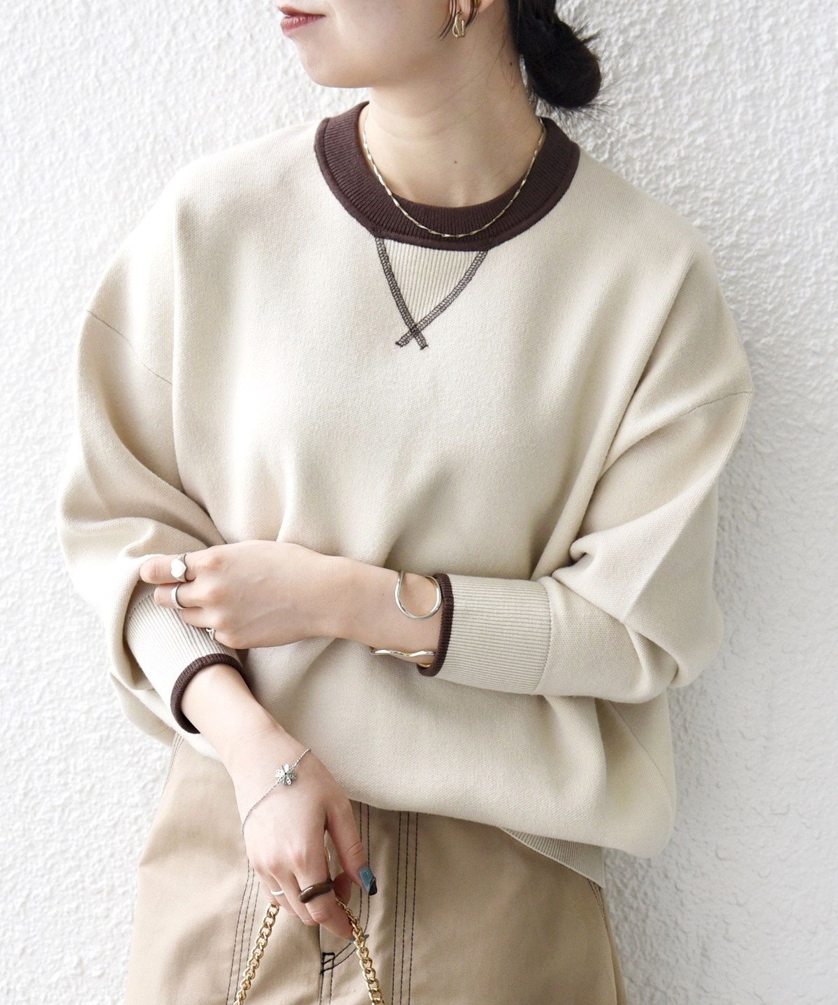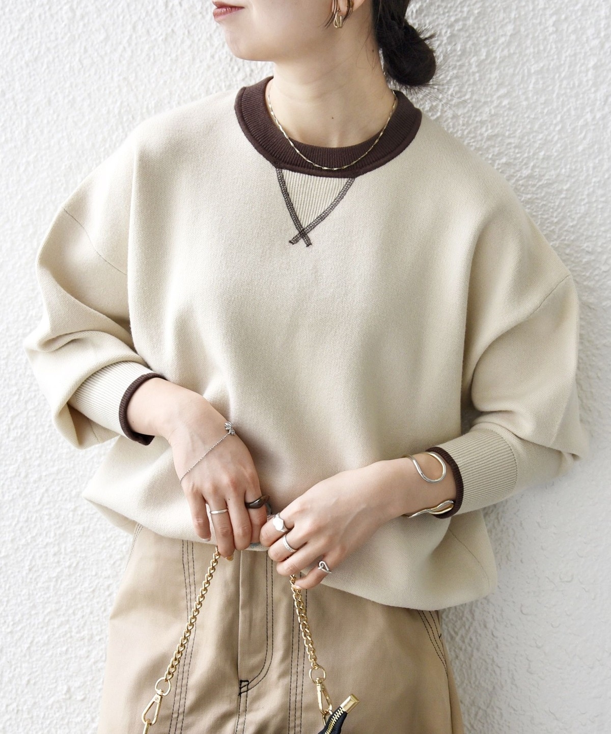 首元には太めの配色をあしらい、顔まわりにメリハリをプラス。