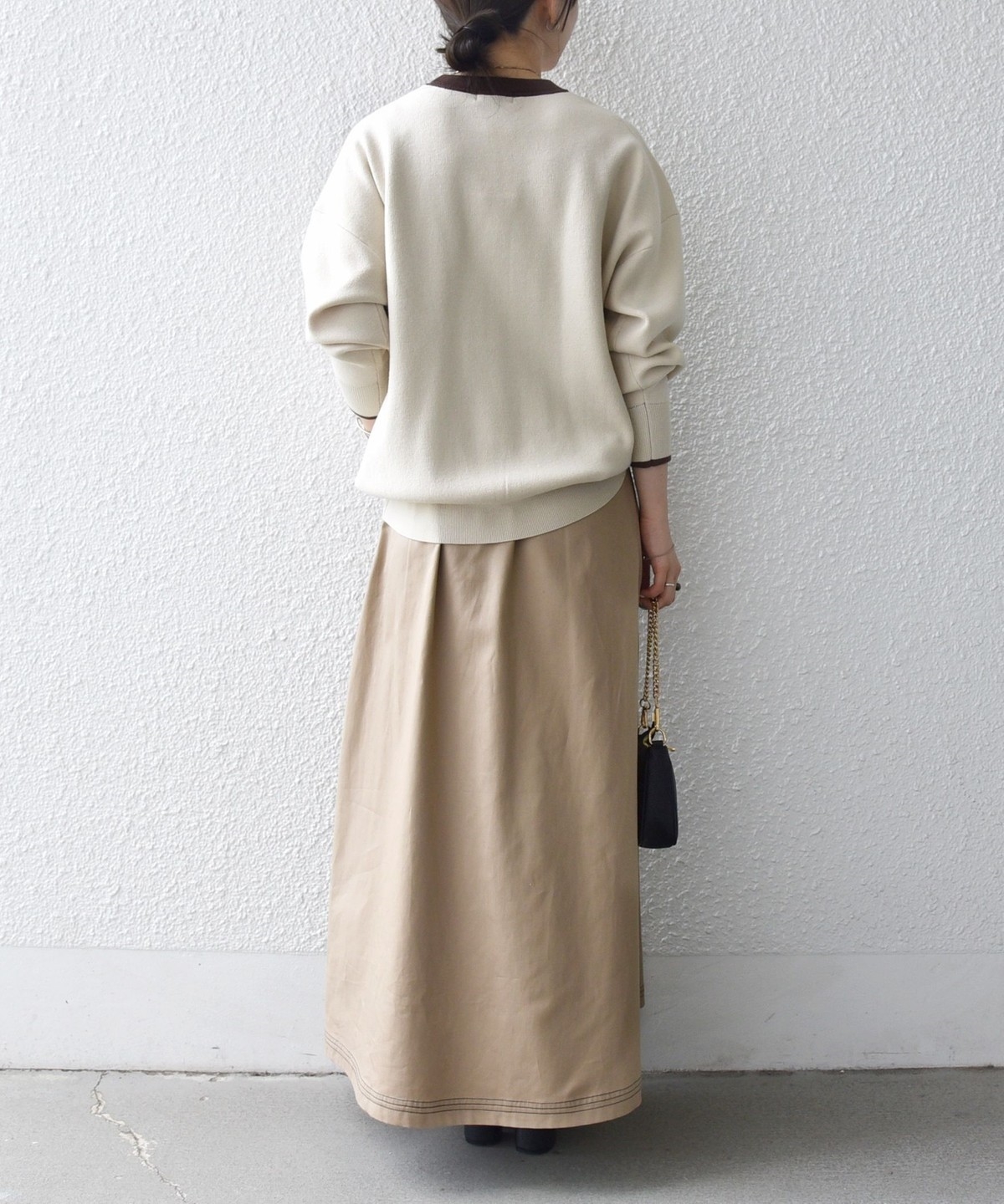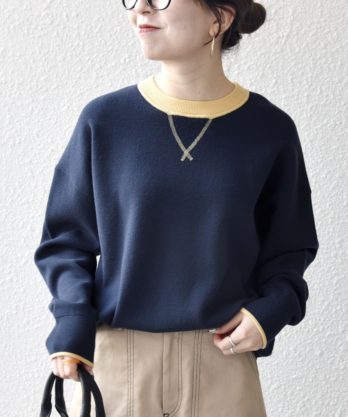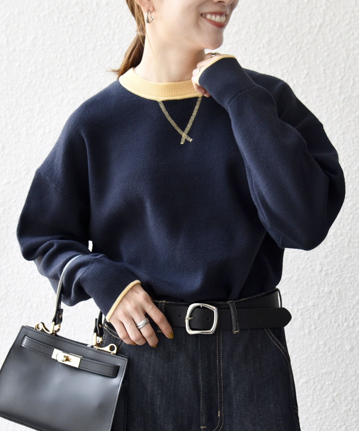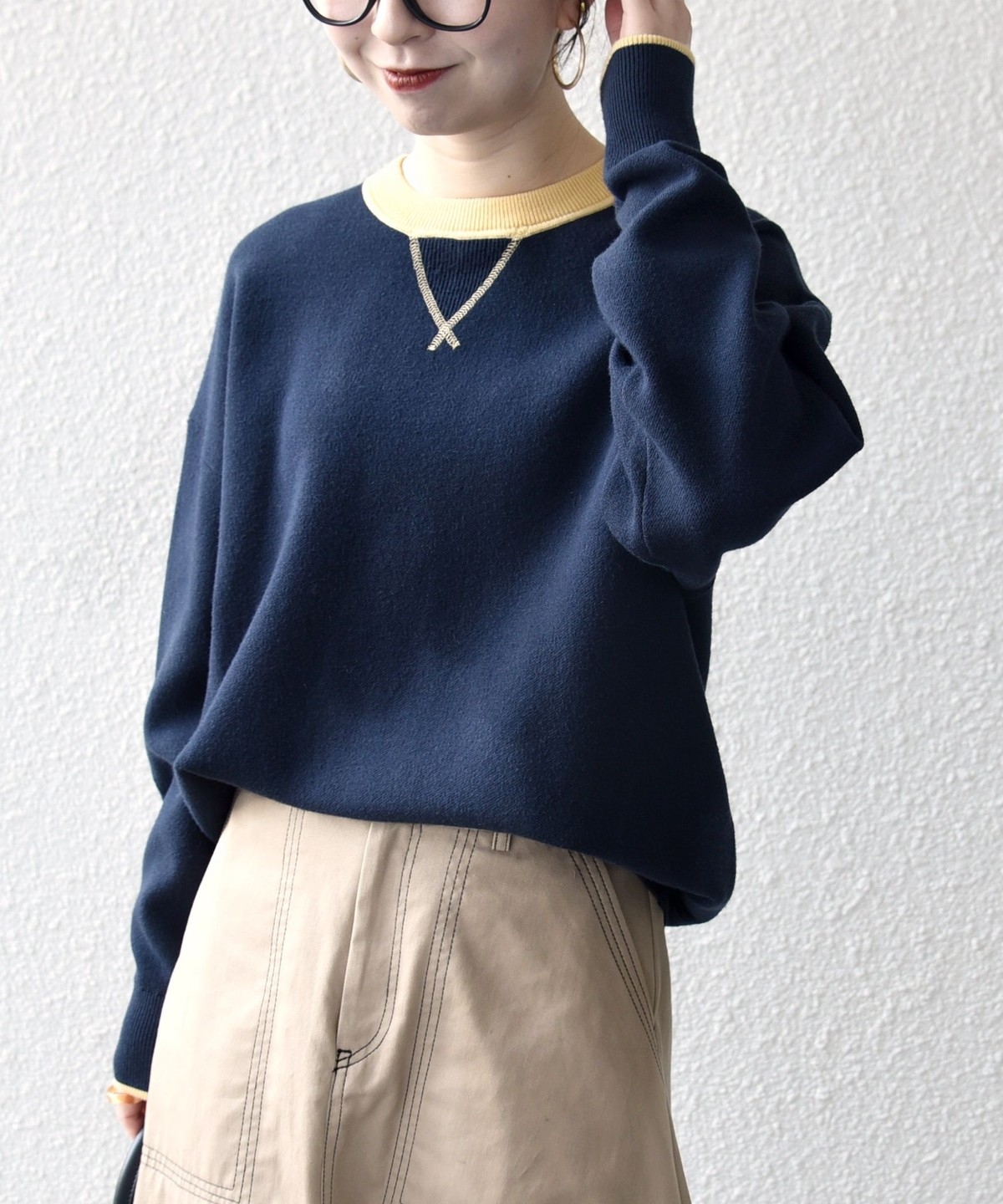 首元には太めの配色をあしらい、顔まわりにメリハリをプラス。