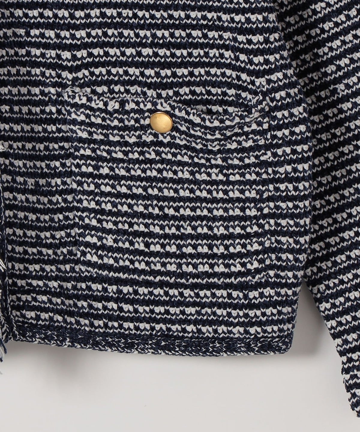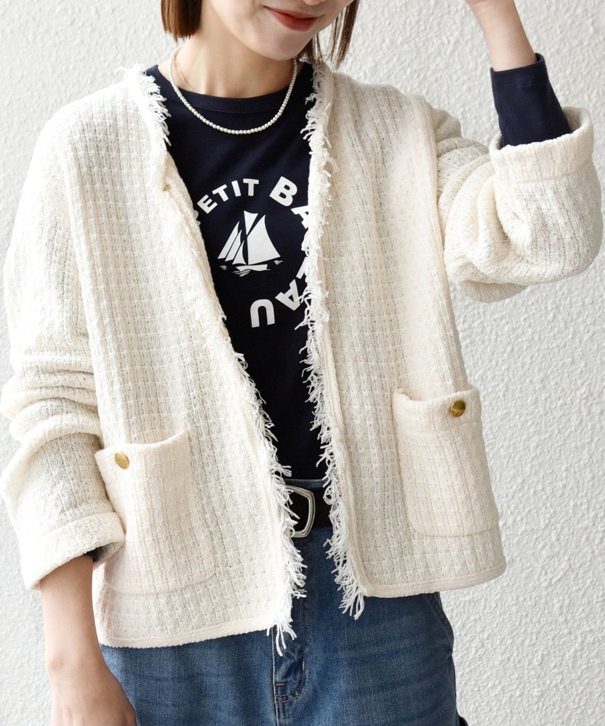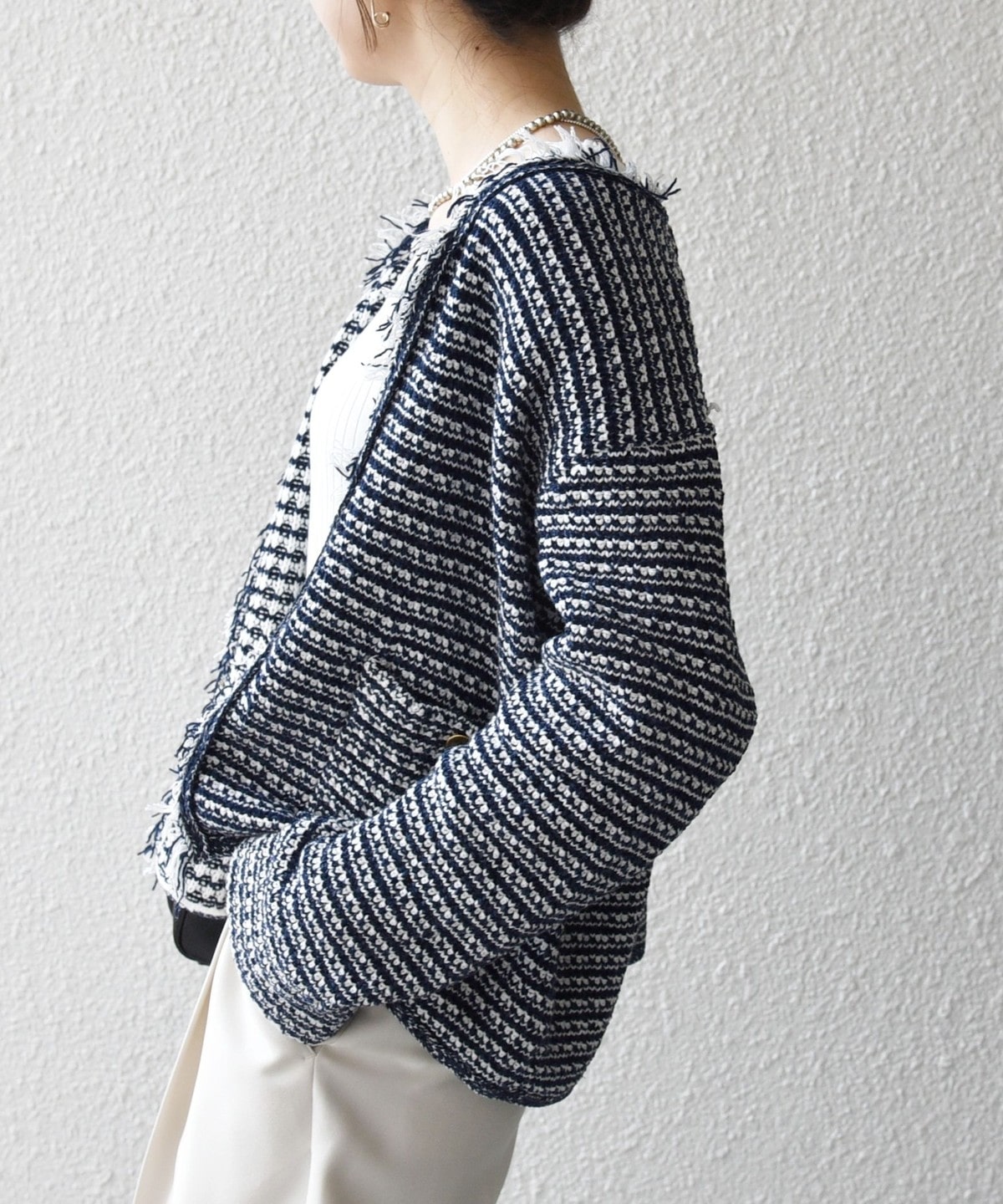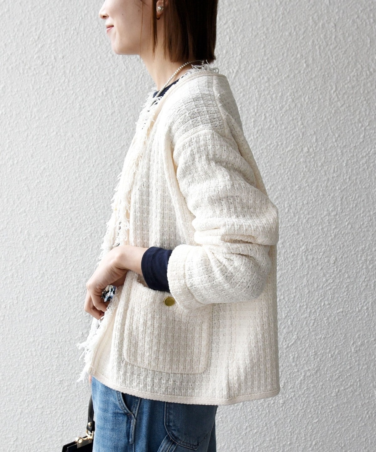 クラシックなツイードの表情をニットで表現した、カーディガンジャケット。