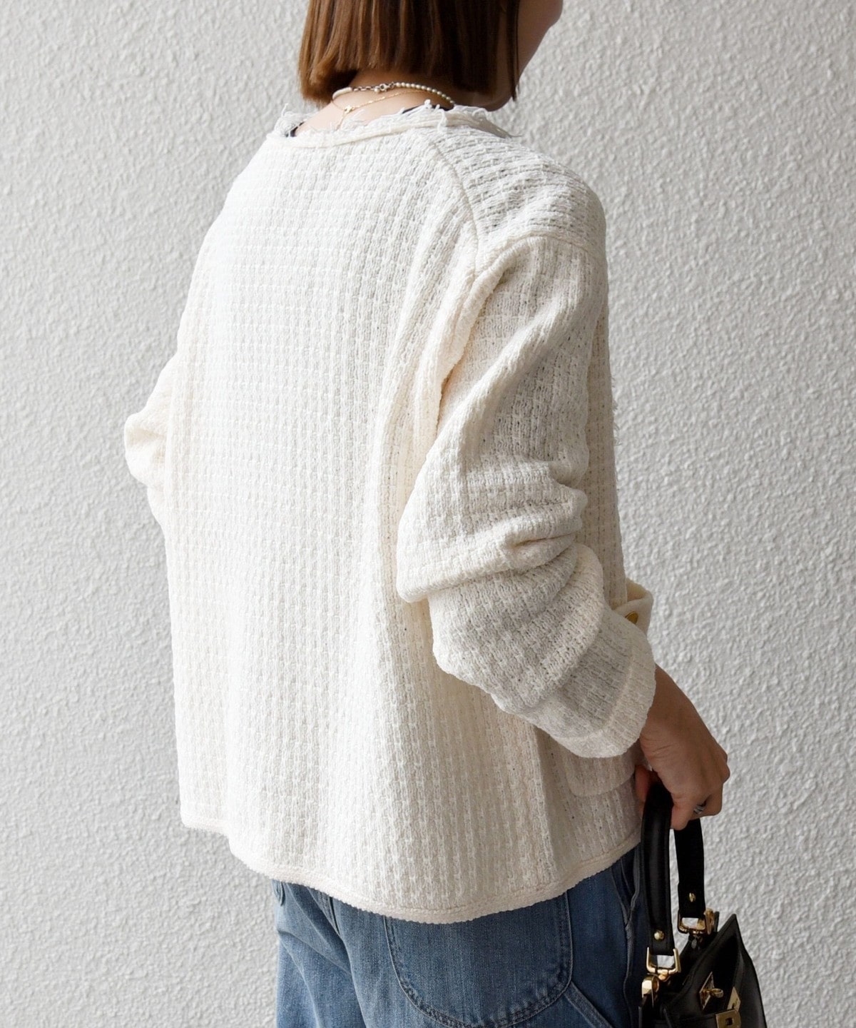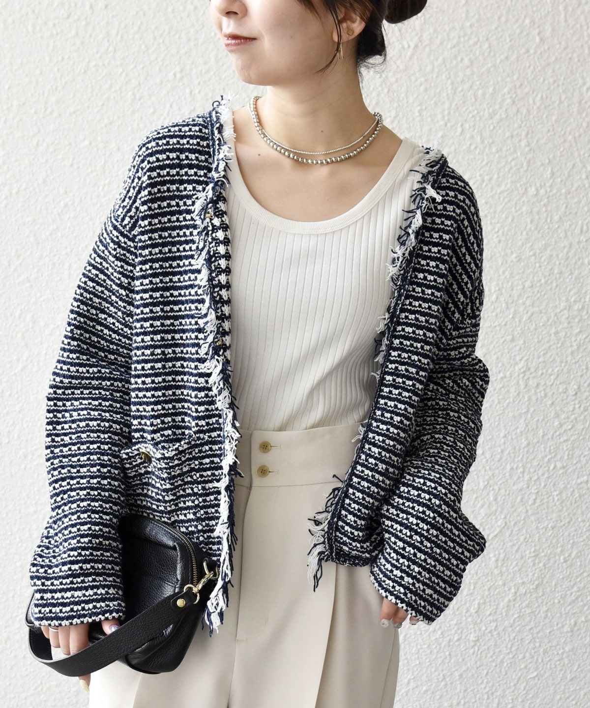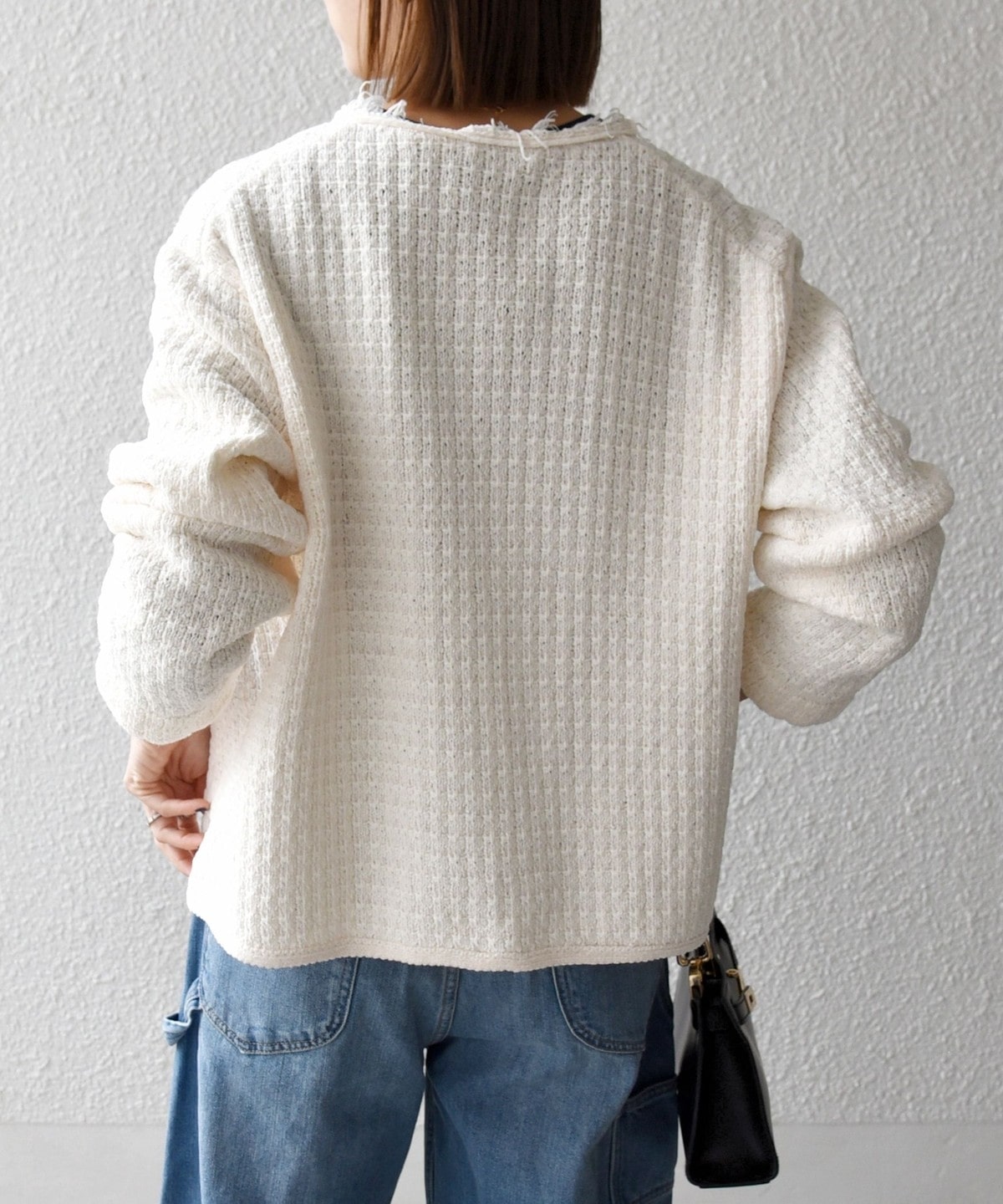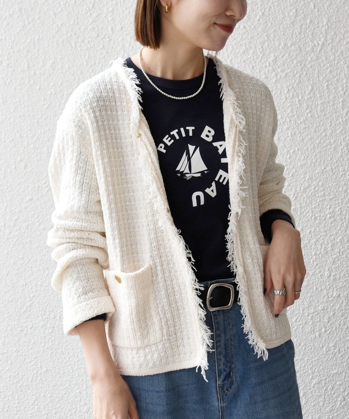 クラシックなツイードの表情をニットで表現した、カーディガンジャケット。