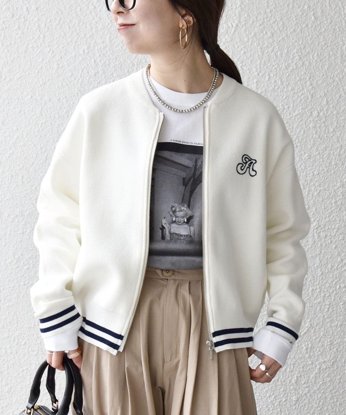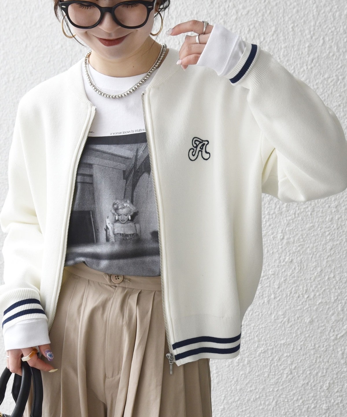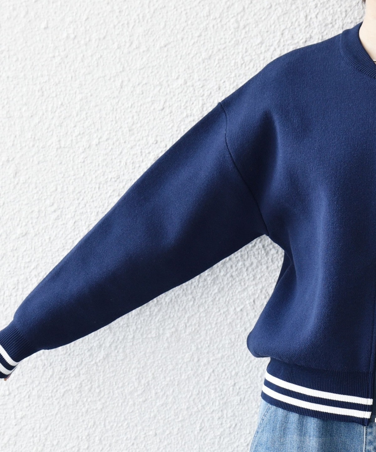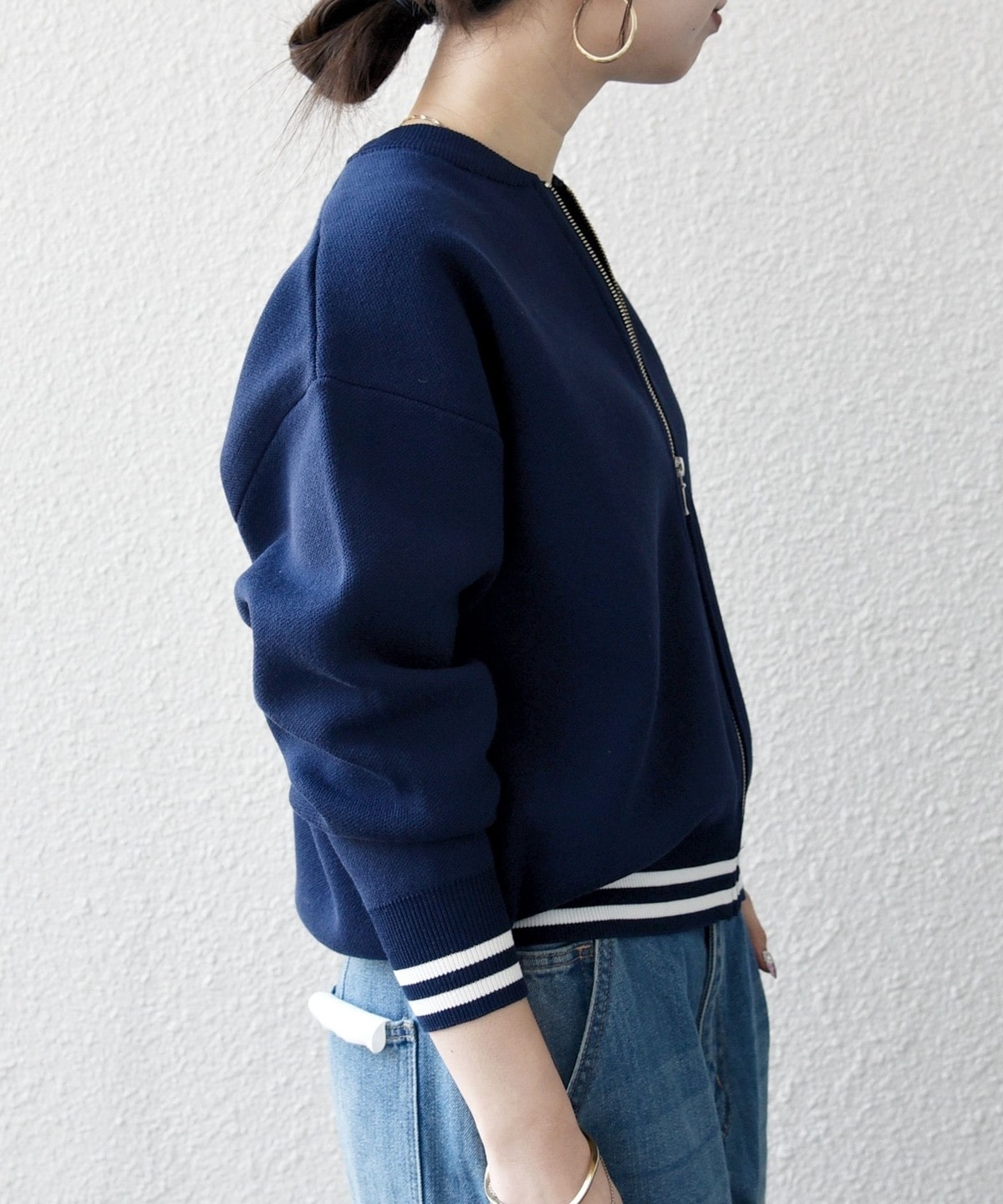 クルーネックのジップアップデザインがスポーティな印象の、ブルゾンタイプのカーディガン。