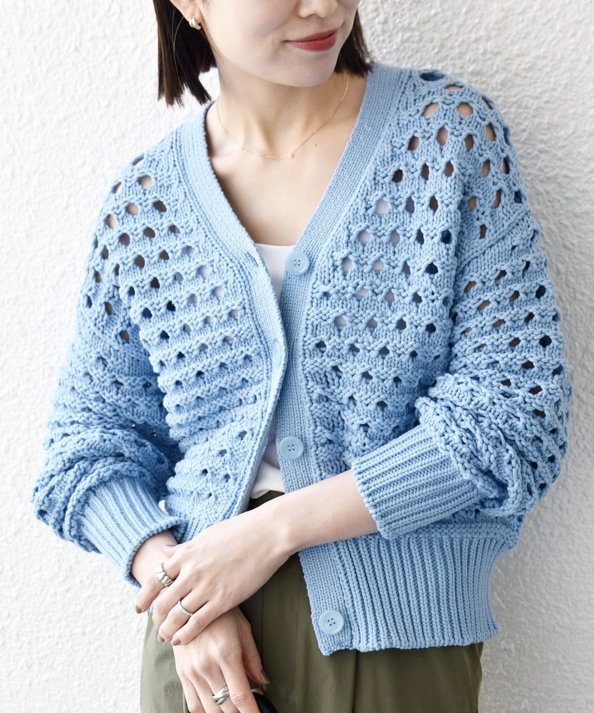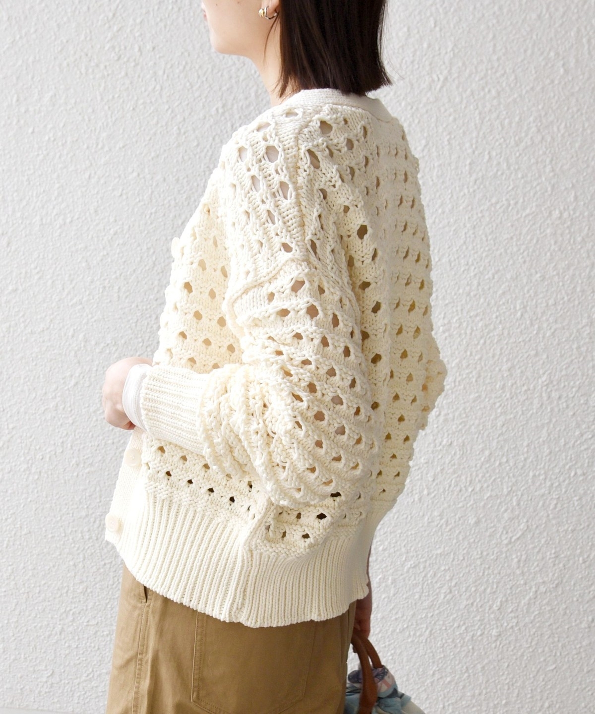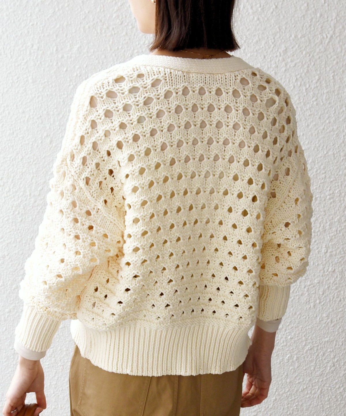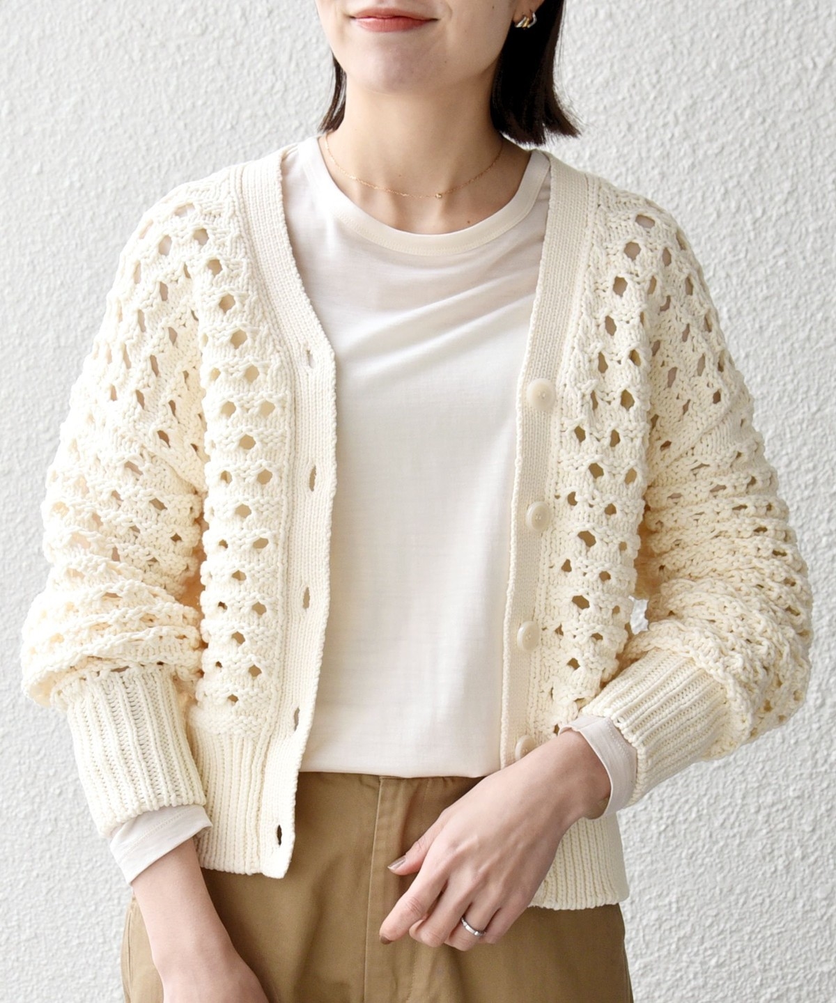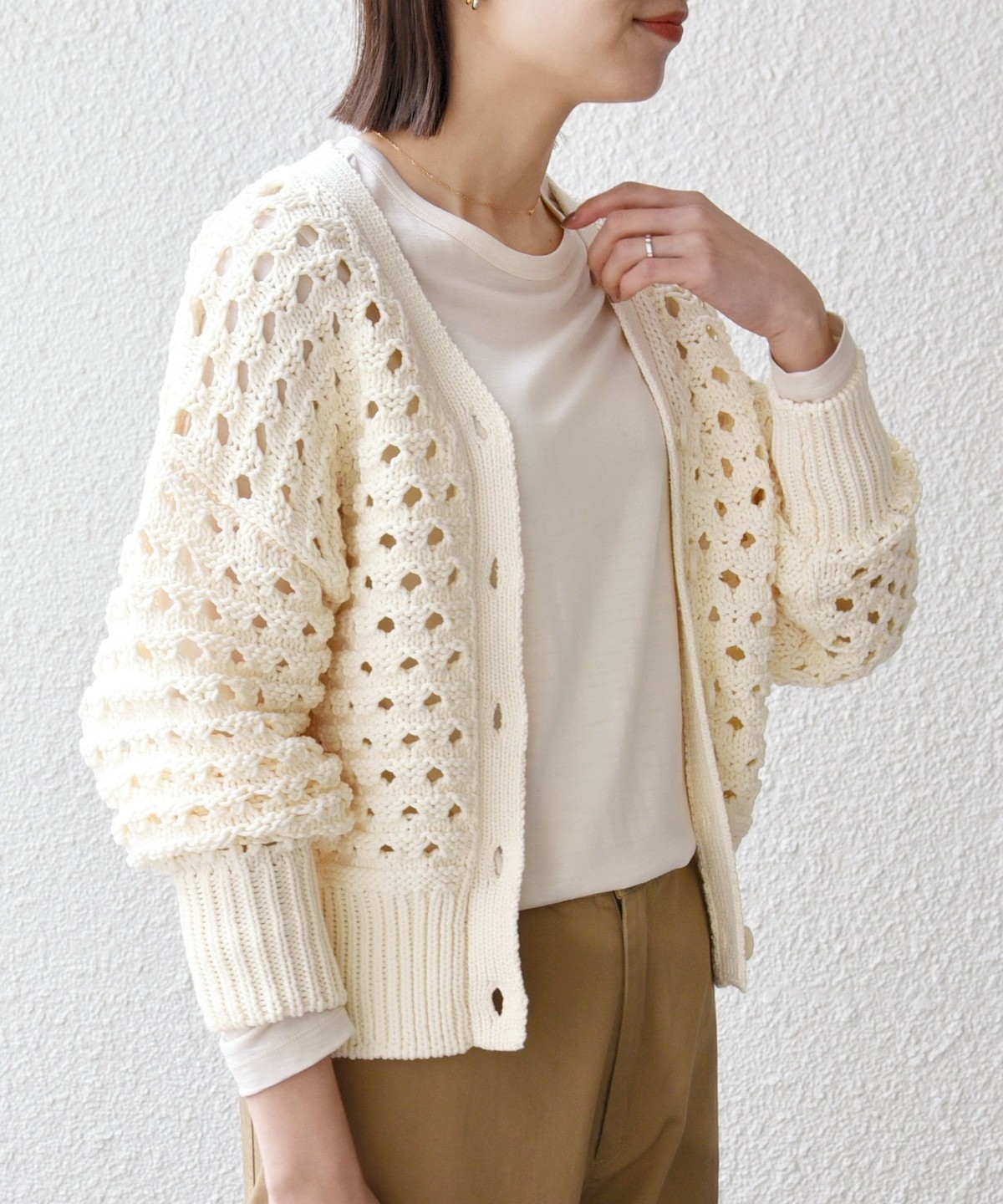 ざっくりとした透かし編みが、大人の抜け感を演出するVネックカーディガン。