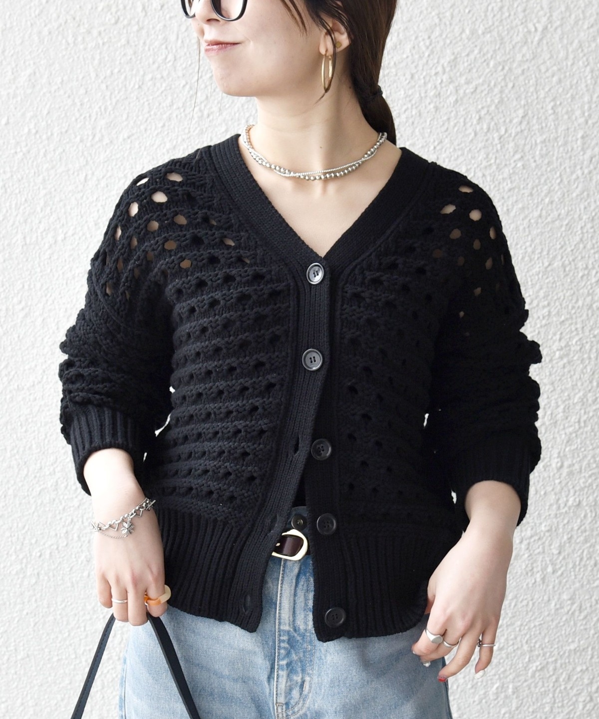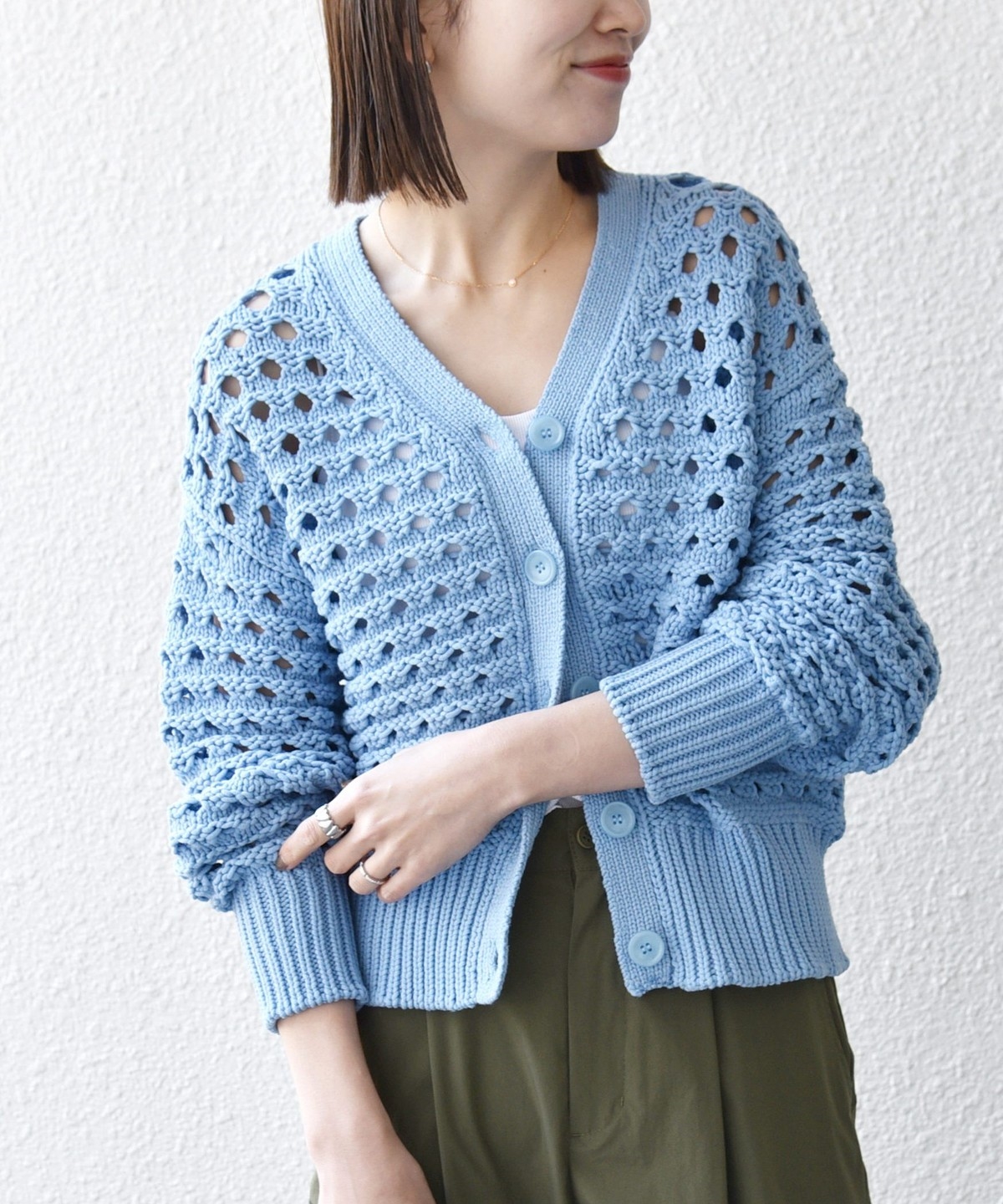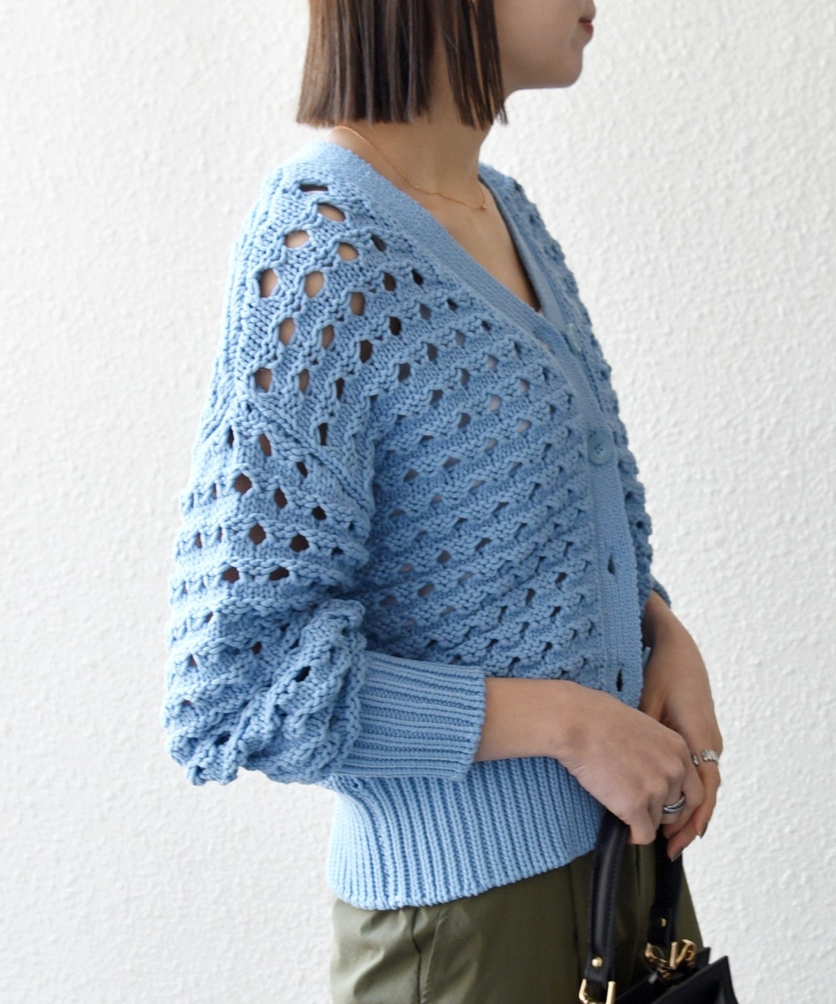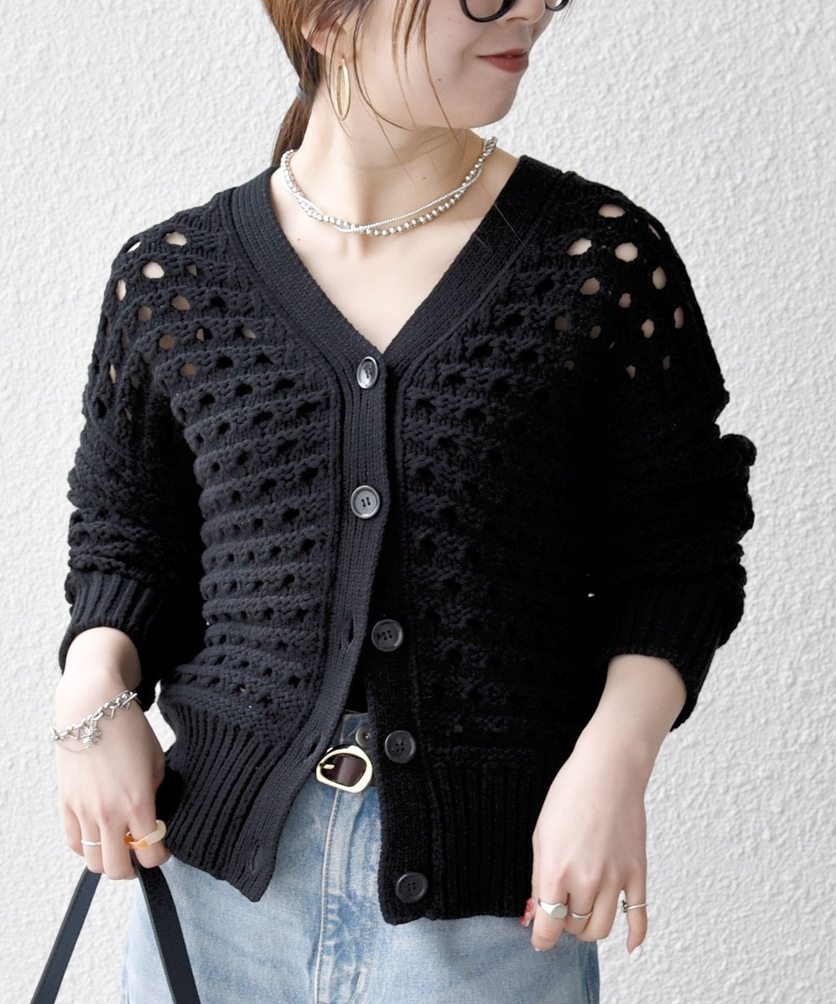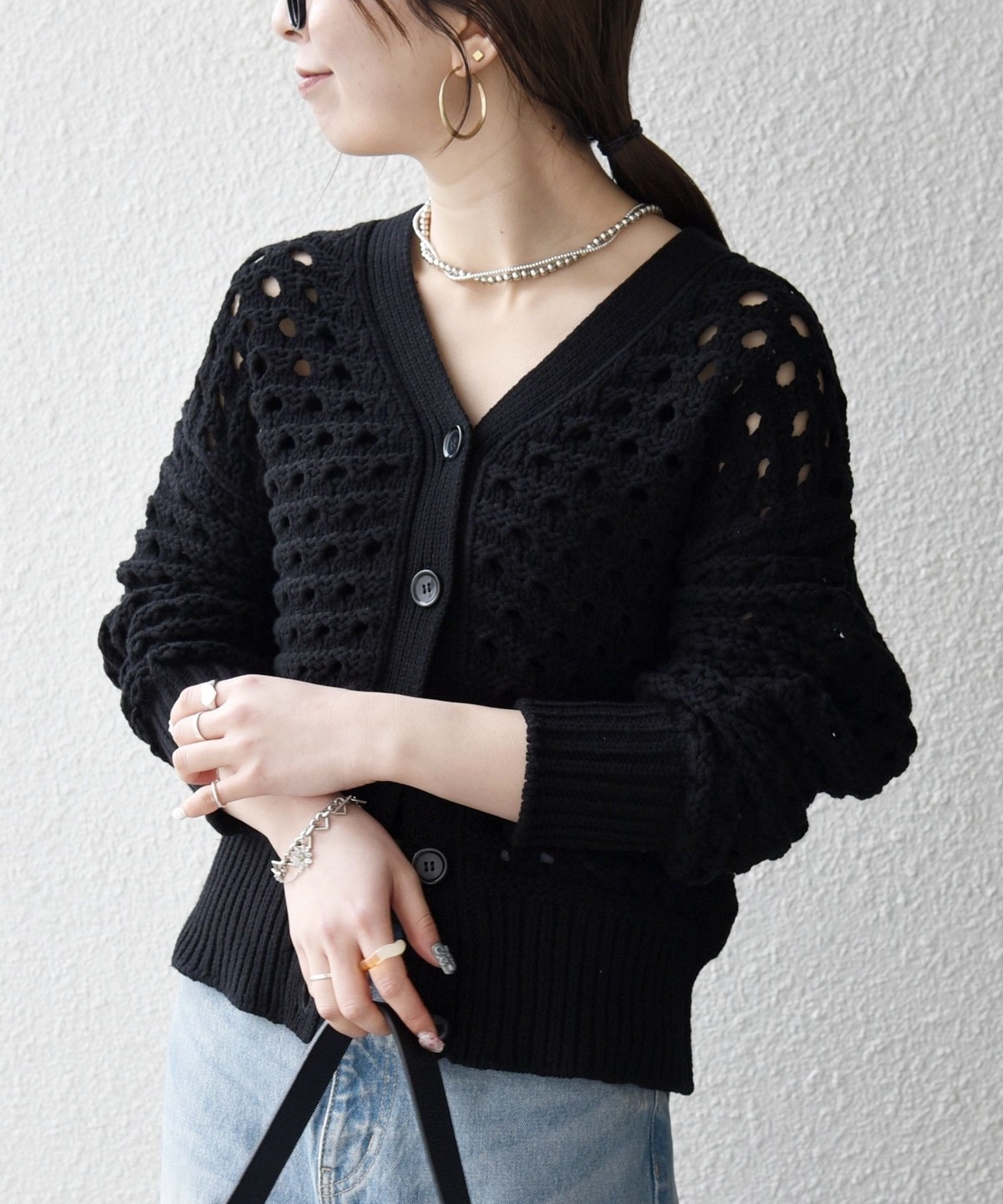 ざっくりとした透かし編みが、大人の抜け感を演出するVネックカーディガン。