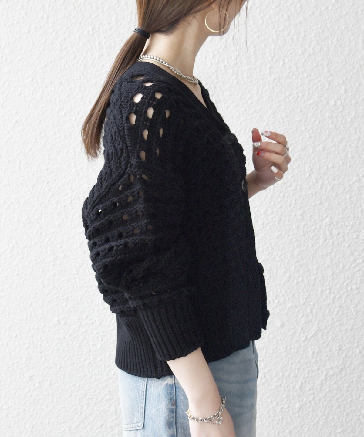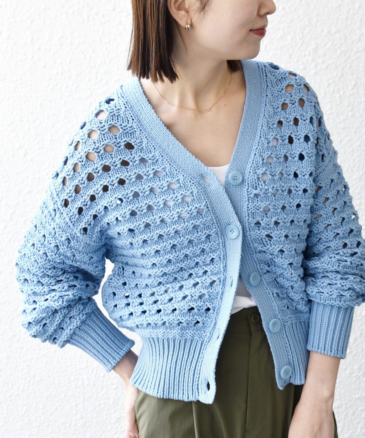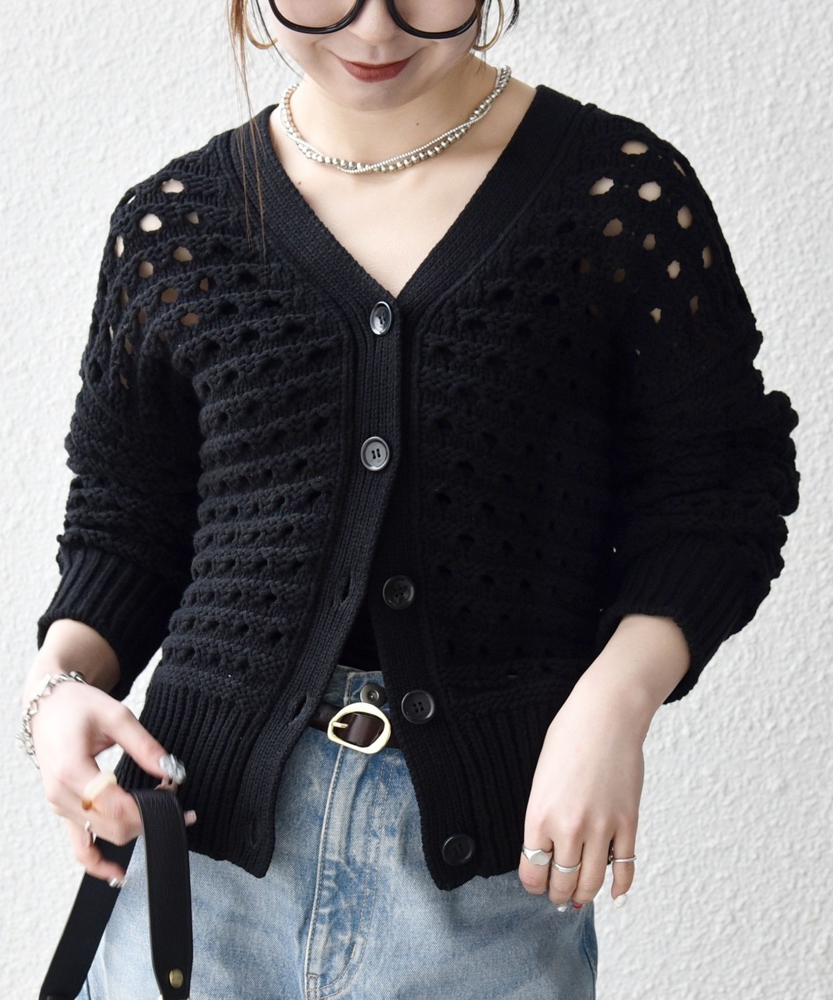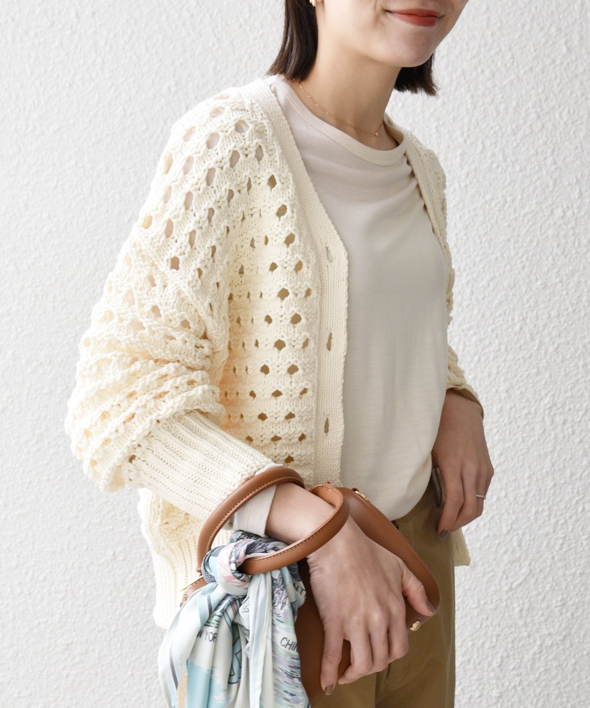 ざっくりとした透かし編みが、大人の抜け感を演出するVネックカーディガン。
