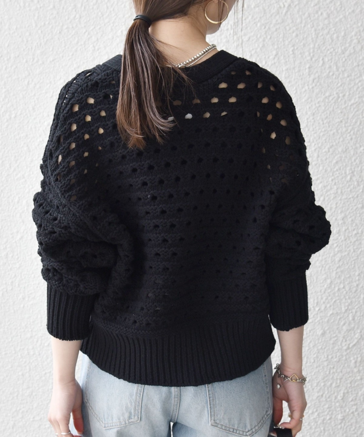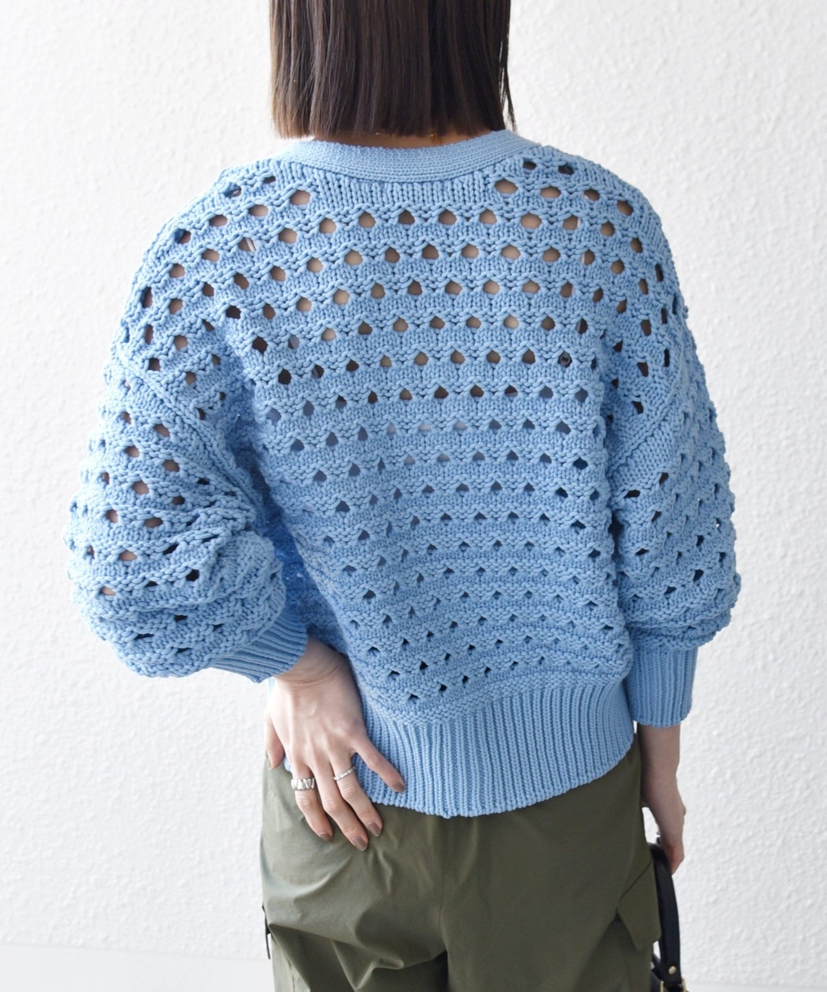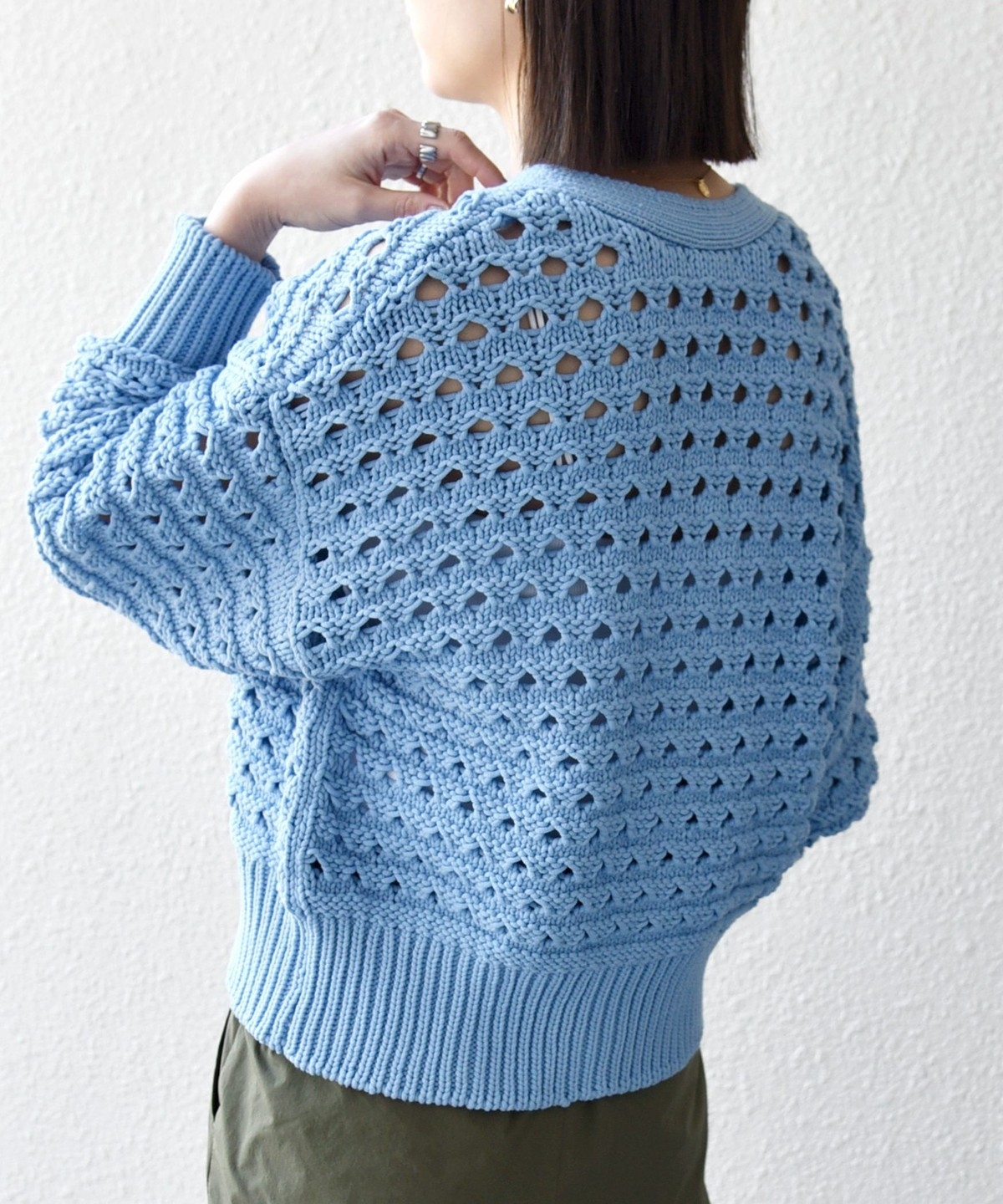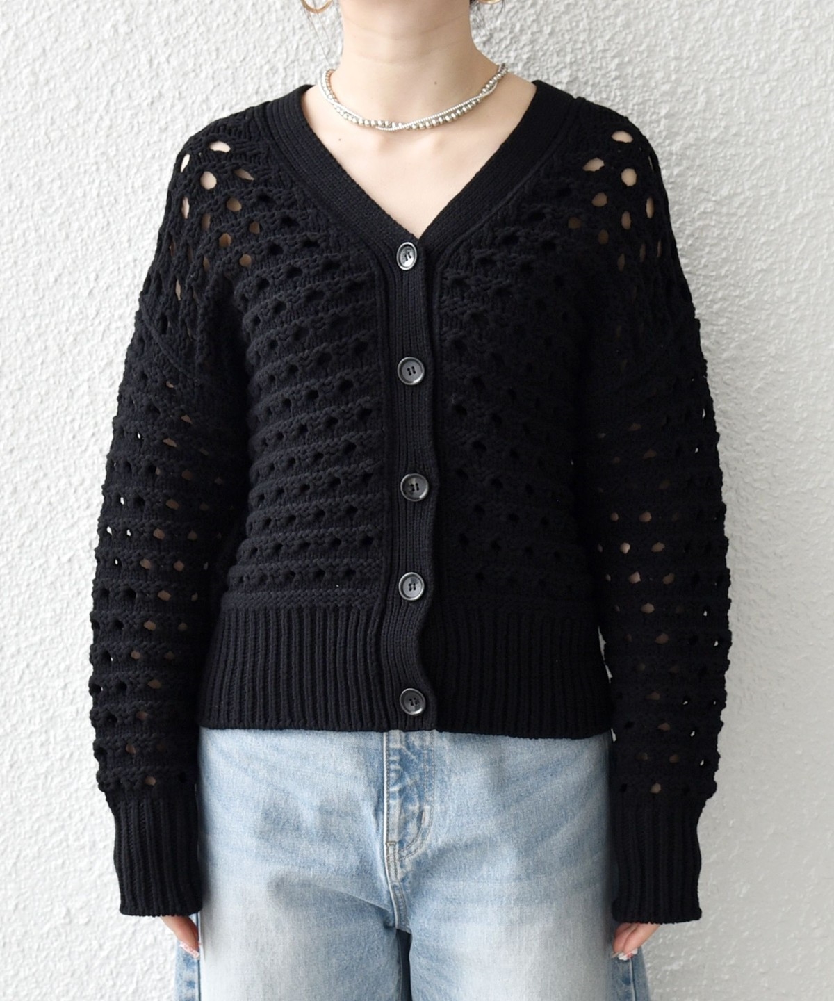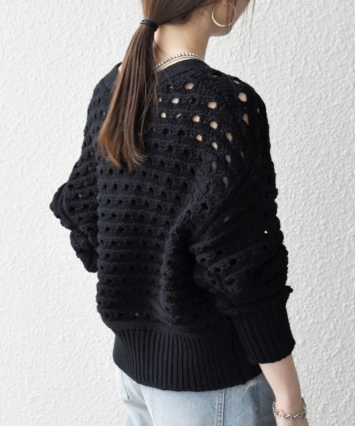 ざっくりとした透かし編みが、大人の抜け感を演出するVネックカーディガン。