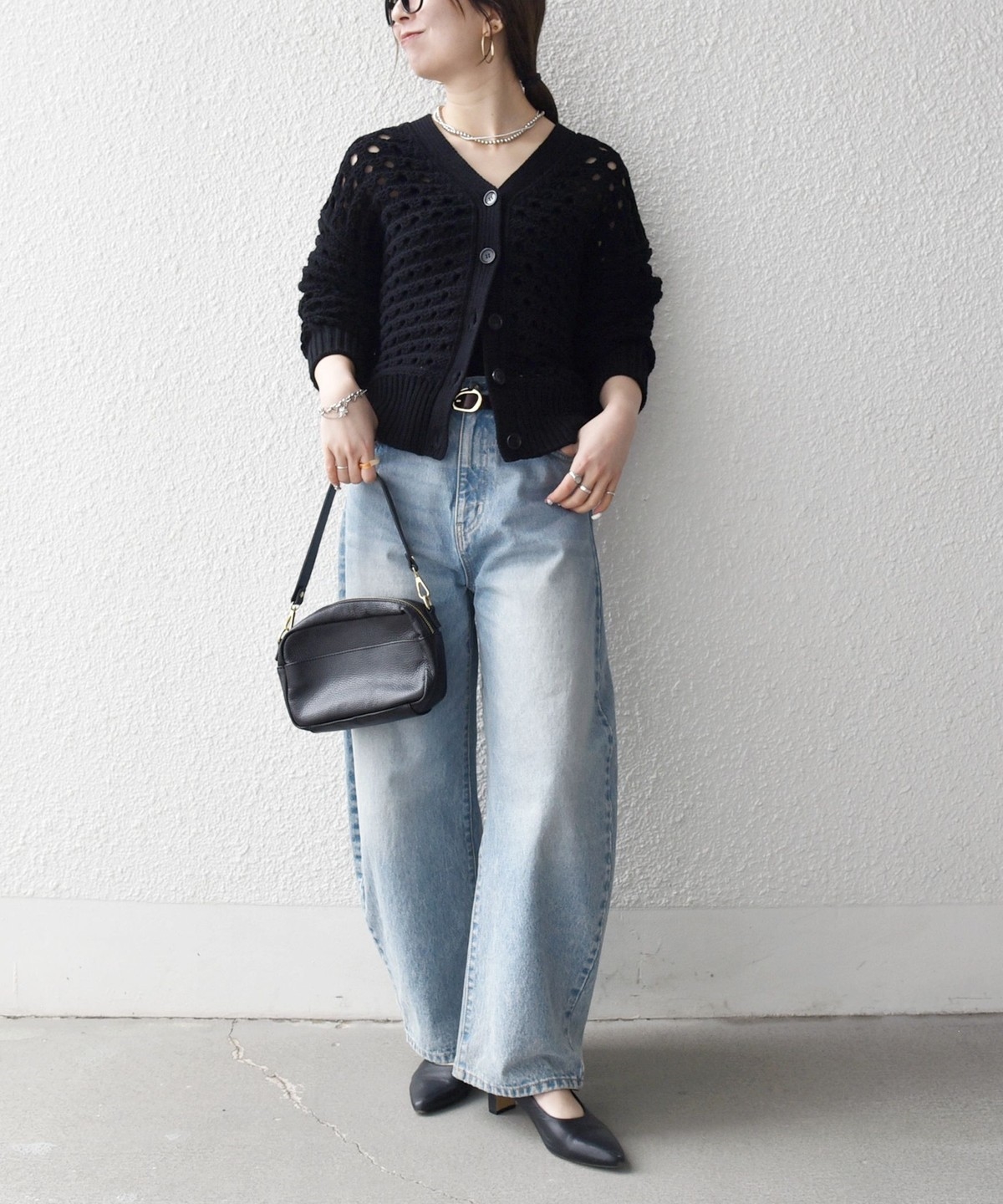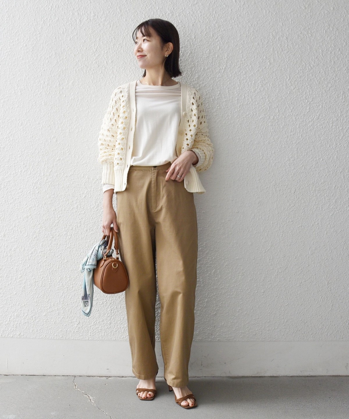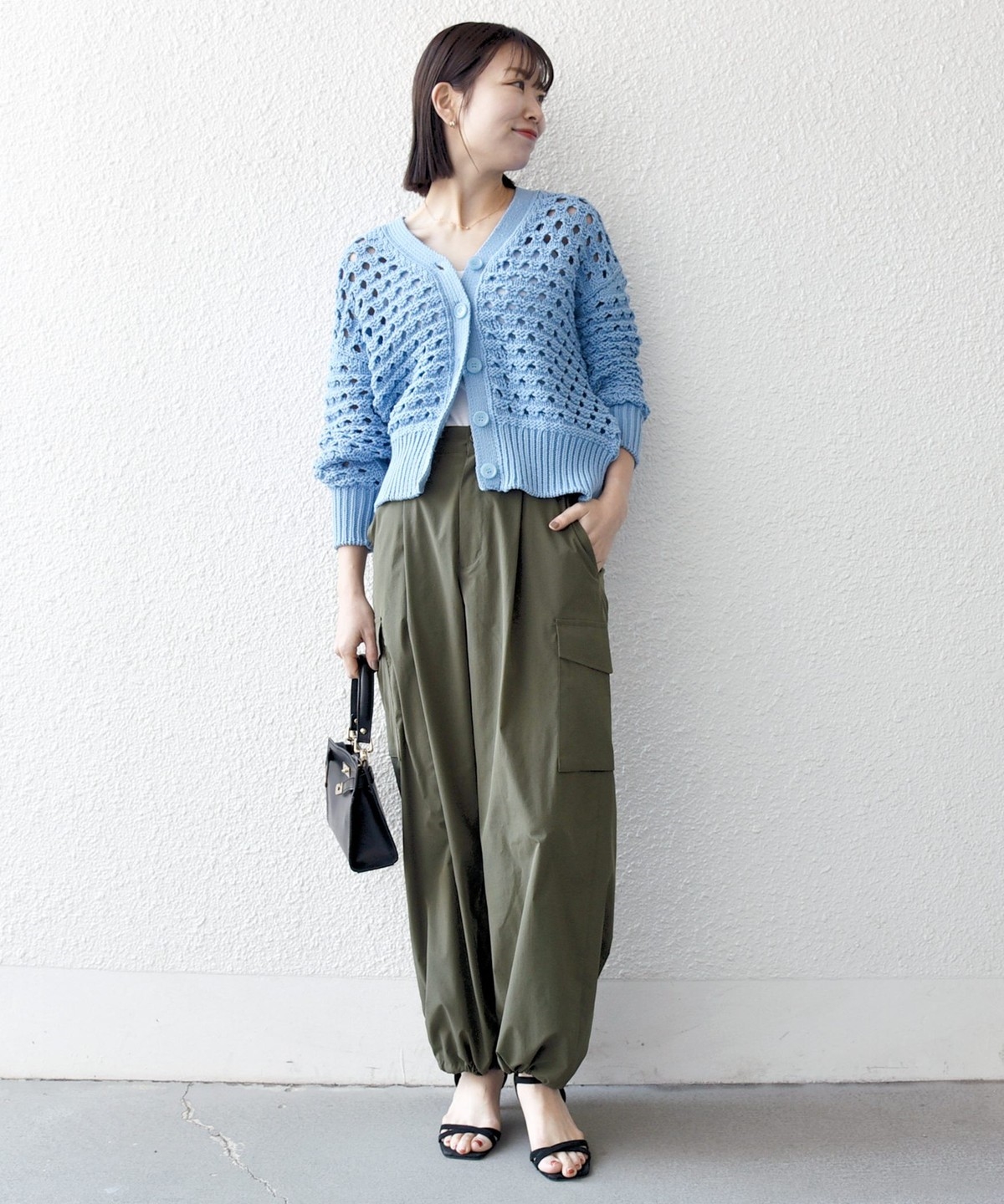 編み柄を活かし、インナーにはシンプルなTシャツやタンクトップを合わせるのがおすすめです。