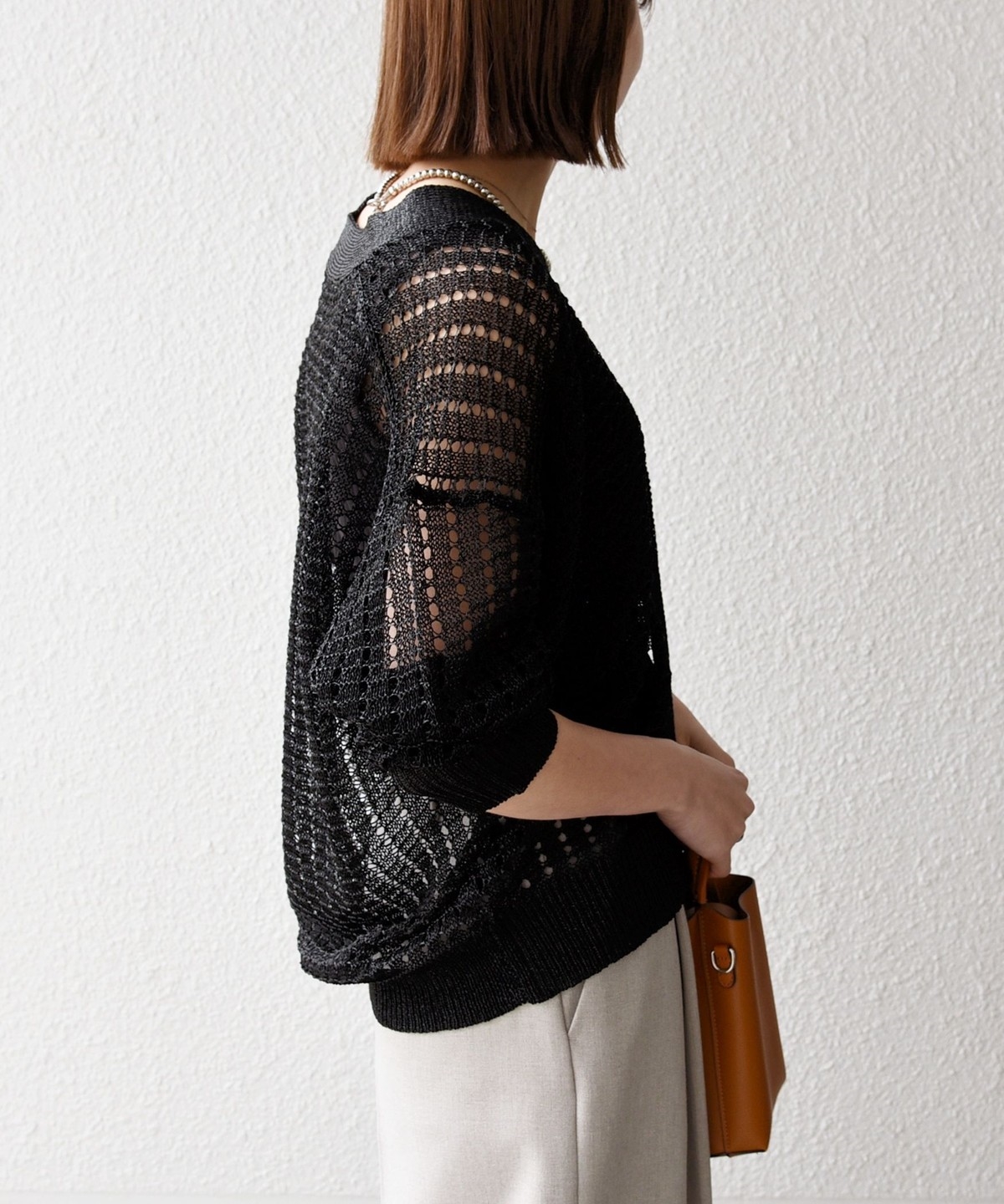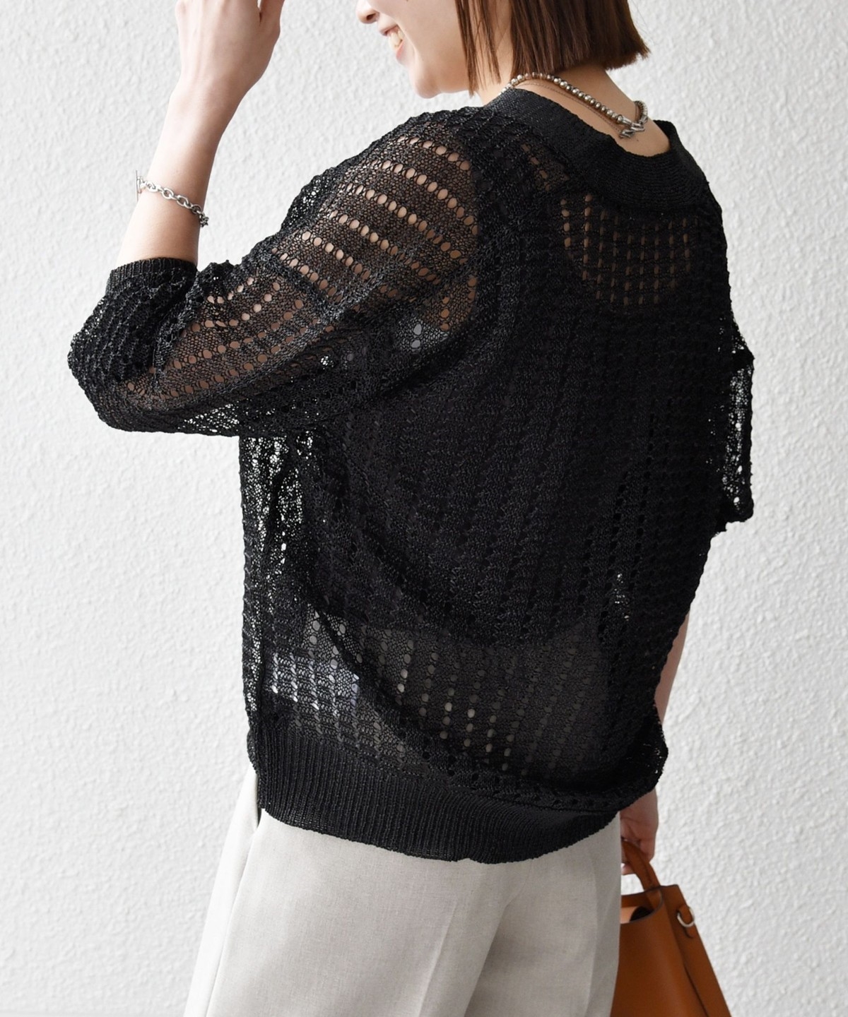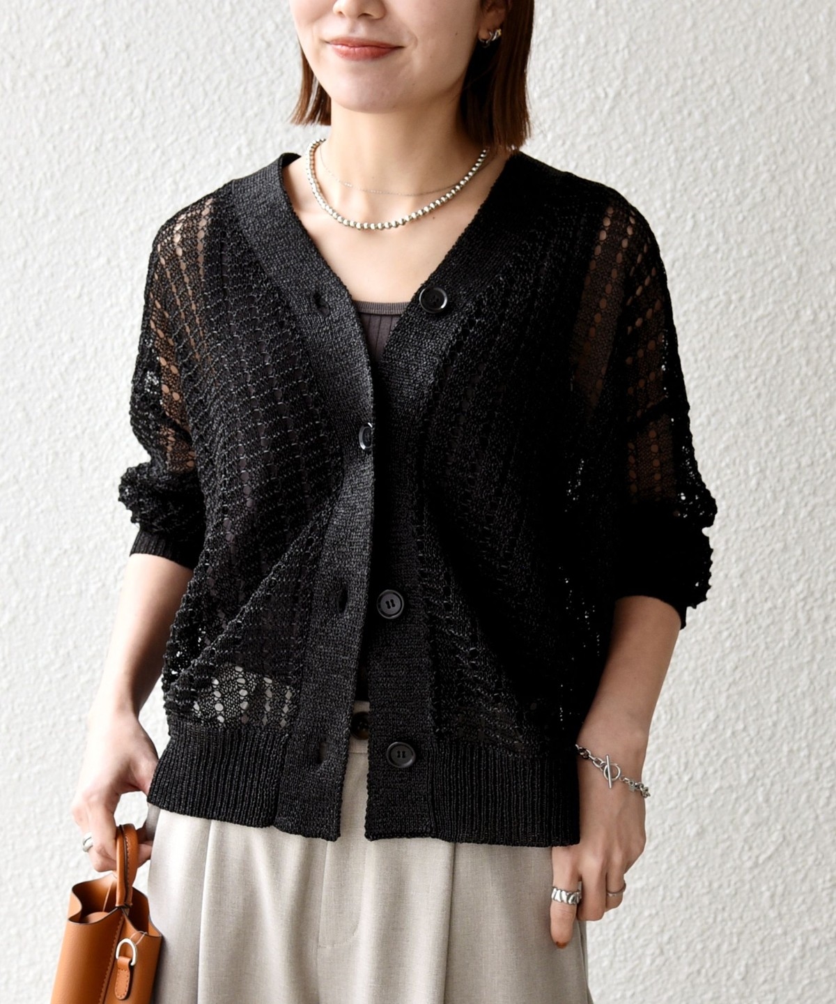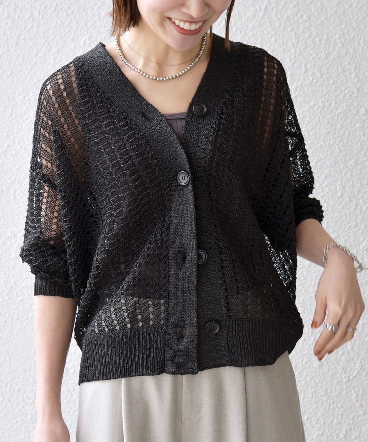 透かし編みで表現した表情のある編み柄がポイントのサマーニットカーディガン。