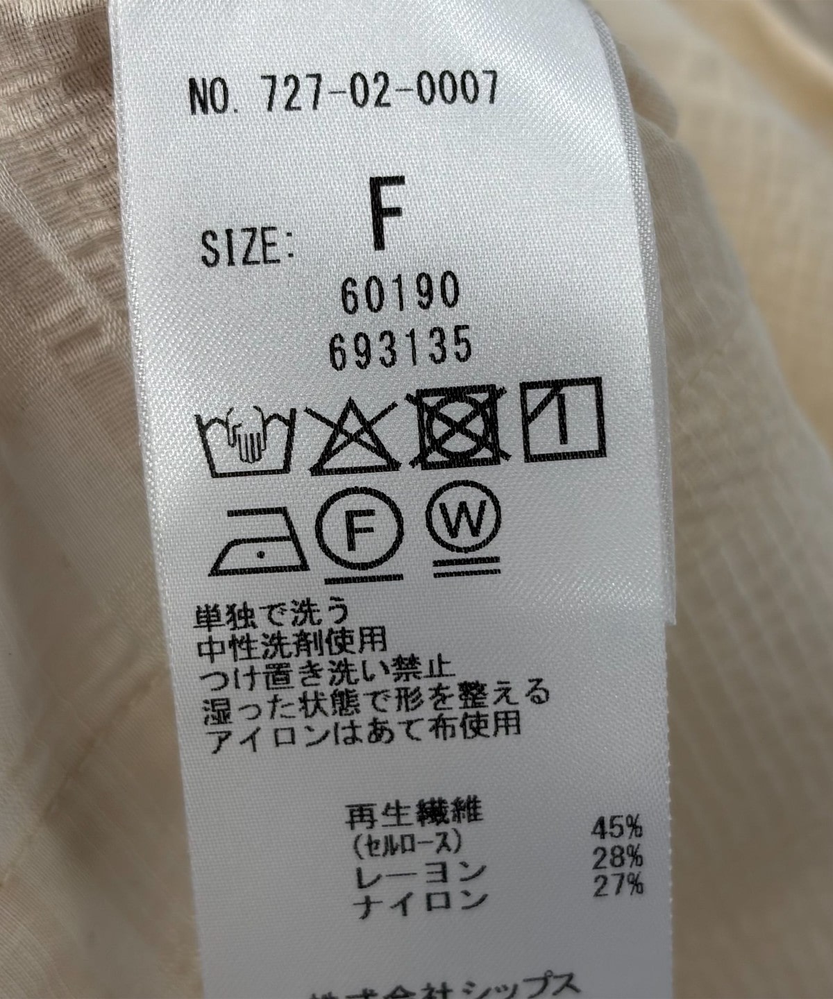 素材:再生繊維(セルロース)45%, レーヨン28%, ナイロン27%