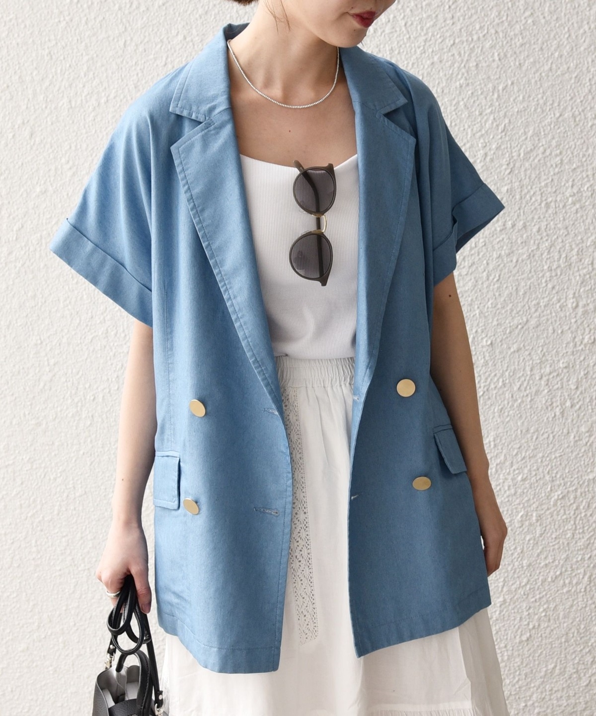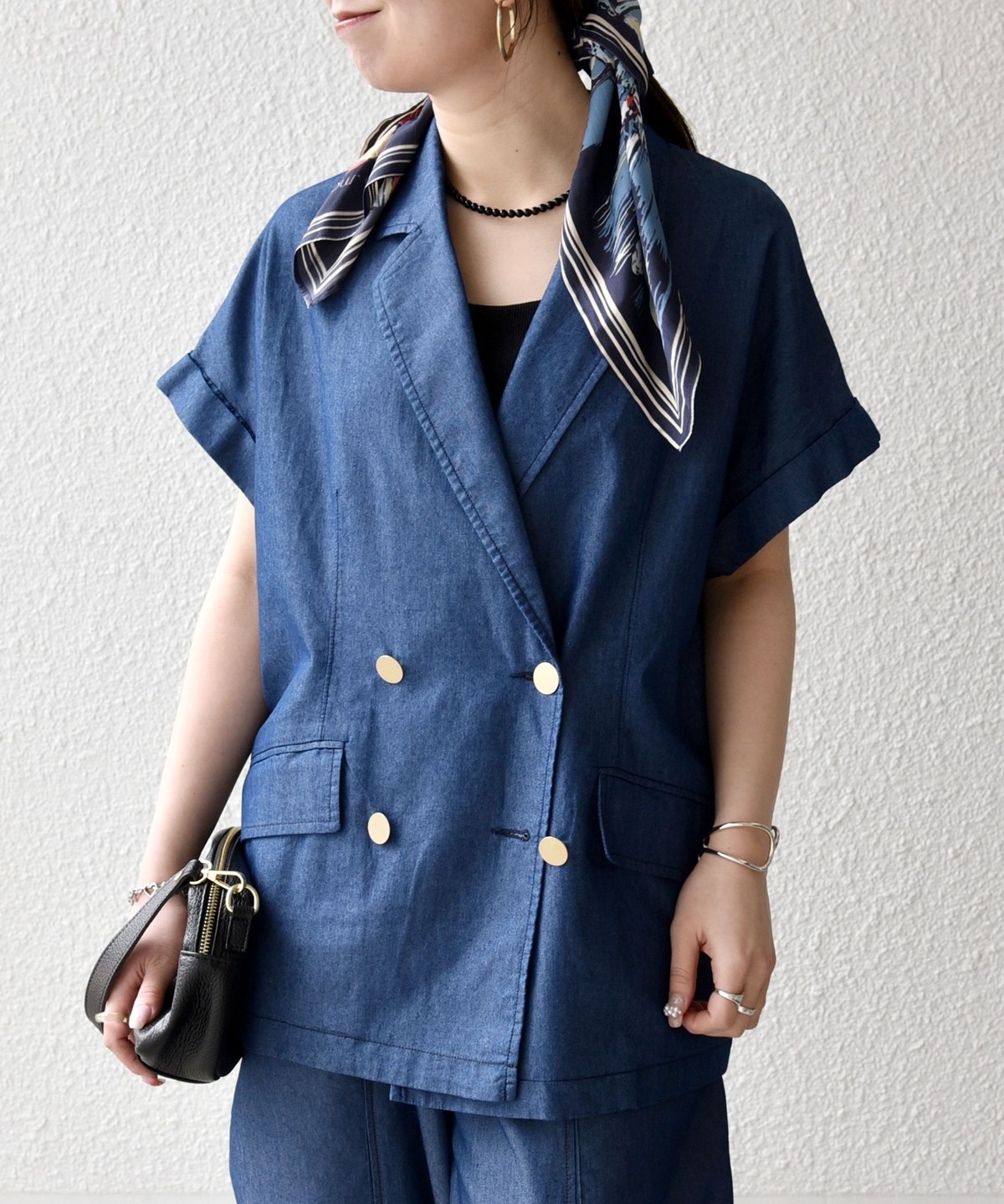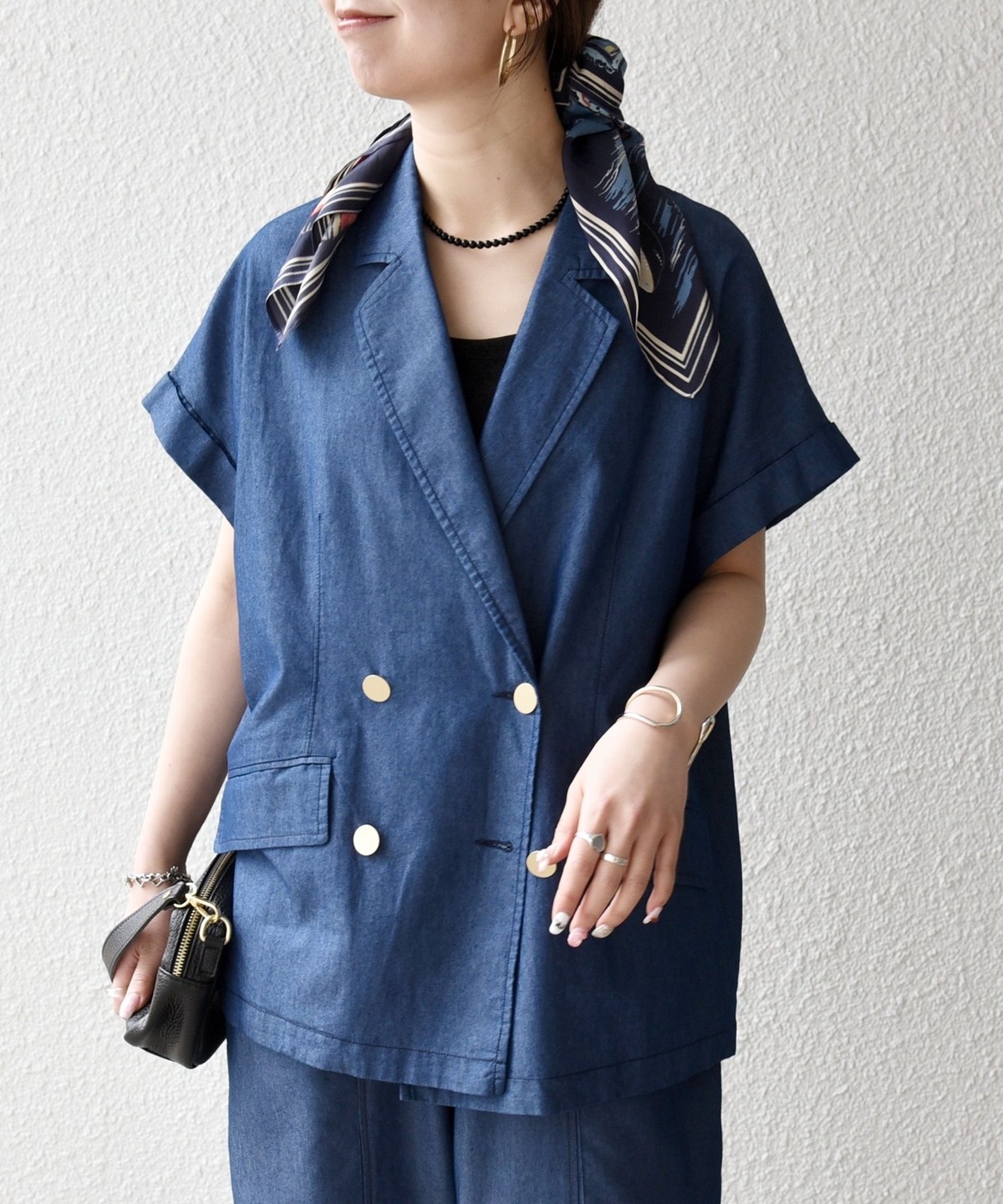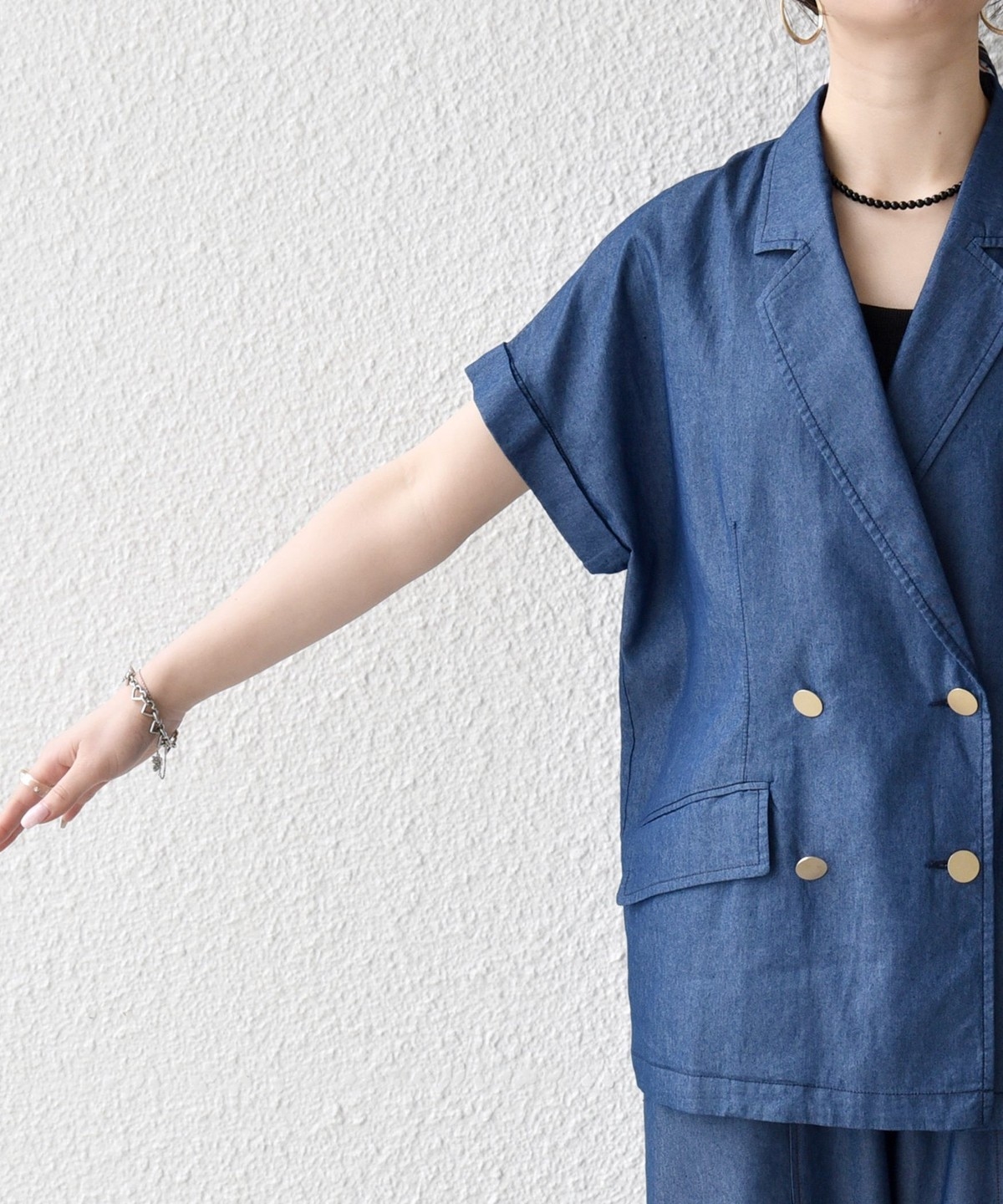テーラードカラーとダブルボタン仕様で、カジュアルな素材ながらも程よいきちんと感をプラスしてくれるジャケット。