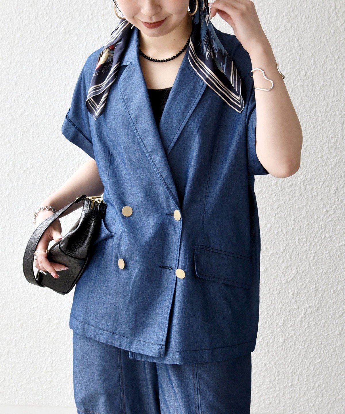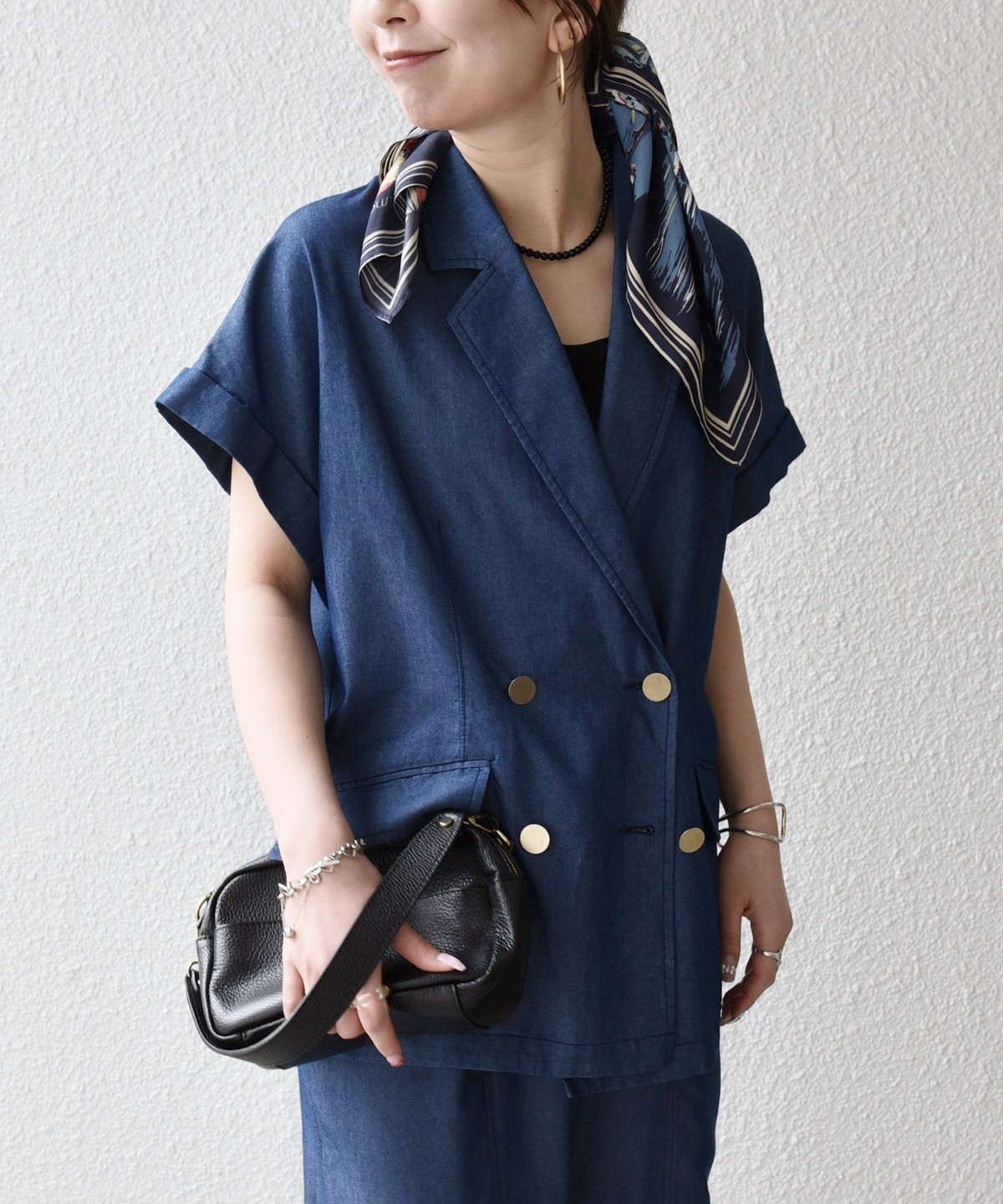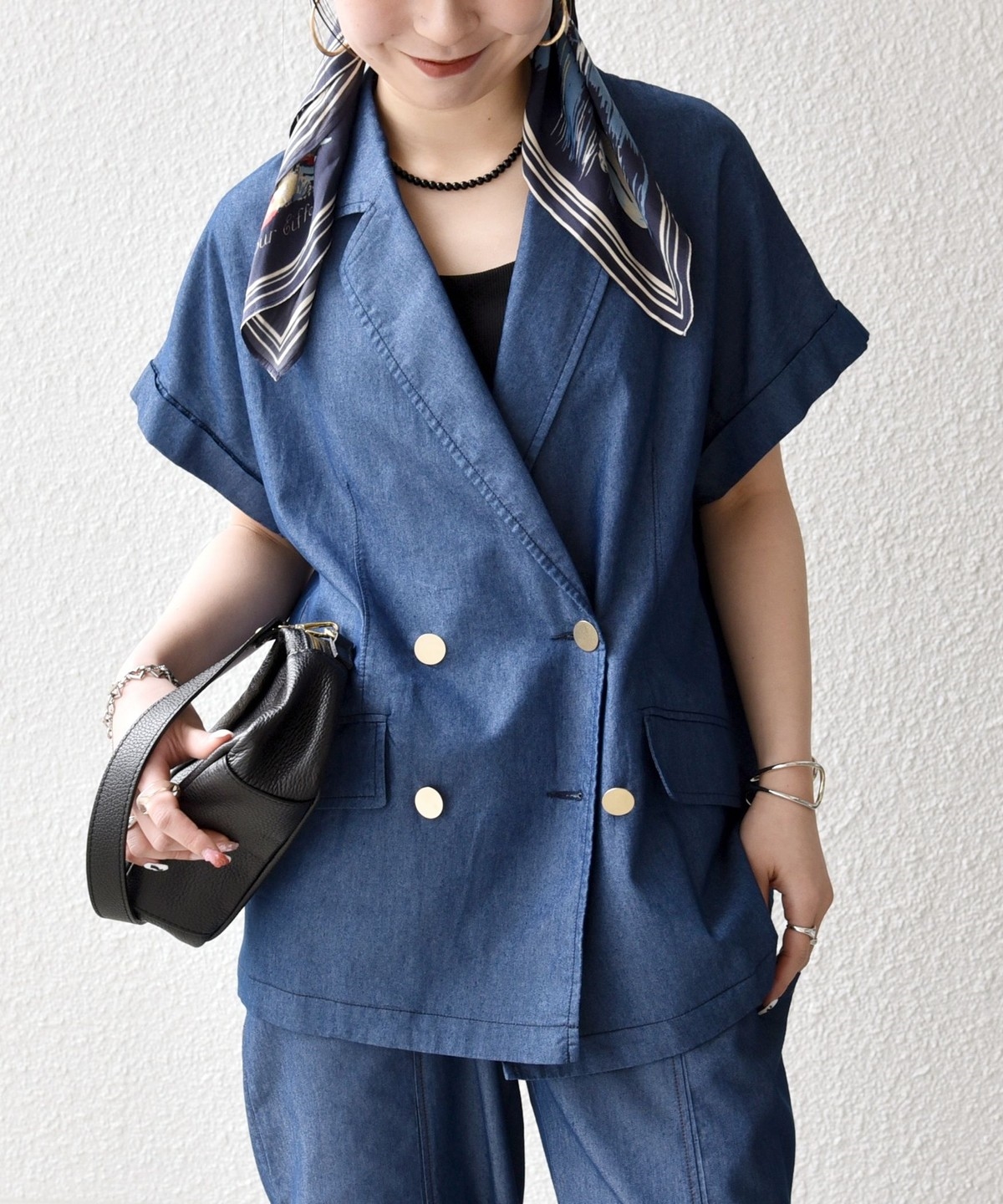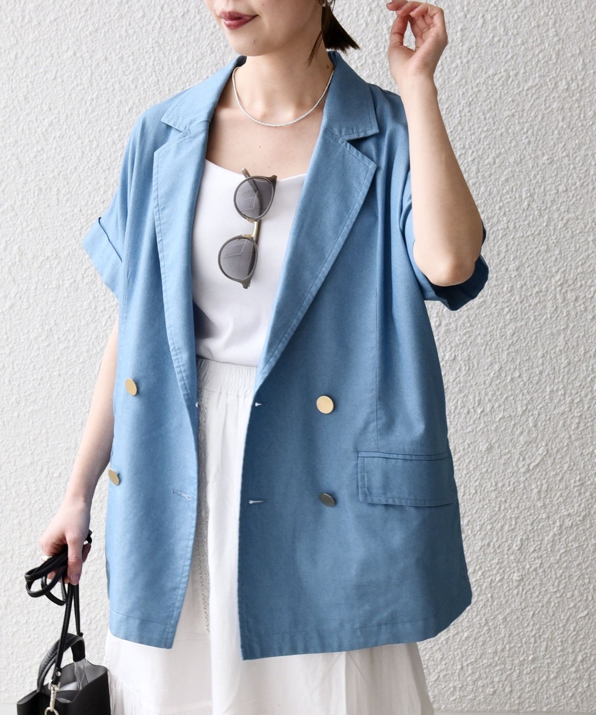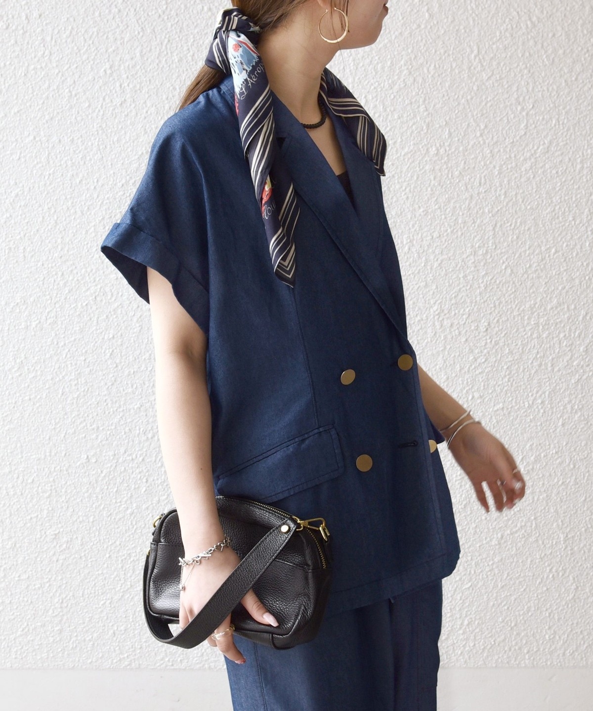 テーラードカラーとダブルボタン仕様で、カジュアルな素材ながらも程よいきちんと感をプラスしてくれるジャケット。