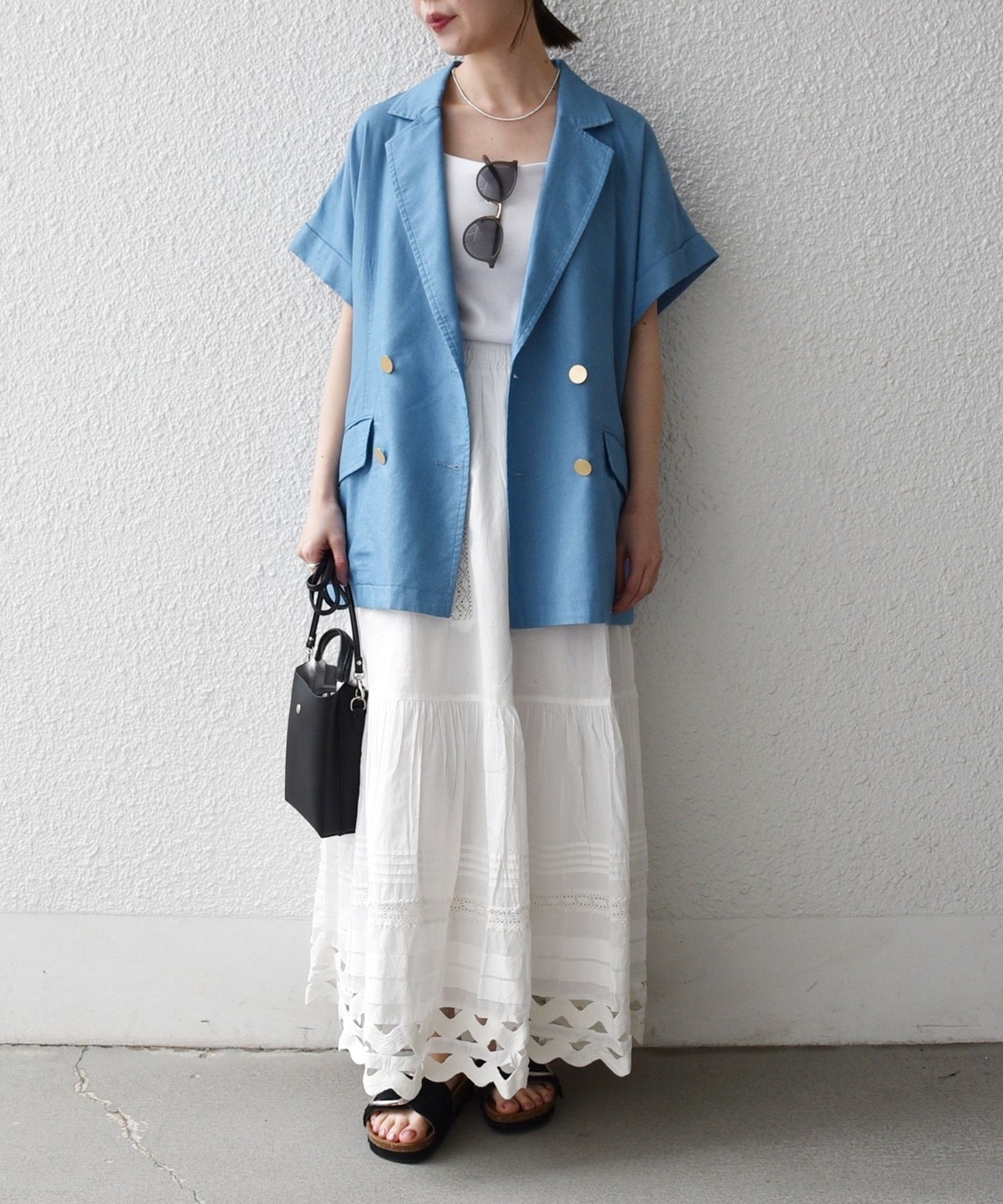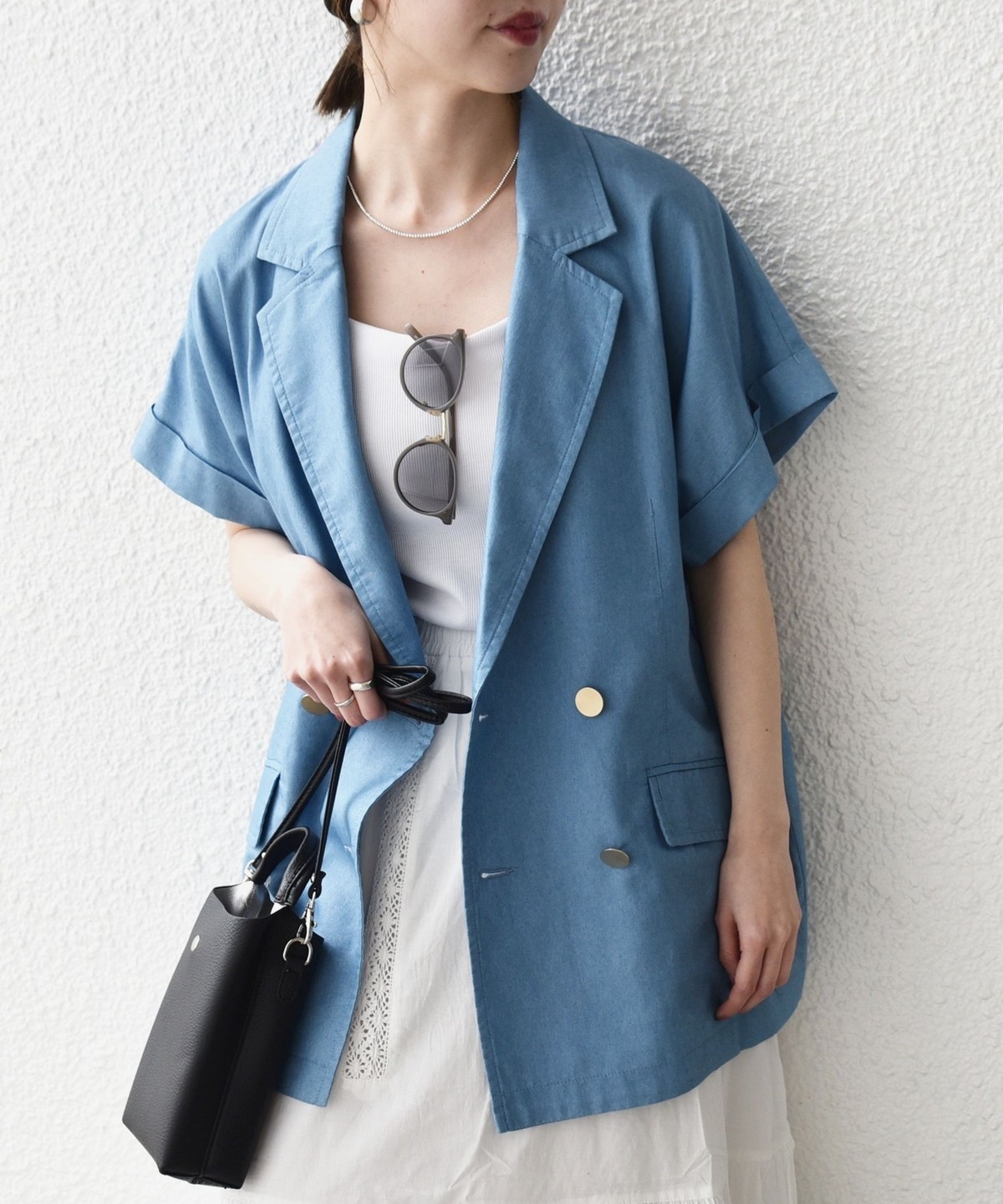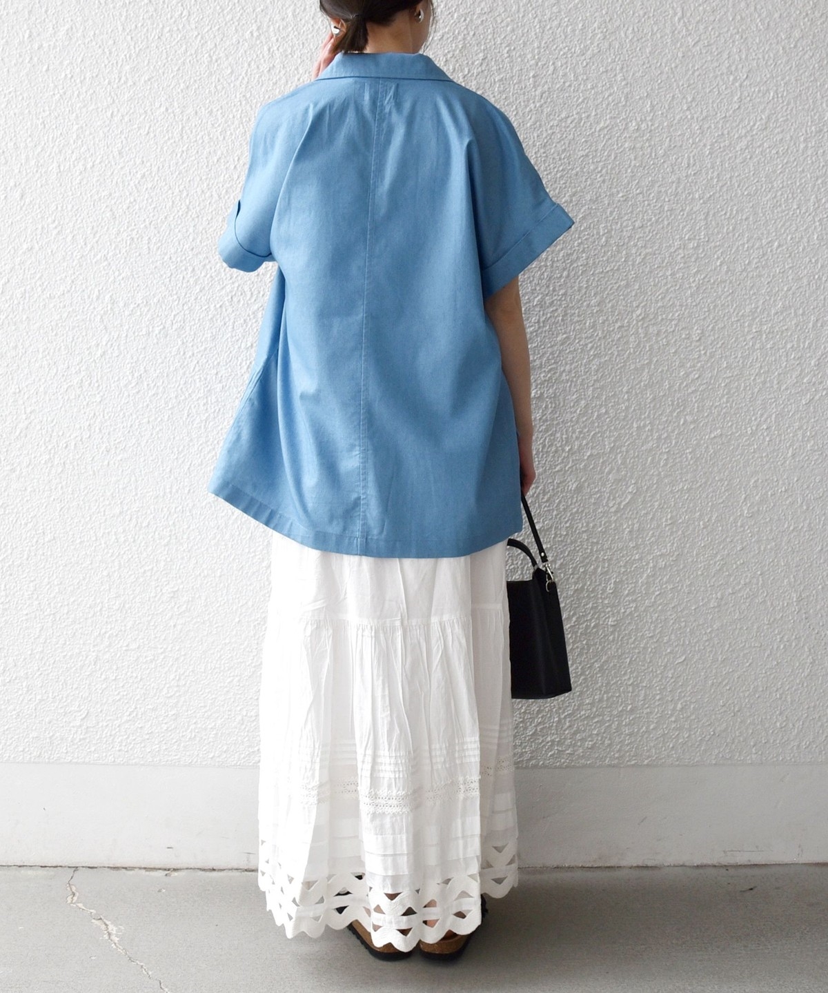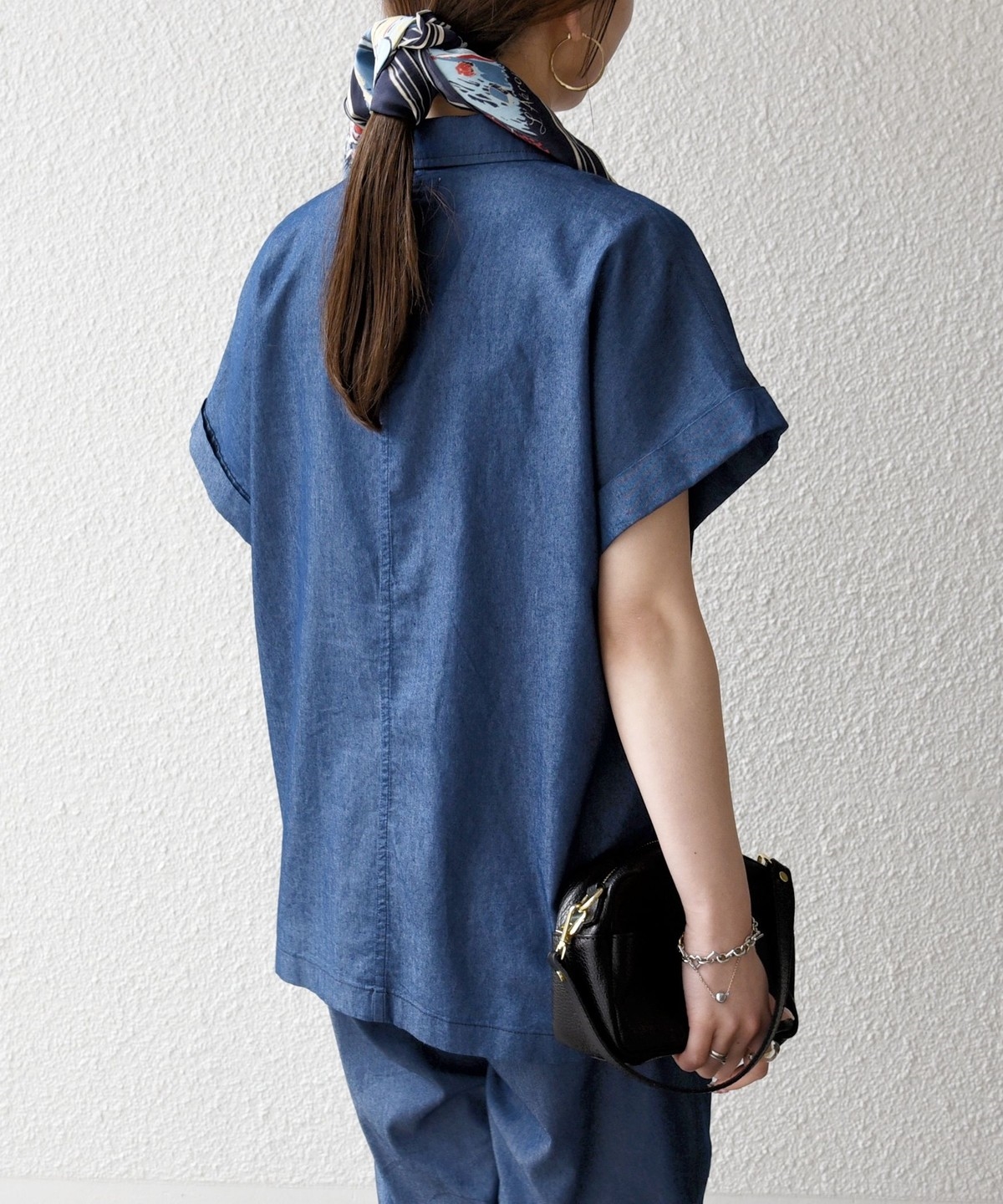 ロールアップ風の袖デザインが抜け感を演出し、軽やかな印象に仕上げています。