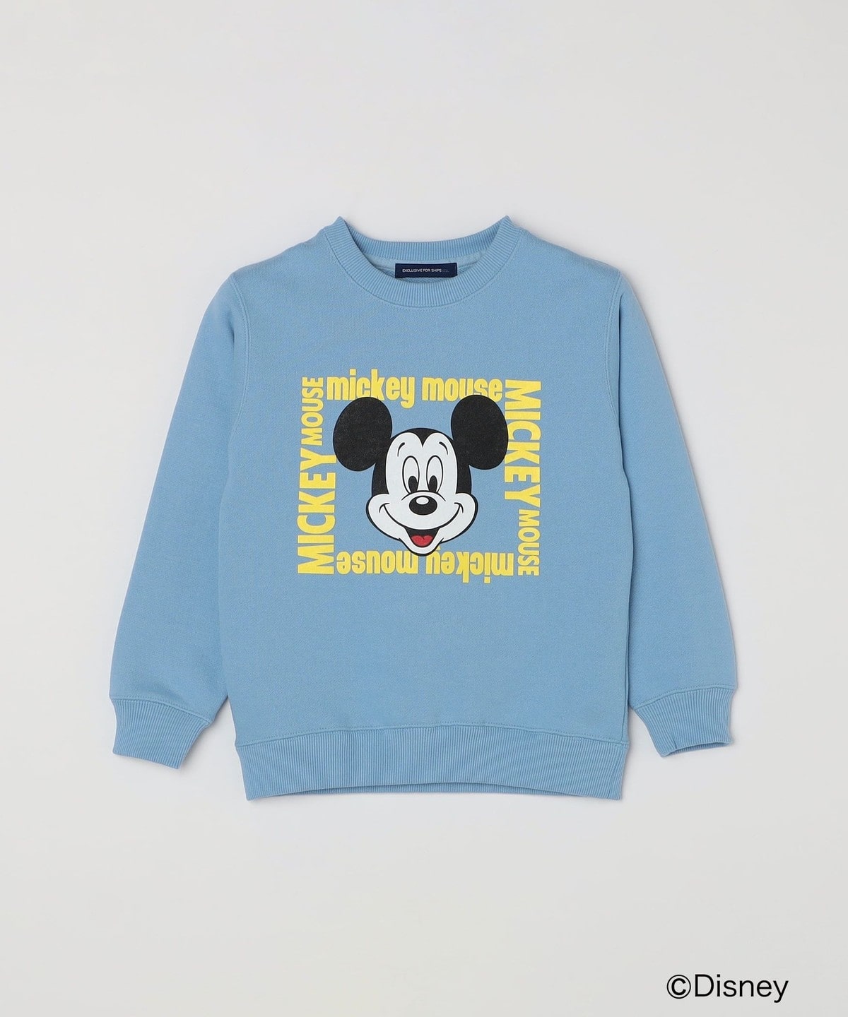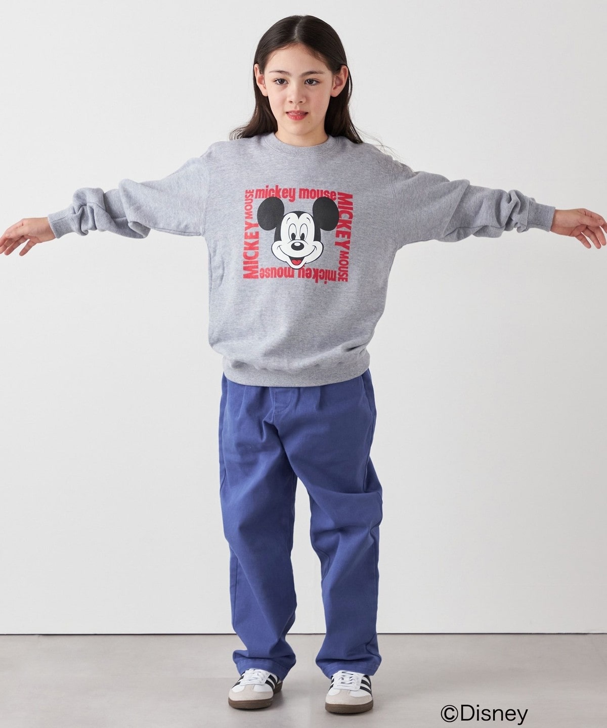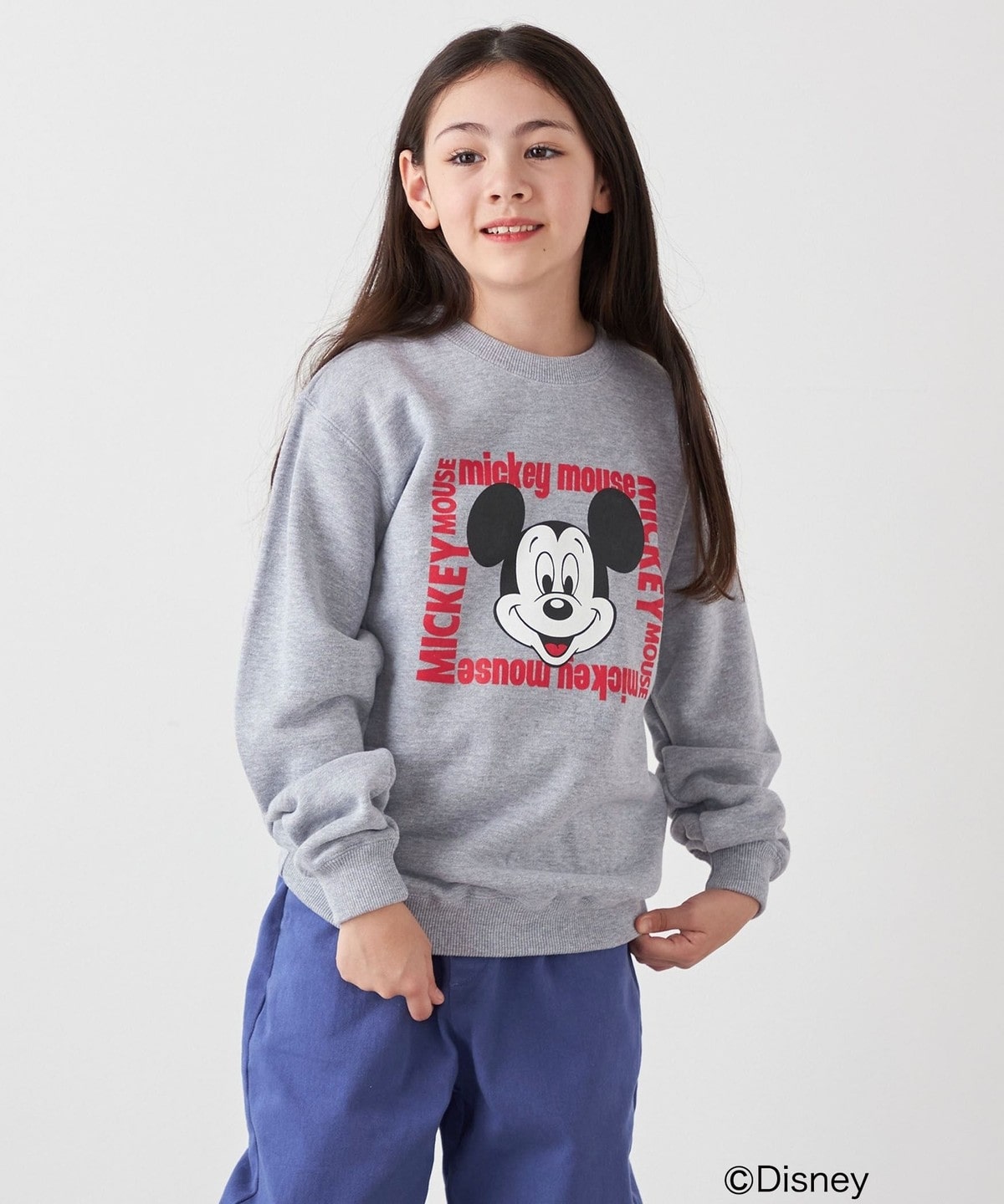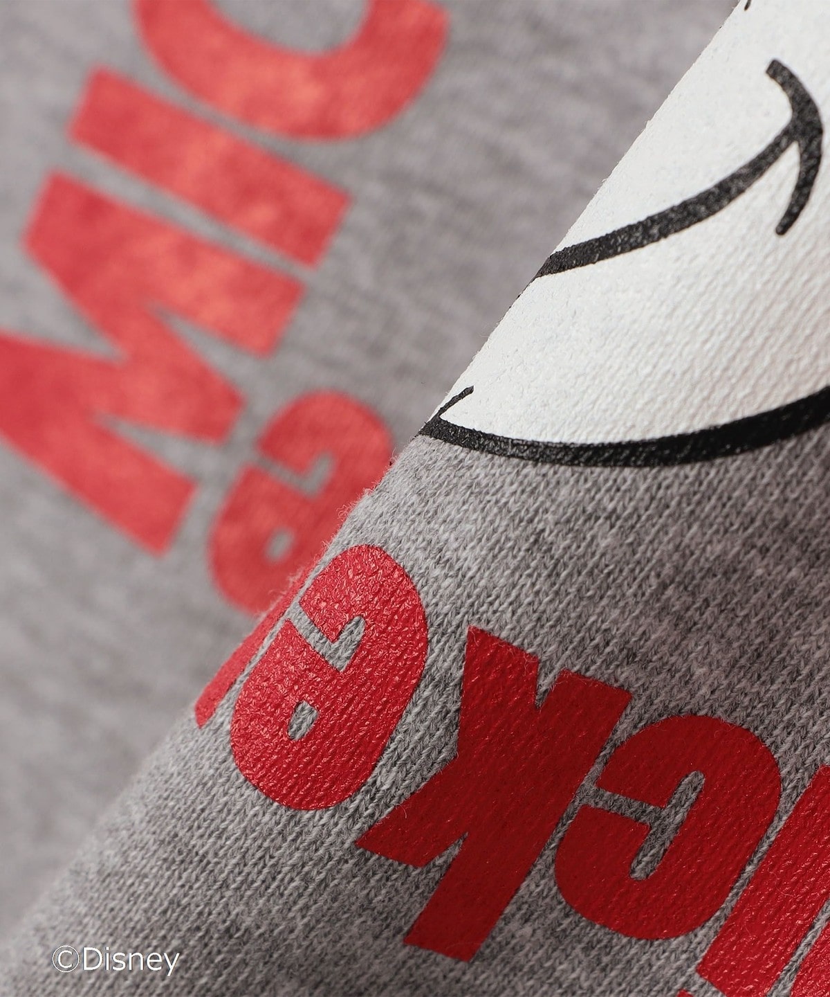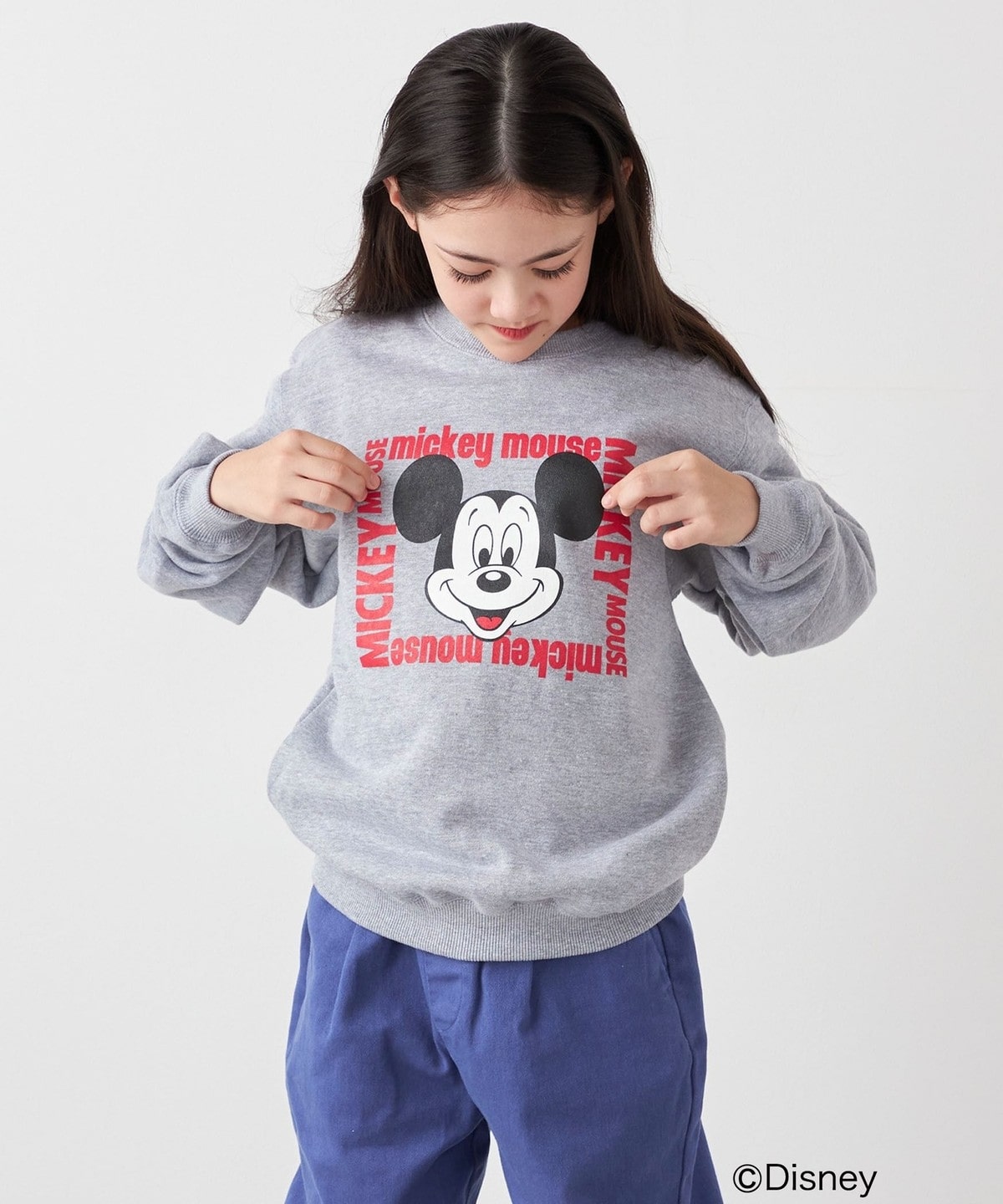 「ミッキーマウス」のグラフィックとネームをスクエアに施した別注スウェット。