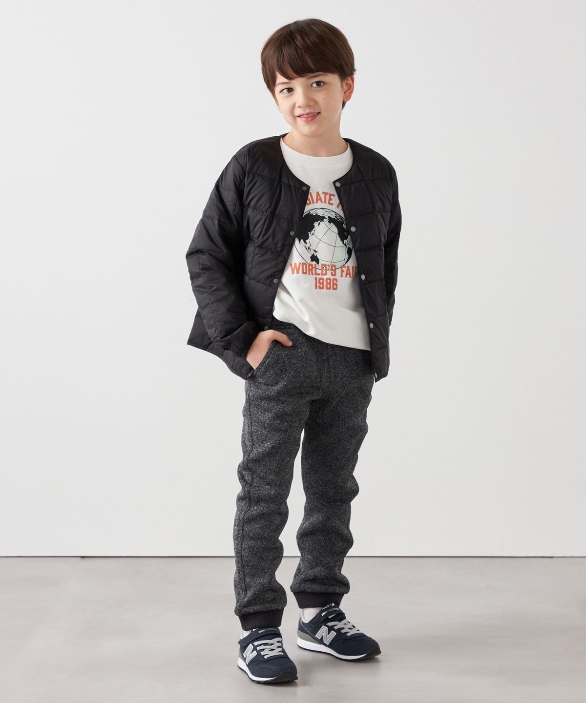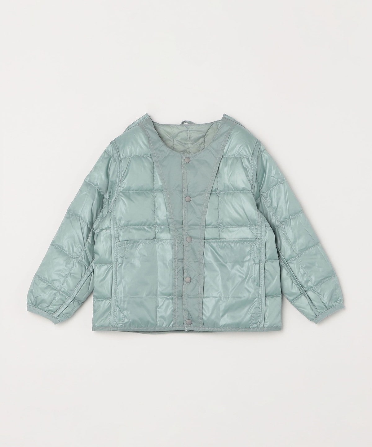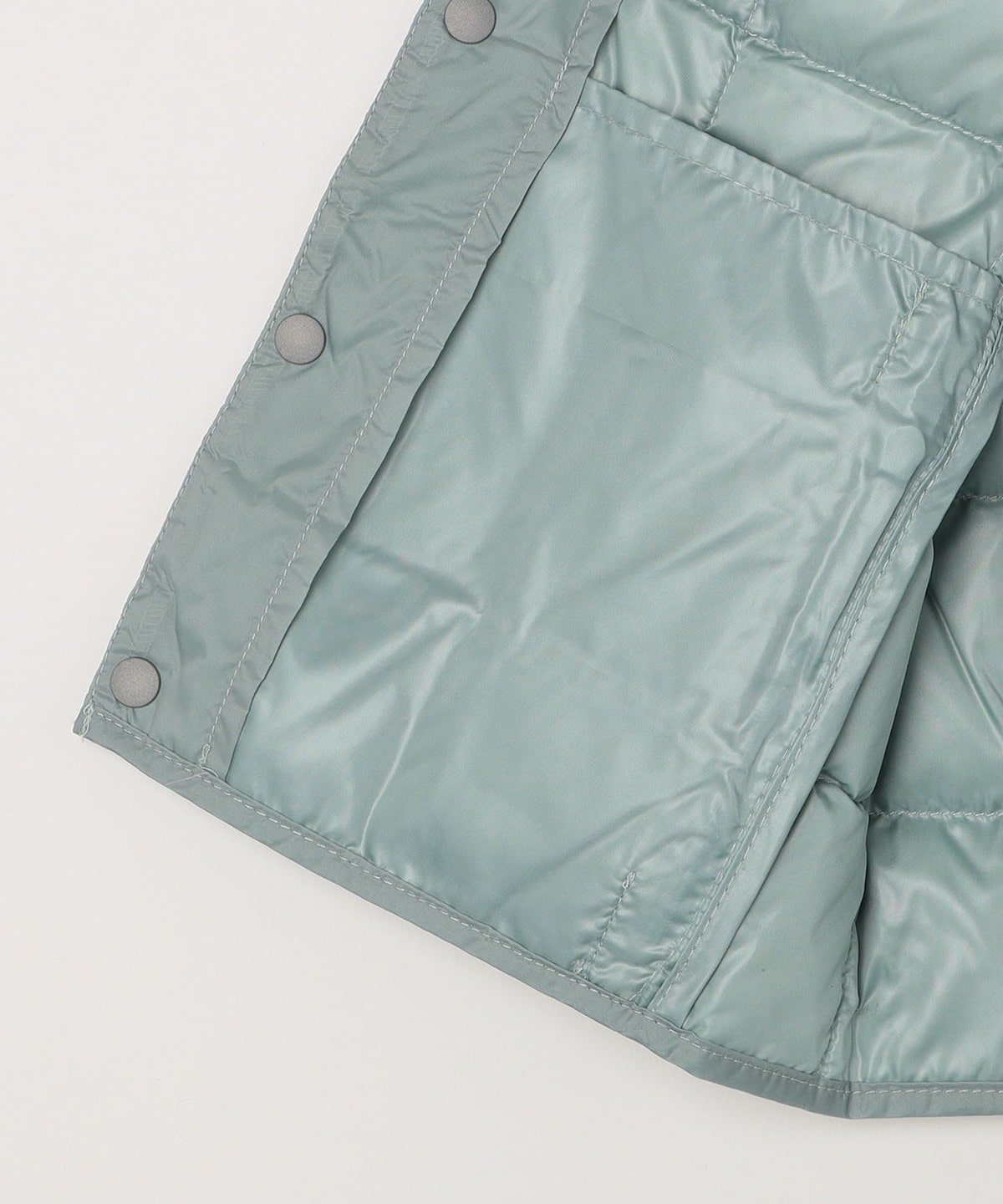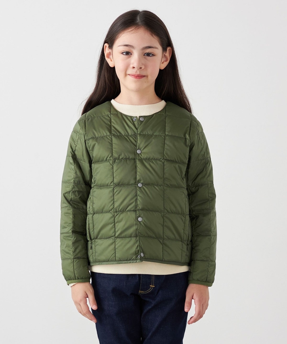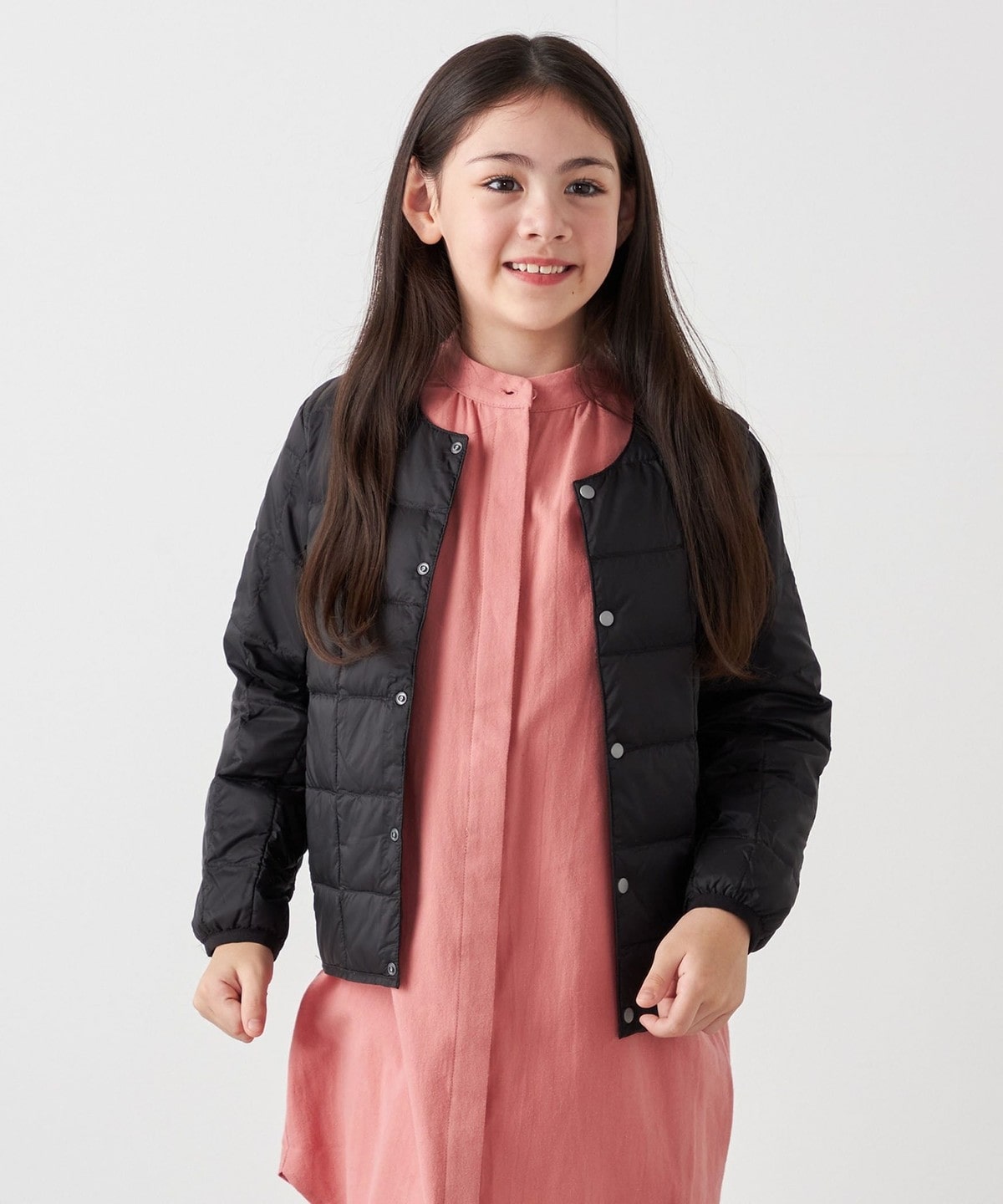 お子様に着させ易い前たてボタン仕様、首元にダウンが当たらないクルーネック仕様など、お子様が着用時にストレスを感じないよう工夫されています。