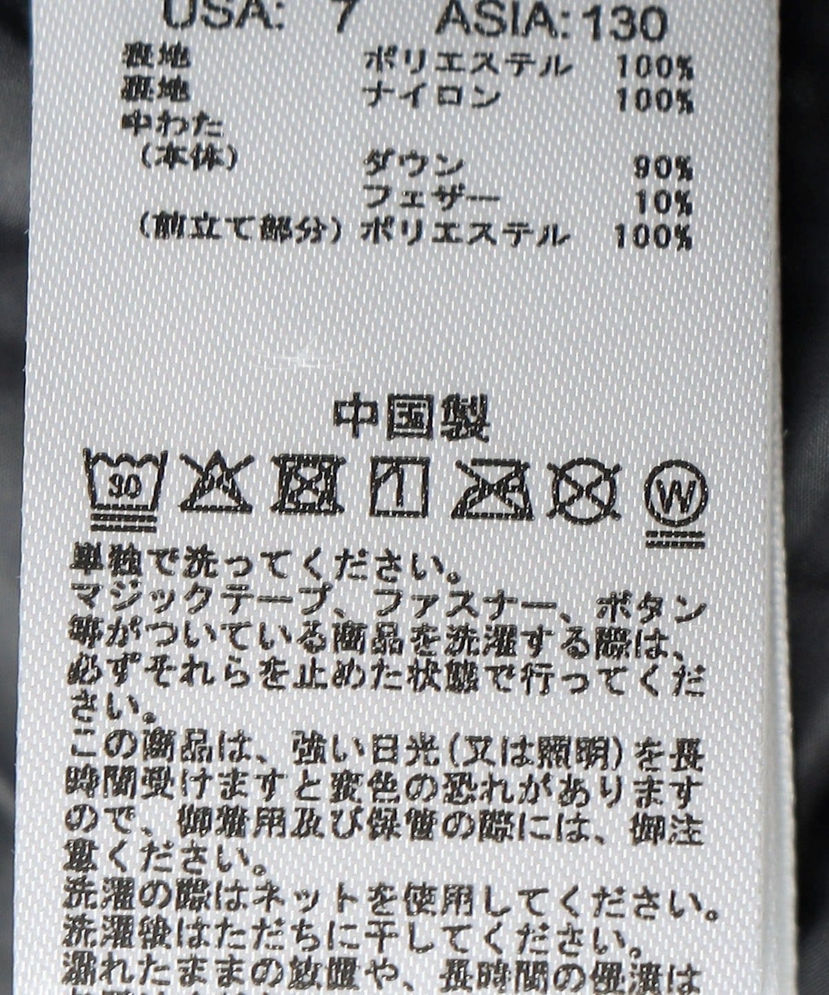 素材:表地: ポリエステル100% 裏地: ナイロン100% 中わた(本体): ダウン90%, フェザー10% (前立て部分): ポリエステル100%