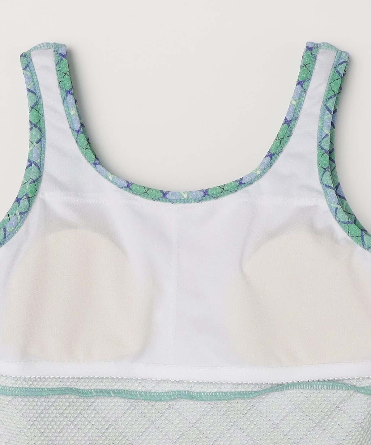 カバー力に優れたタンキニタイプの水着で、安心感のある着用感と可愛らしさを兼ね備えたデザイン。