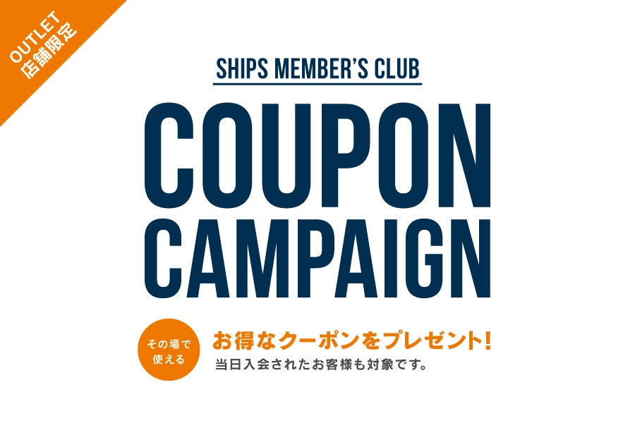 SHIPS OUTLET 店舗限定にて、SHIPS Member’s Club会員の皆様に一定金額以上のお買い物で、その場で使える最大2,000円オフのお得なクーポンをプレゼントいたします。
