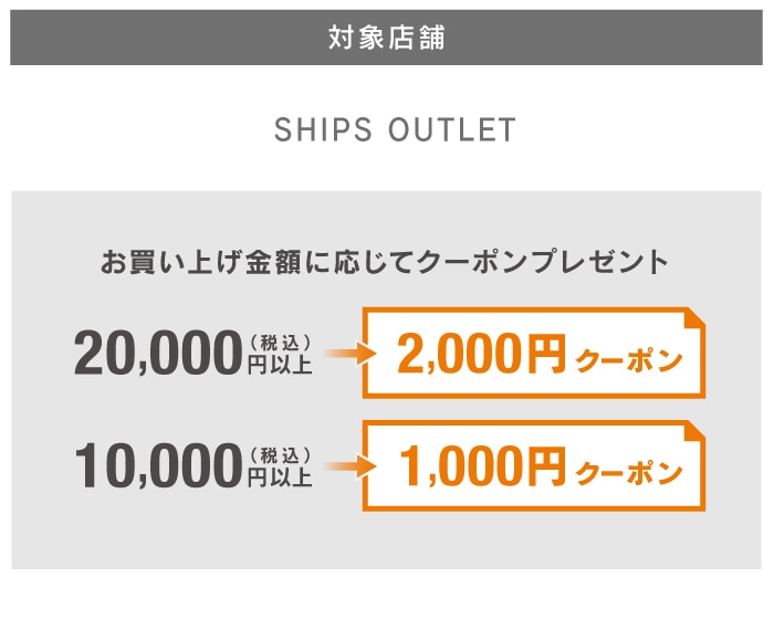 ※各クーポンはキャンペーン期間中、SHIPS OUTLET 店舗限定でそれぞれ1回限りご利用いただけます。