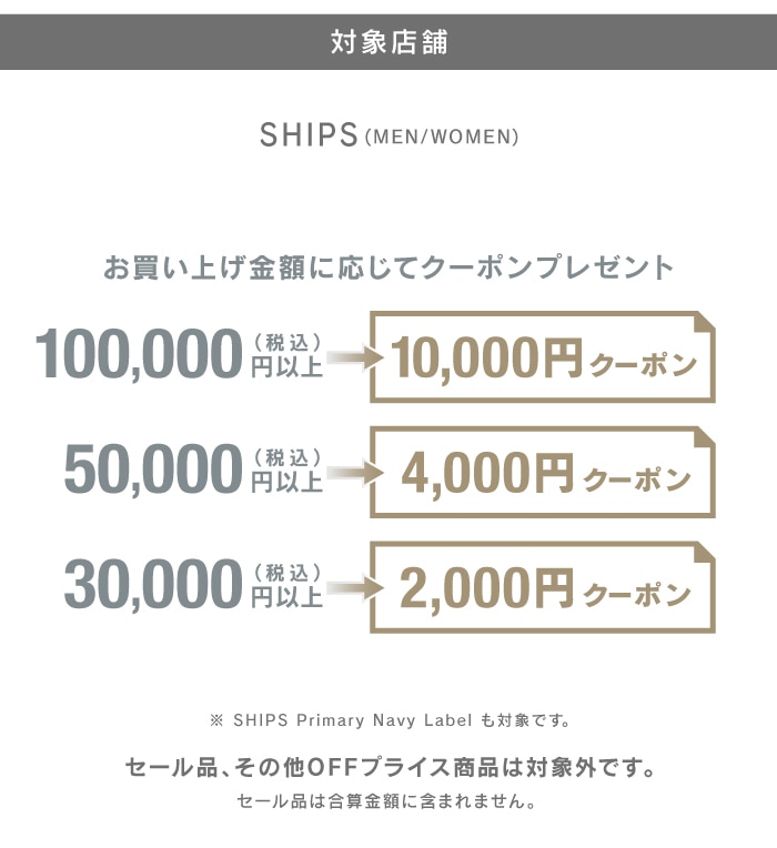 SHIPS Member’s Club会員の皆様へ、一定金額以上のお買い物で、その場で使える最大10,000円オフのお得なクーポンをプレゼントいたします。
