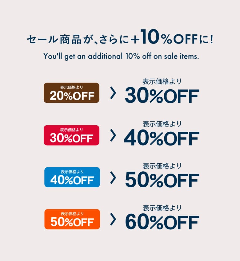 セール商品のオフ率が、セールシールの表示からさらに10%OFFになるお得な期間となります。