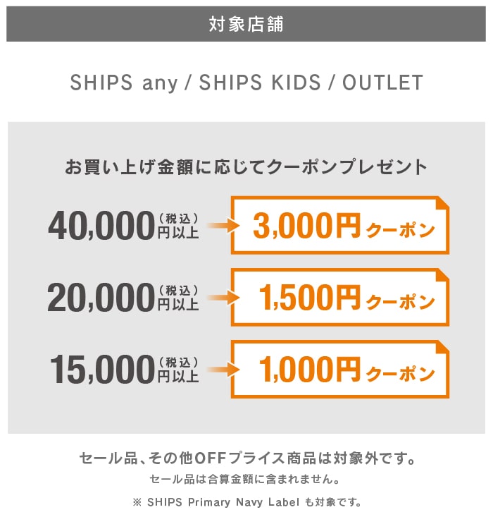 大変お得なこの機会に、SHIPS・SHIPS any・SHIPS KIDS・SHIPS OUTLET各店・SHIPS 公式オンラインショップでのお買い物をどうぞお楽しみください。