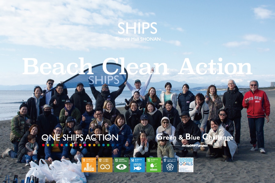 シップスは29年間、伊豆下田にて下田ライフセービングクラブのサポートと共にビーチクリーン活動を行っております。この度、「SHIPS Beach Clean Action」をSHIPSテラスモール湘南店のある神奈川県藤沢市辻堂海岸でもボランティア活動として有志にて始めました。このビーチクリーンはSDGsの一つである目標14、「海の豊かさを守ろう」を達成するだけでなく、現在のプラスチックごみ問題や衣料品問題などを考えていくきっかけにし、地域貢献の一環として実施しています。
