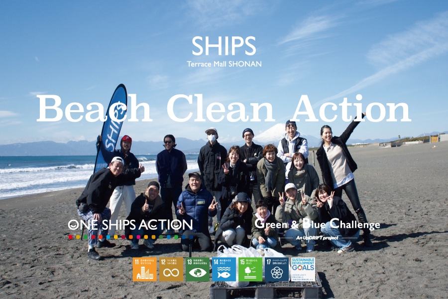 シップスは29年間、伊豆下田にて下田ライフセービングクラブのサポートと共にビーチクリーン活動をしています。SHIPS テラスモール湘南店のある神奈川県藤沢市辻堂海岸でもボランティア活動として「SHIPS Beach Clean Action」を有志にて行っています。このビーチクリーンはSDGsの一つである目標14「海の豊かさを守ろう」を達成するだけでなく、現在のプラスチックごみ問題や衣料品問題などを考えていくきっかけにし、地域貢献の一環として実施しています。