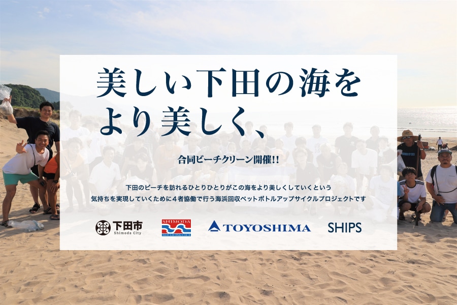 この取り組みは、美しい海の保全とその魅力を広く伝えることを目的とし、特定非営利活動法人下田ライフセービングクラブと株式会社シップス、が長年にわたり実施してきた海水浴客の方々が、自主的に参加しやすいビーチクリーン活動と、豊島株式会社の「漂着ペットボトルを回収し資源にする、UpDRIFT®(アップドリフト)」の仕組みを活かして、この4者が協働で実施しています。