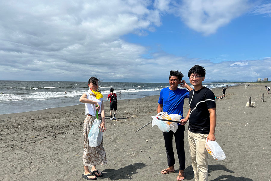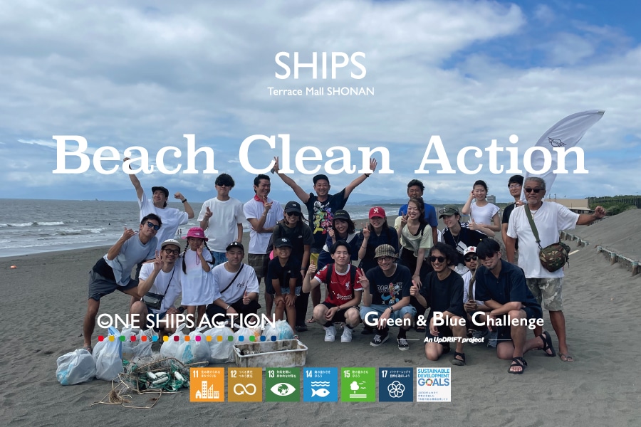 シップスは29年間、伊豆下田にて下田ライフセービングクラブのサポートと共にビーチクリーン活動をしています。SHIPS テラスモール湘南店のある神奈川県藤沢市辻堂海岸でもボランティア活動として「SHIPS Beach Clean Action」を有志にて行っています。このビーチクリーンはSDGsの一つである目標14、「海の豊かさを守ろう」を達成するだけでなく、現在のプラスチックごみ問題や衣料品問題などを考えていくきっかけにし、地域貢献の一環として実施しています。