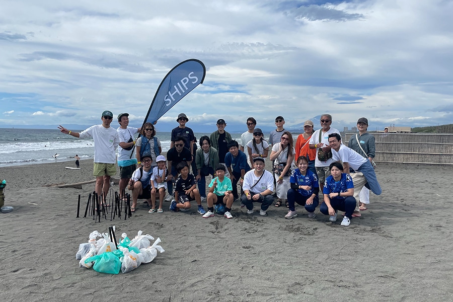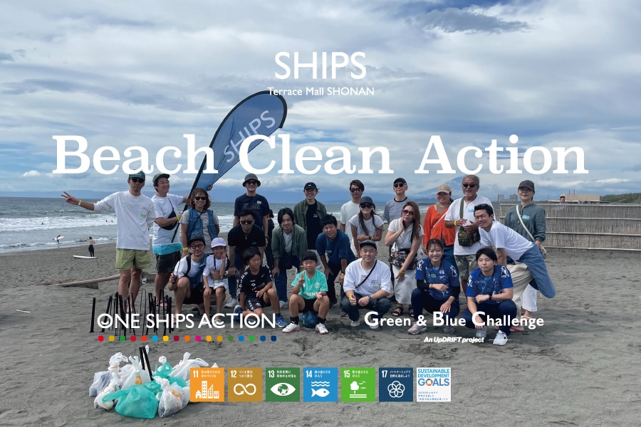 シップスは29年間、伊豆下田にて下田ライフセービングクラブのサポートと共にビーチクリーン活動をしています。SHIPS テラスモール湘南店のある神奈川県藤沢市辻堂海岸でもボランティア活動として「SHIPS Beach Clean Action」を有志にて行っています。このビーチクリーンはSDGsの一つである目標14、「海の豊かさを守ろう」を達成するだけでなく、現在のプラスチックごみ問題や衣料品問題などを考えていくきっかけにし、地域貢献の一環として実施しています。