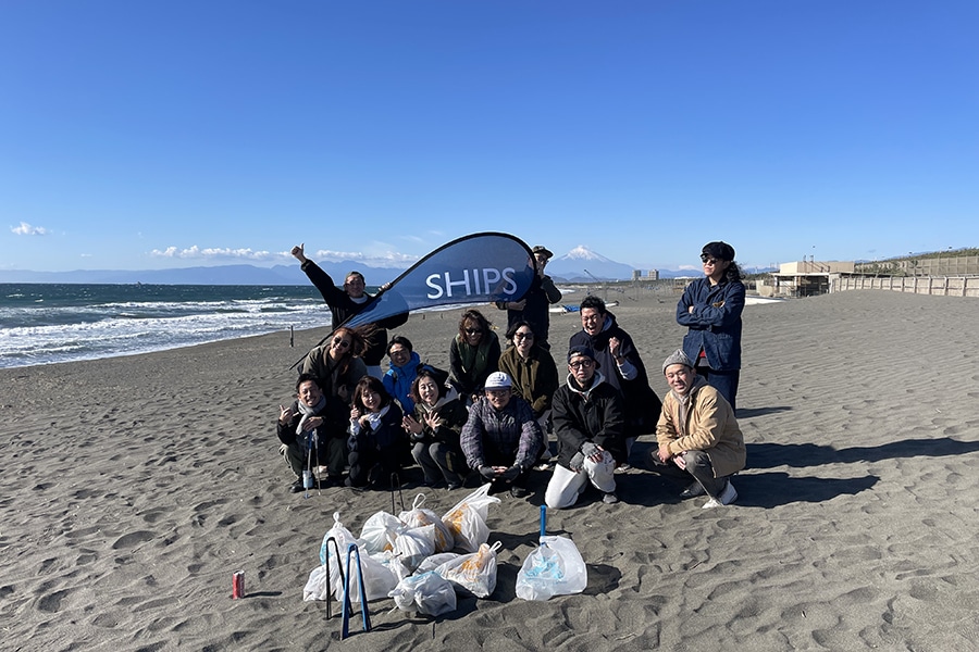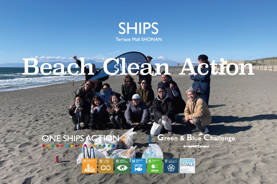 シップスは29年間、伊豆下田にて下田ライフセービングクラブのサポートと共にビーチクリーン活動をしています。SHIPS テラスモール湘南店のある神奈川県藤沢市辻堂海岸でもボランティア活動として「SHIPS Beach Clean Action」を有志にて行っています。このビーチクリーンはSDGsの一つである目標14、「海の豊かさを守ろう」を達成するだけでなく、現在のプラスチックごみ問題や衣料品問題などを考えていくきっかけにし、地域貢献の一環として実施しています。