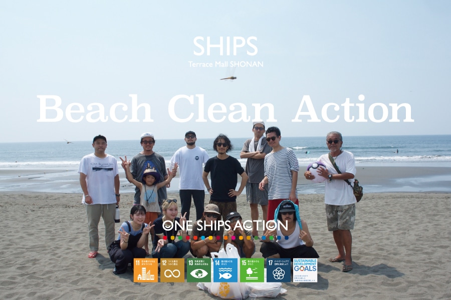 シップスでは30年以上にわたり、伊豆下田での下田ライフセービングクラブと連携したビーチクリーン活動を継続しています。この活動を広げる形で、「SHIPS Beach Clean Action」をSHIPSテラスモール湘南店のある神奈川県藤沢市・辻堂海岸にてボランティア活動として実施しています。SDGs目標14「海の豊かさを守ろう」の達成に貢献しながら、プラスチックごみや衣料品問題について考えるきっかけとなる地域貢献活動です。