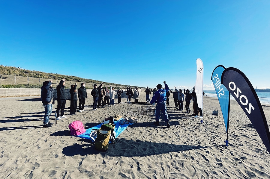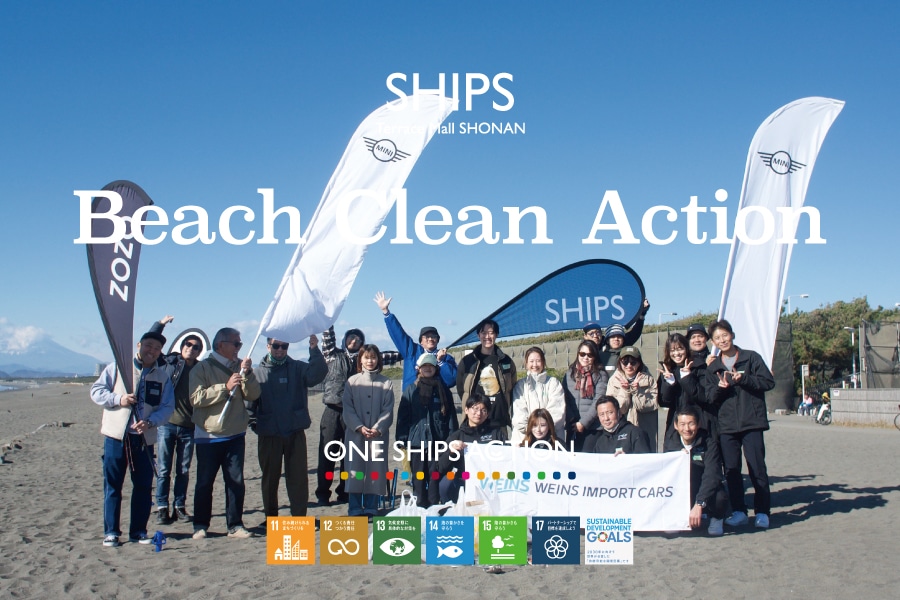 シップスでは30年以上にわたり、伊豆下田での下田ライフセービングクラブと連携したビーチクリーン活動を継続しています。この活動を広げる形で、「SHIPS Beach Clean Action」をSHIPS テラスモール湘南店のある神奈川県藤沢市・辻堂海岸にてボランティア活動として実施しています。SDGs目標14「海の豊かさを守ろう」の達成に貢献しながら、プラスチックごみや衣料品問題について考えるきっかけとなる地域貢献活動です。