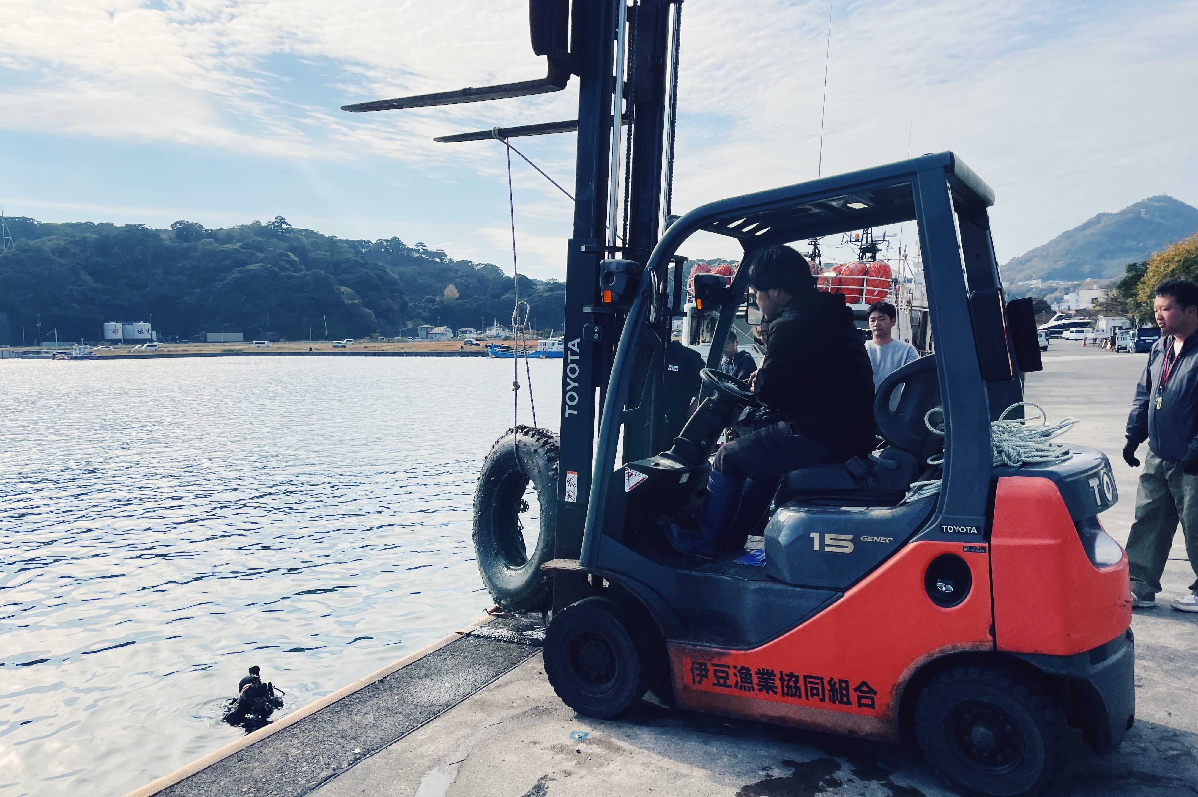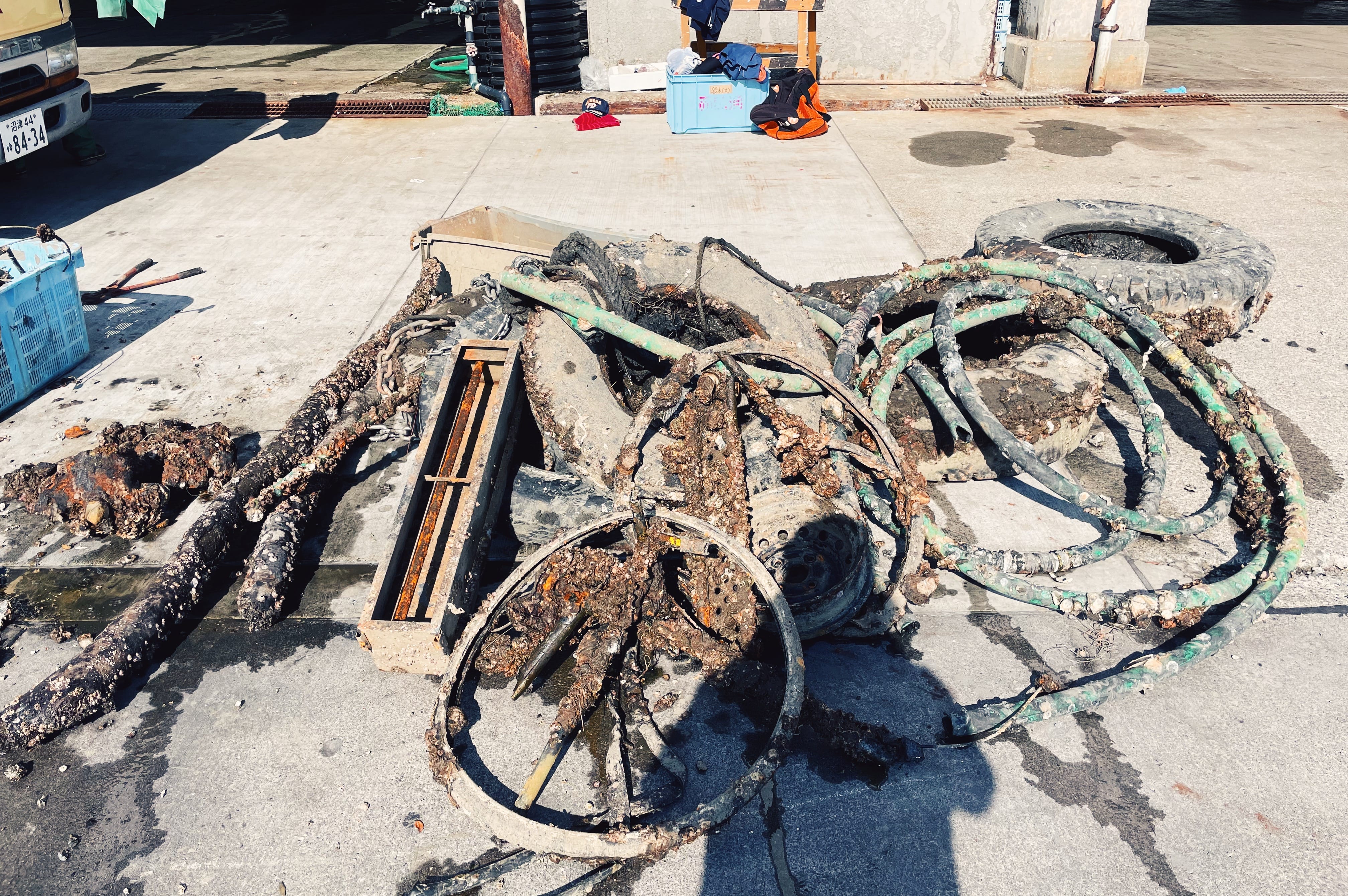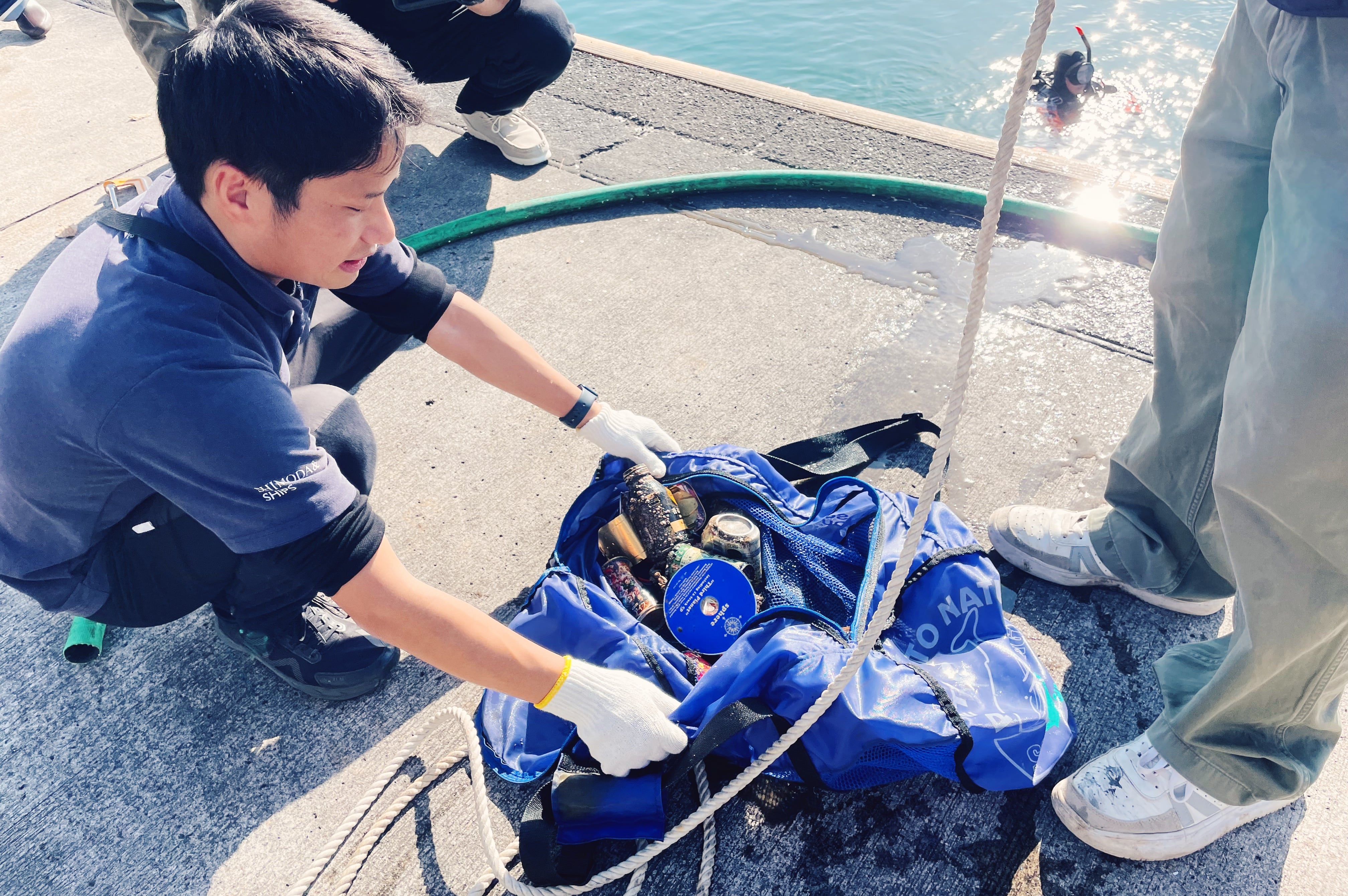 当日は天候にも恵まれ、穏やかな環境のもとで作業が進められました。海中から引き上げられたごみは、長年堆積したヘドロを含み非常に重く、フォークリフトを使用して陸揚げされる場面もありました。ダイバーの方々からは、海中では少し動かすだけで視界が悪化し、ごみにロープを掛ける作業自体が非常に困難であるというお話も伺い、海中清掃の過酷さと重要性を改めて実感しました。