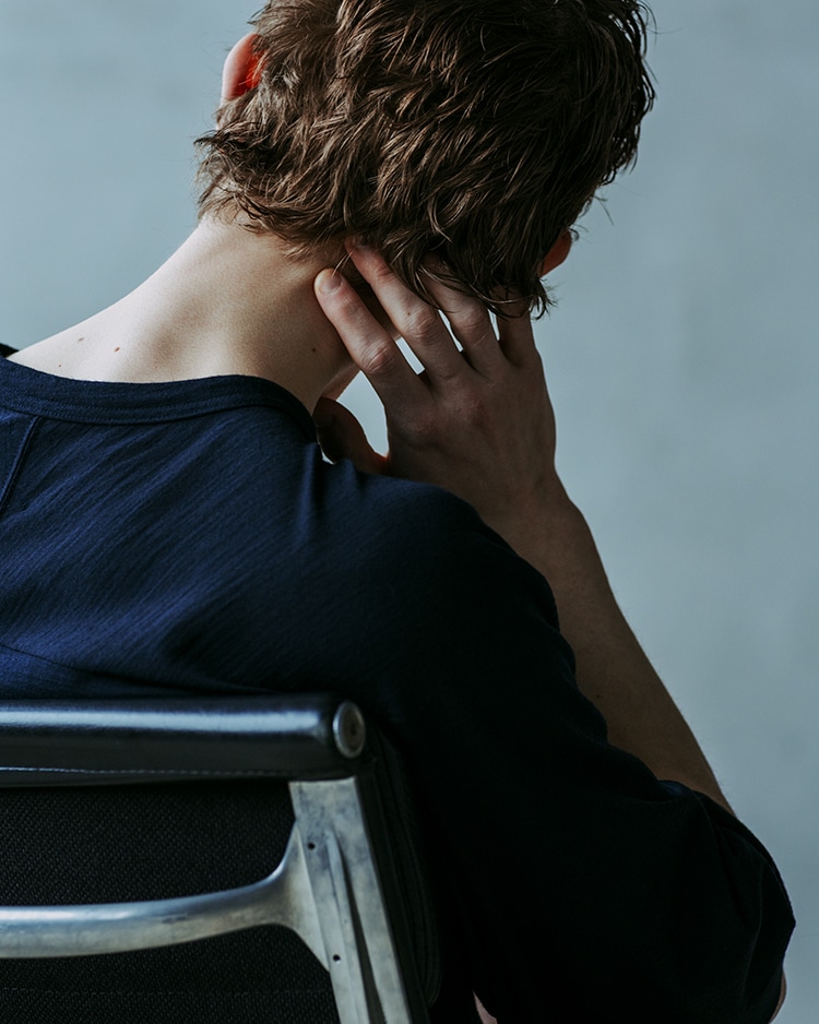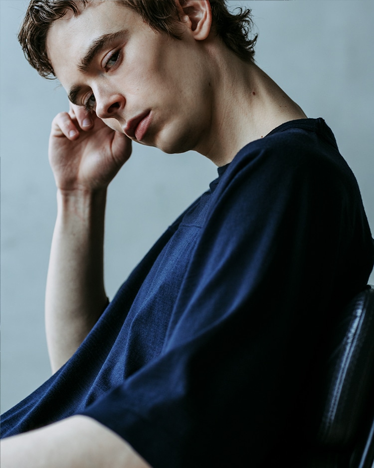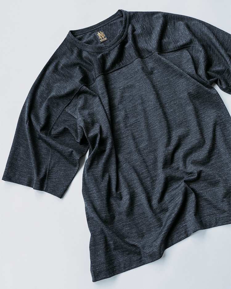 この生地を使って、古着のフットボールTシャツの形をベースに別注しました。古着には存在しないウール100%のフットボールTシャツは、身幅もBOXシルエットに仕上げる事で軽やかに着用する事が可能になりました。