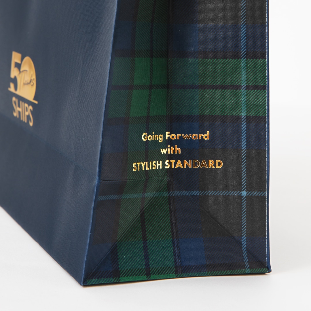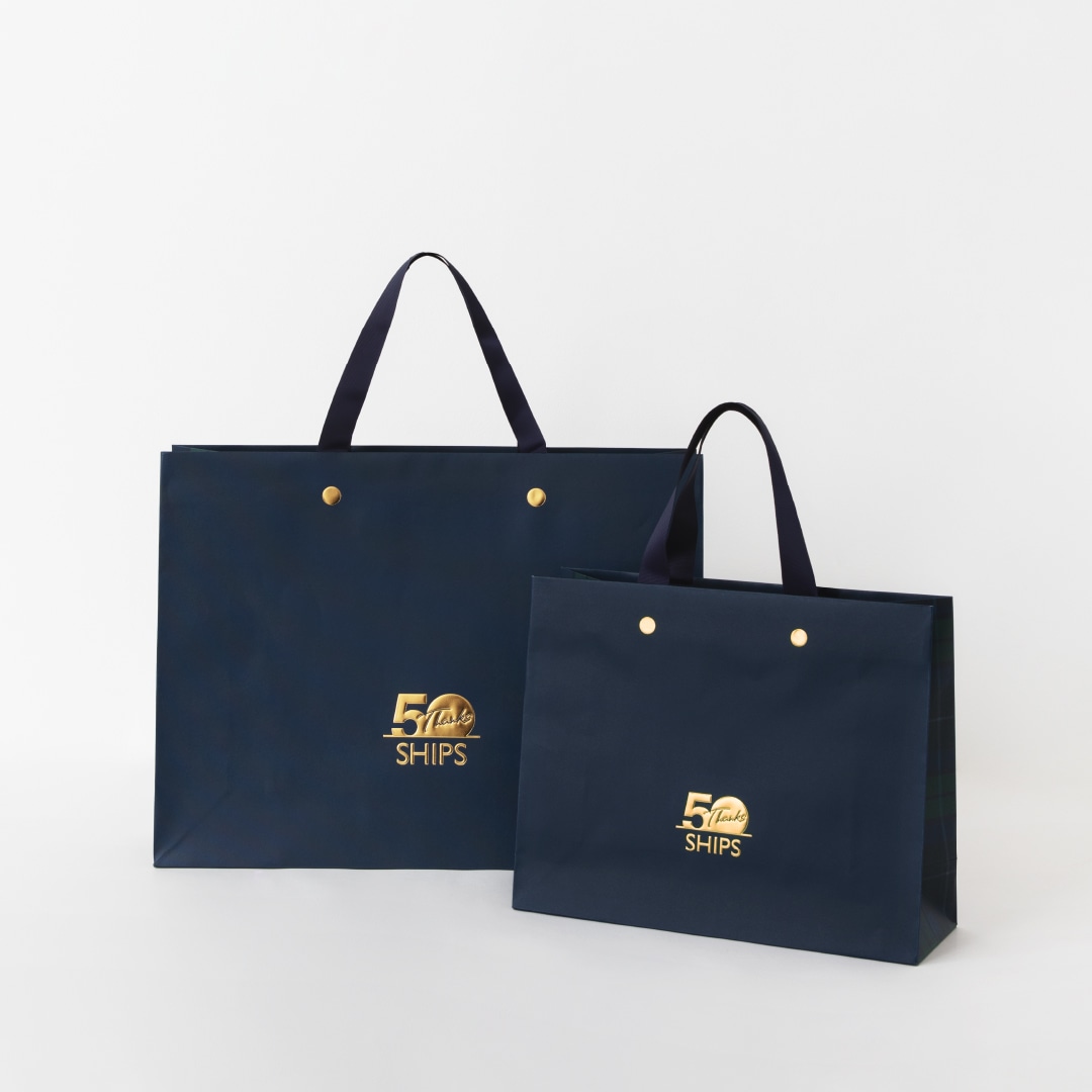 コーポレートカラーの「ネイビー」と、設立50年を記念して誕生したハウスタータン「SHIPS」を組み合わせた、50周年のためだけの特別なデザインです。節目の年を彩る、今だけしか手に入らない限定ショッパーをぜひお楽しみください。