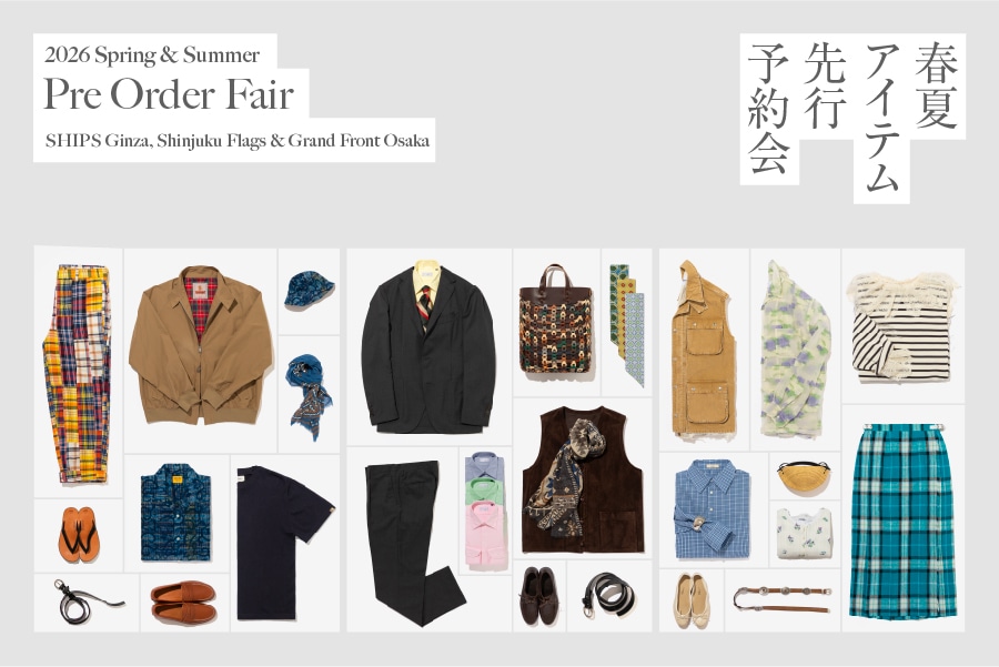 2026年春夏シーズンの立ち上がりを迎えるにあたり、SHIPS 銀座店・新宿フラッグス店・グランフロント大阪店にてメンズ・ウィメンズ最新アイテムをいち早くご覧いただける春夏アイテム先行予約会「2026 Spring & Summer Pre Order Fair」を開催いたします。