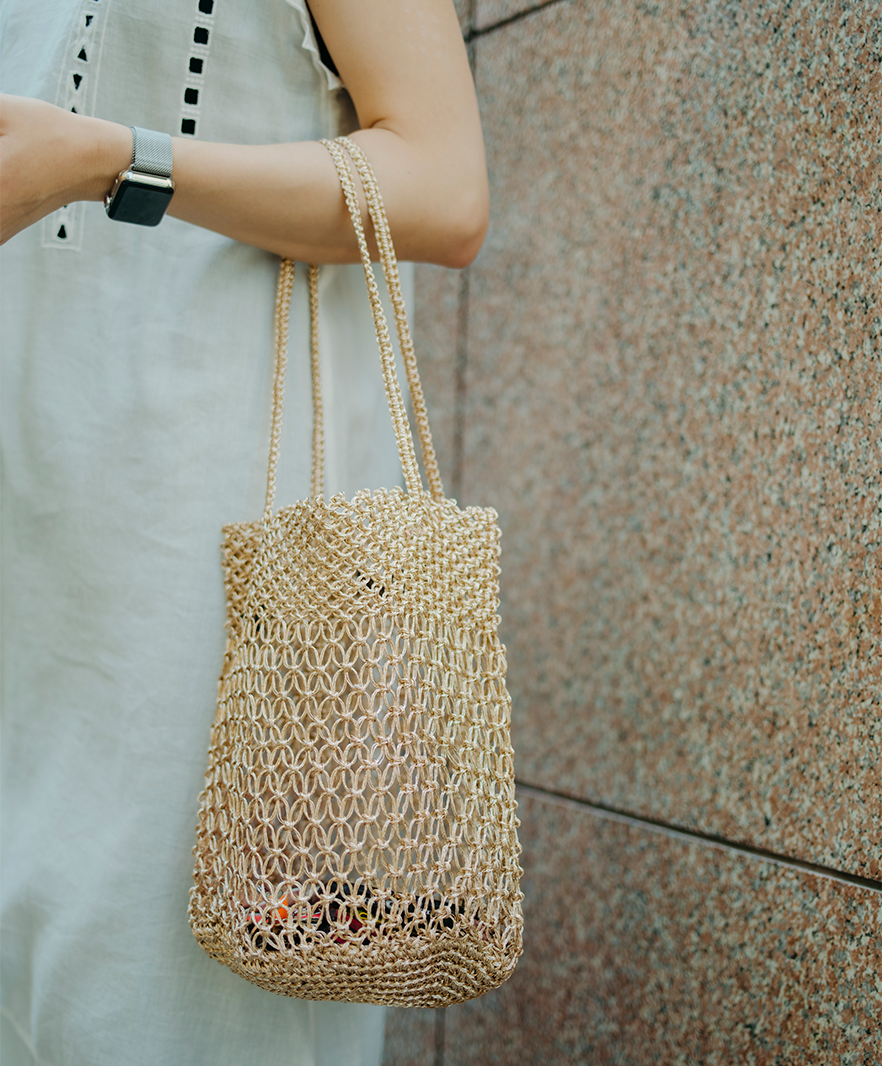 ふんわり軽やかな質感のワンピースに合わせ、バッグも中身が透けて見えるネット素材をチョイス。