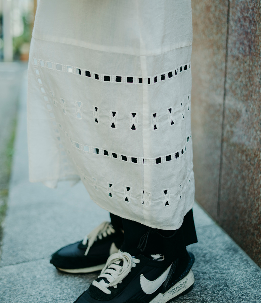 今年らしいロング丈に、裾にかけてふんわり広がるシルエットがリラックスしつつも女性らしい雰囲気。「ブラックパンツとスニーカーを合わせてカジュアルに、私らしく」とtotaniさん。ペチコート付きなので1枚でも着られます。