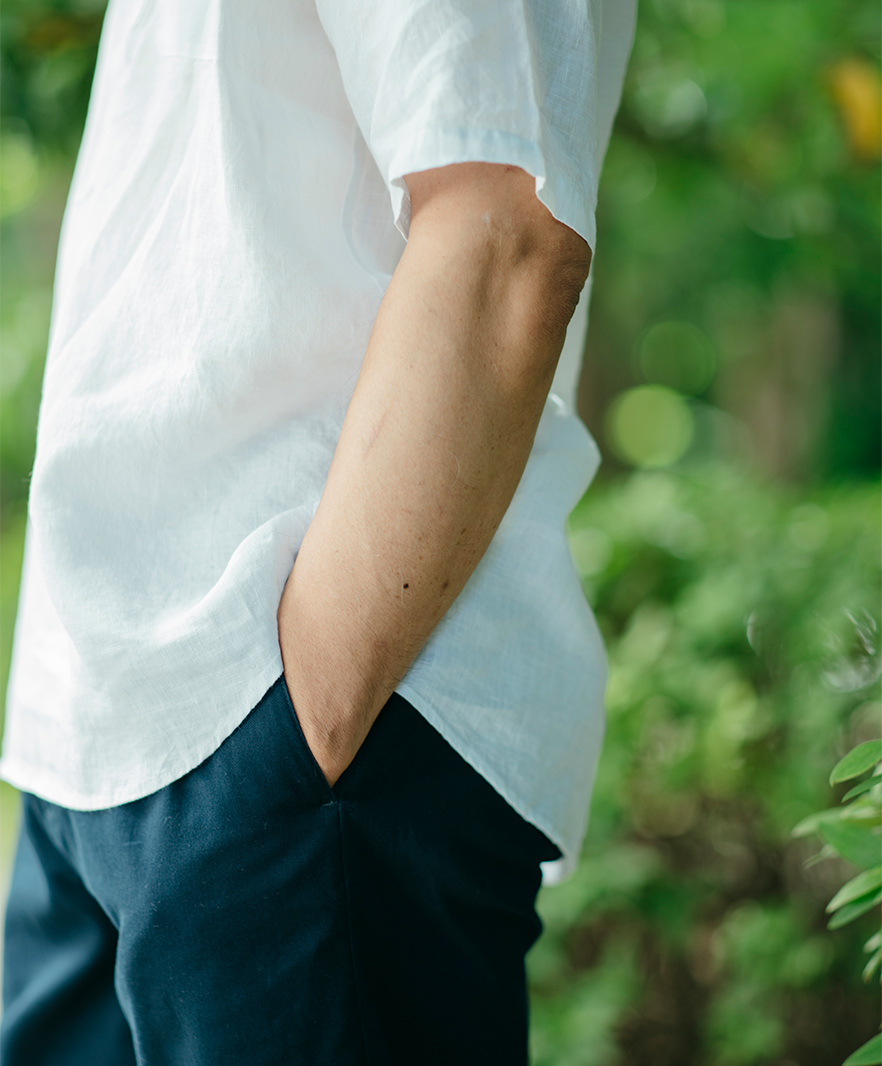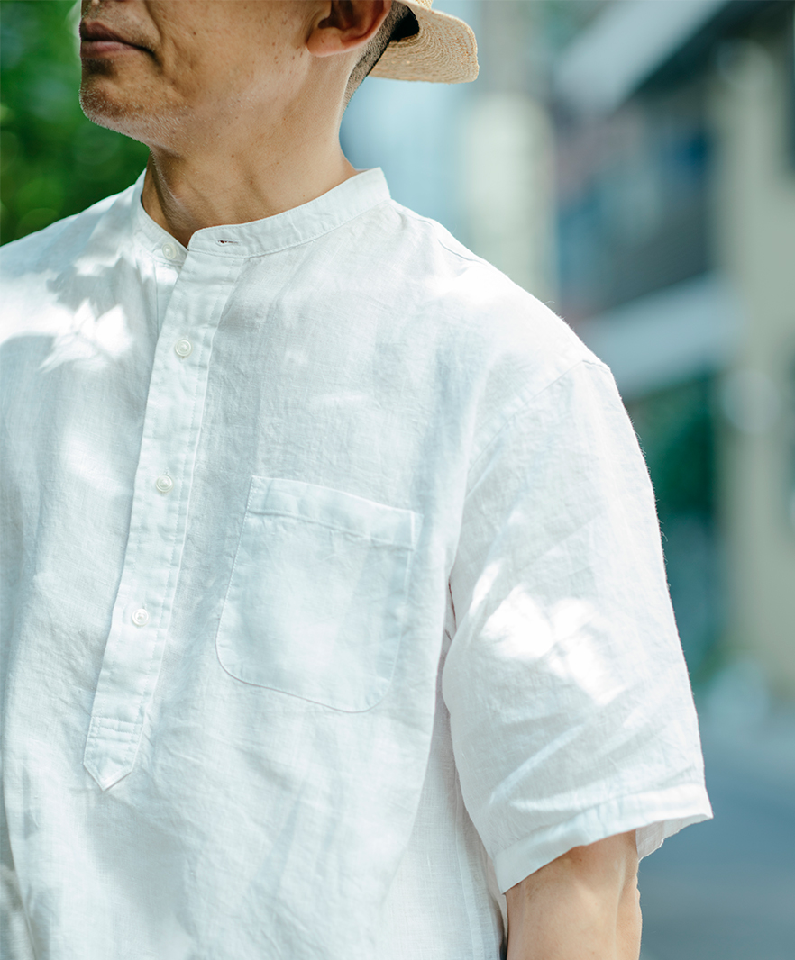 首元がすっきりと見えるバンドカラーシャツ。麻100%素材なので、見た目も着心地も涼しく快適。