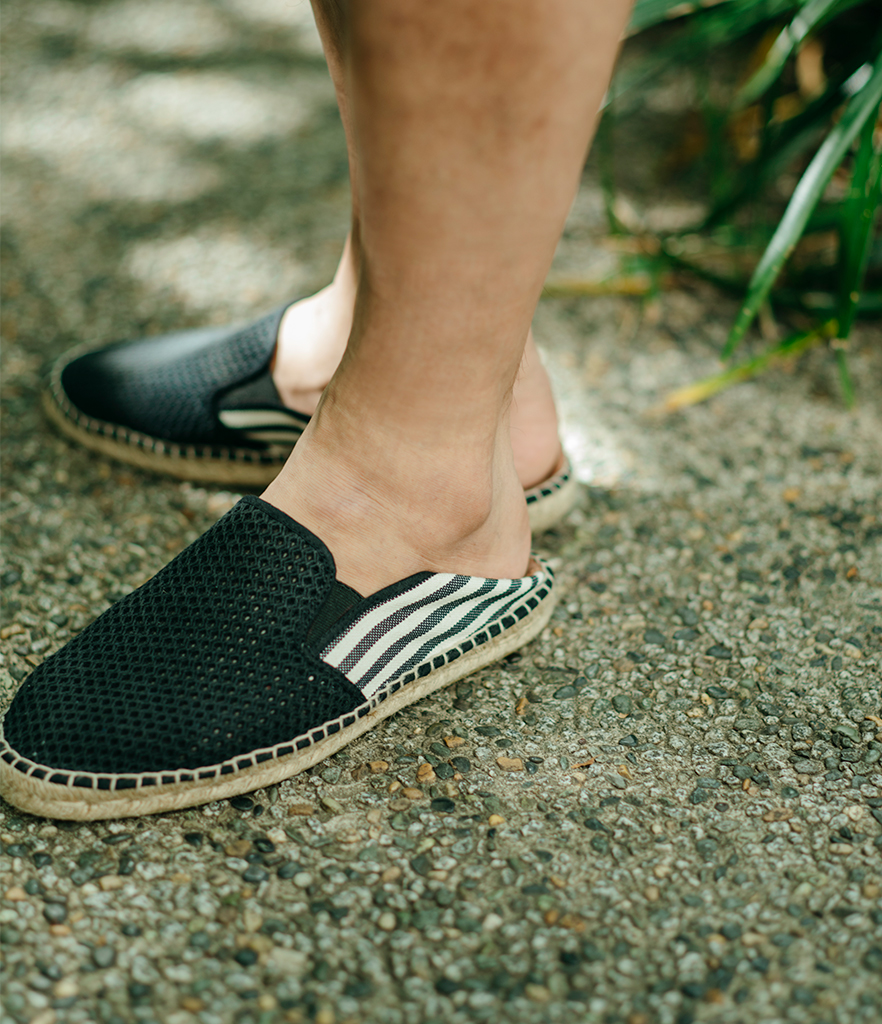 紺無地とボーダーのバイカラーのエスパドリーユは、コーディネートのアクセントに重宝。「メンズの夏アイテムは着るものが限られますが、エスパドリーユはそのまま履いたり、ラフにかかとを踏んだりとコーディネートに幅が出ていいですね」と新原さん。