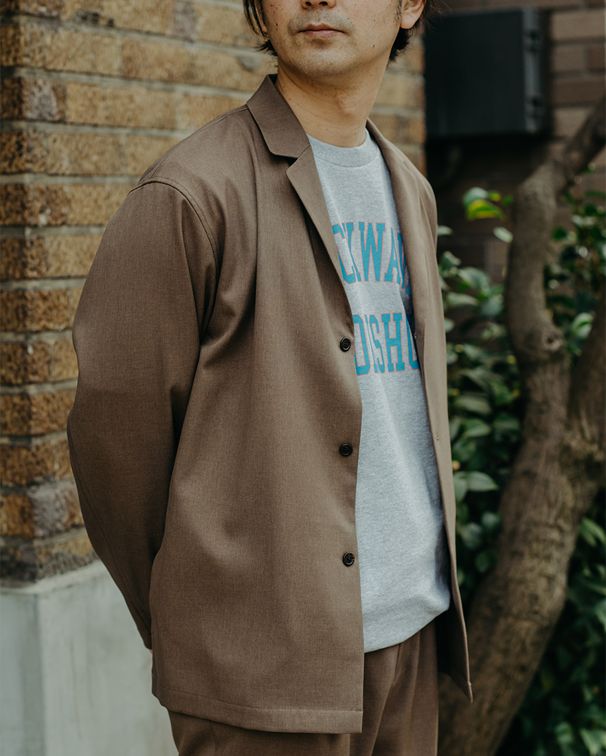 ゆったりとしたボックスシルエットのジャケット。「中にはラクちんなTシャツを合わせてみました。あまりかっちりしすぎないスタイルが好きです」。